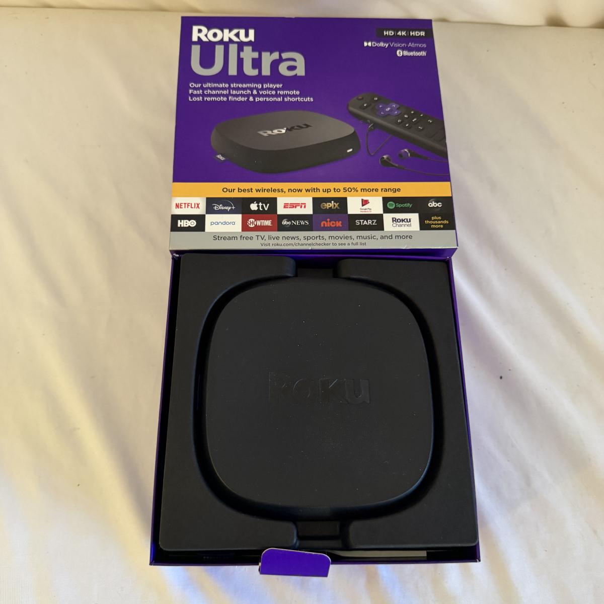 Lot includes a Logitech remote and a Roku Ultra. Both items powered on when plugged in.