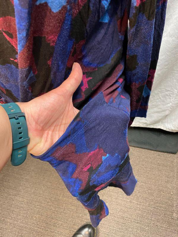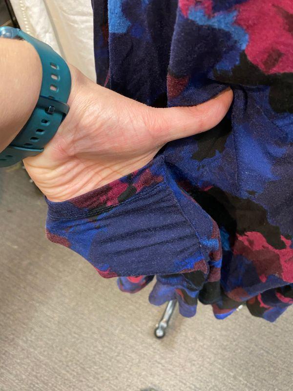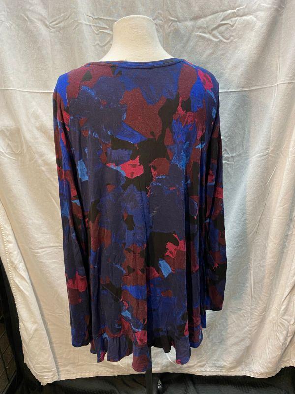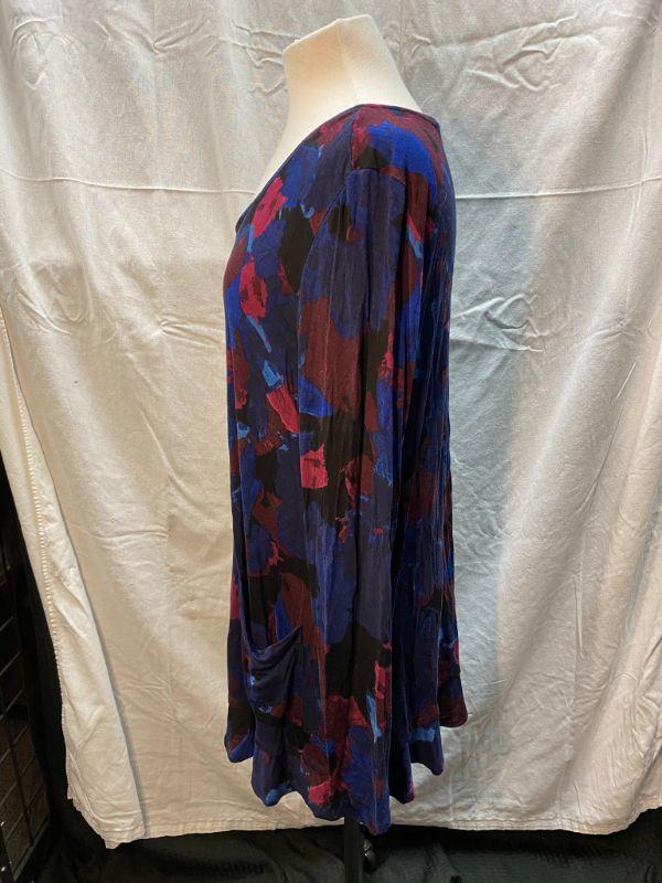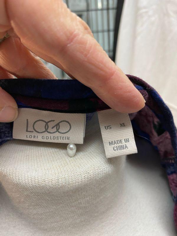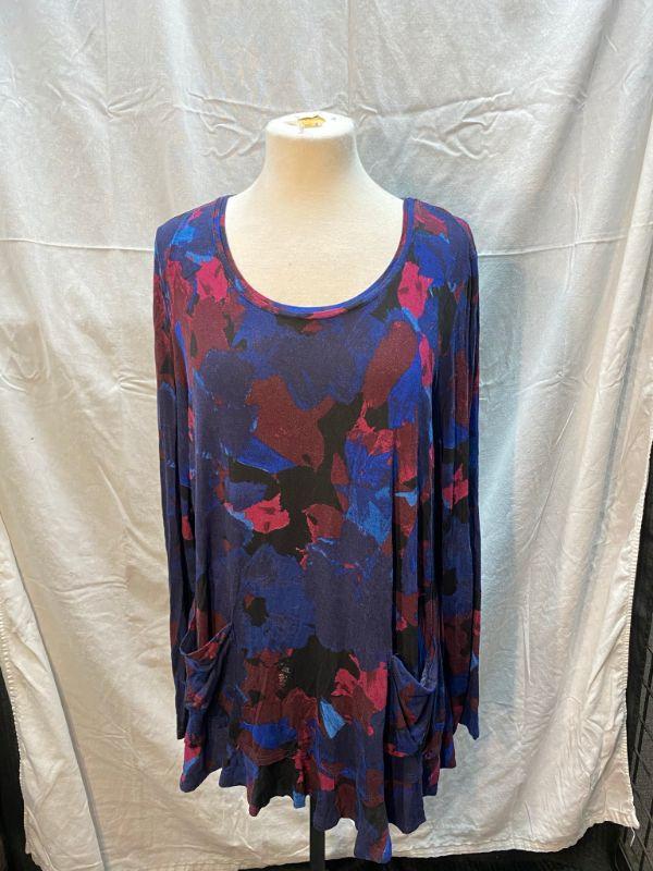LOGO by Lori Goldstein jewel tone tunic top. Dark blues, magentas, purples. Has front pockets. Good condition. Size XL.