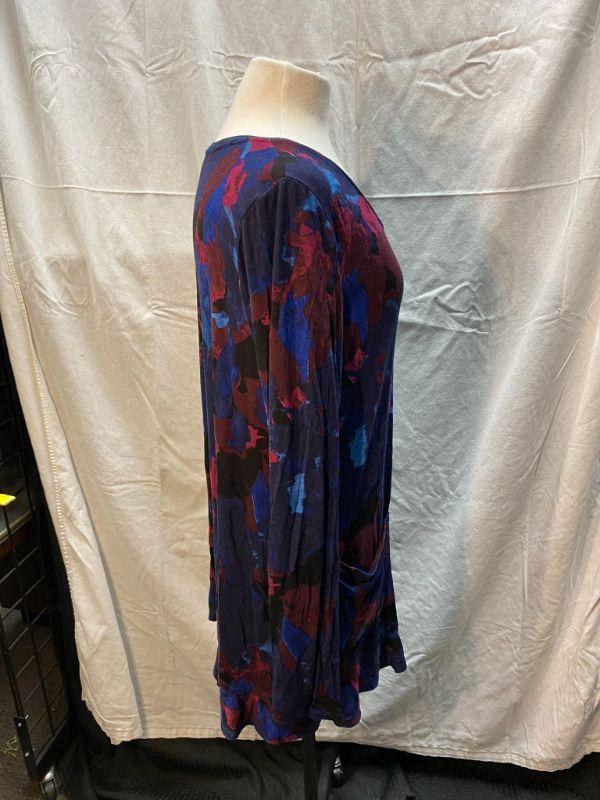 LOGO by Lori Goldstein jewel tone tunic top. Dark blues, magentas, purples. Has front pockets. Good condition. Size XL.