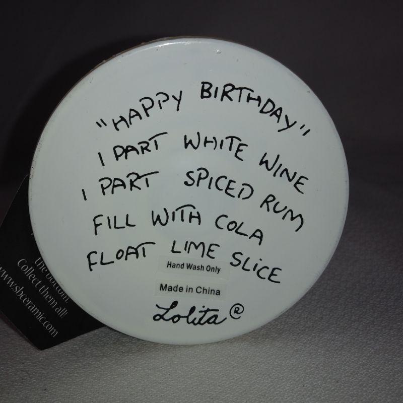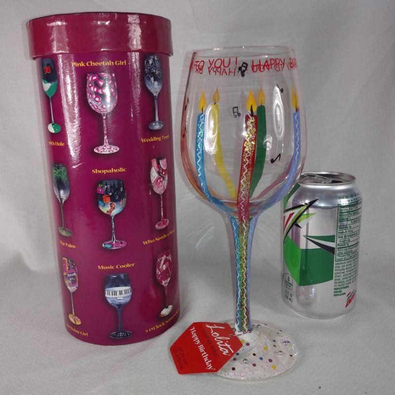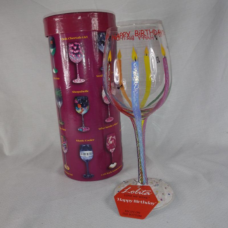 This is one of Lolita's signature glasses with glass box - "Happy Birthday". Unused and new. The glass is 9-inches tall for a nice-sized glass of wine to celebrate a birthday. What a nice gift! Just add the wine or not.