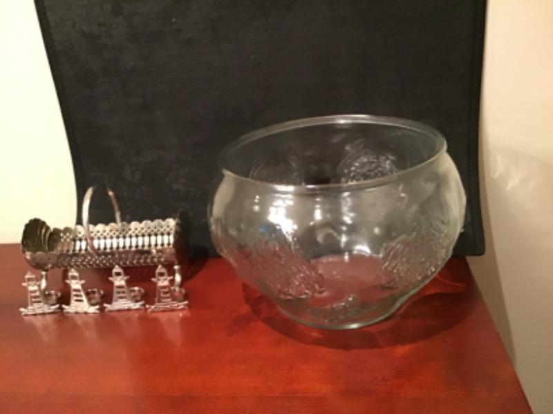 Beautiful punch bowl with 7 mugs, 4 Lighthouse napkin rings