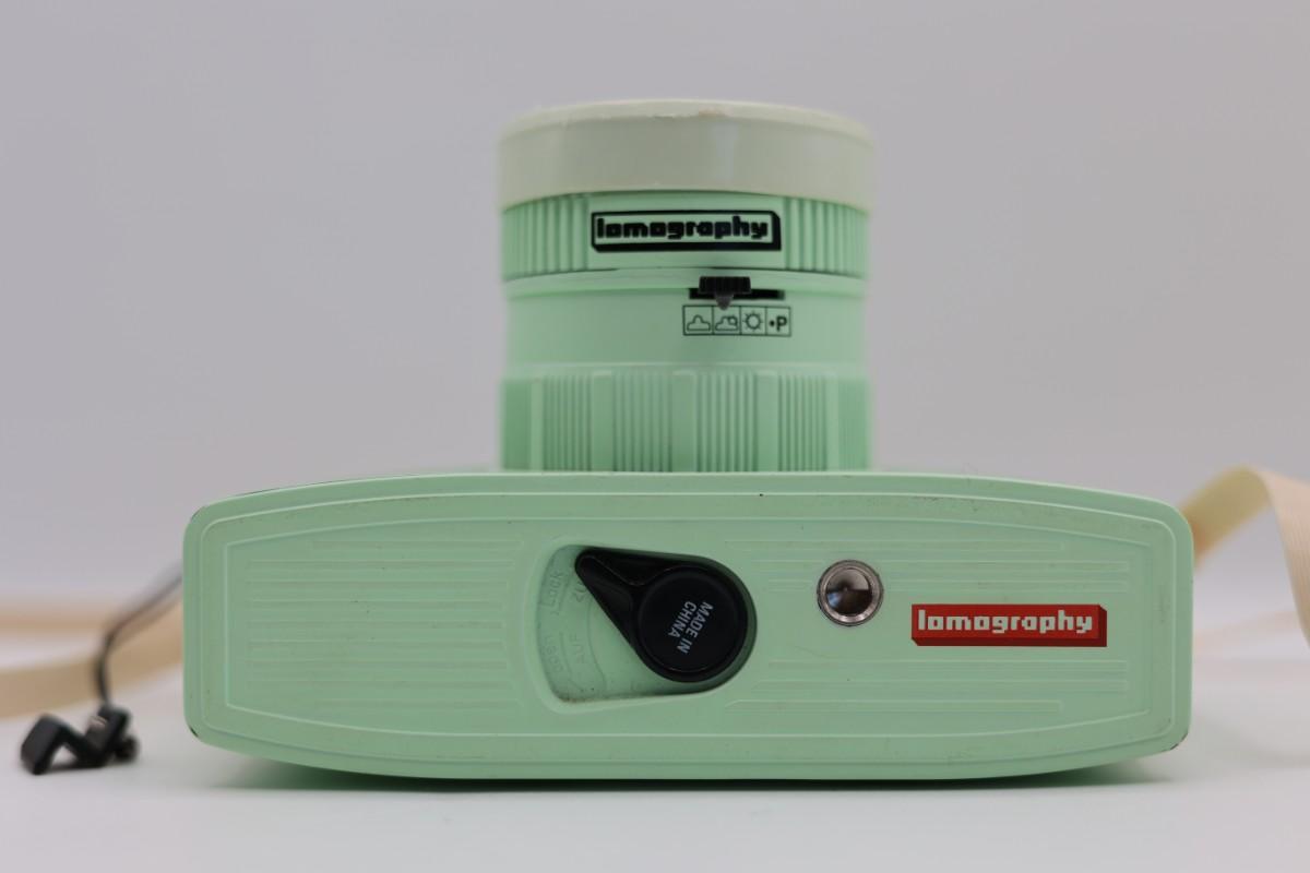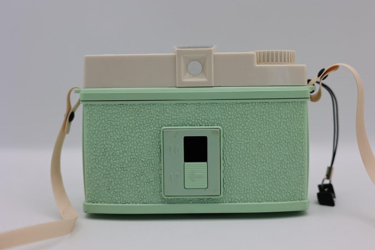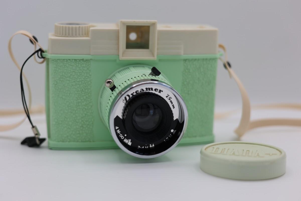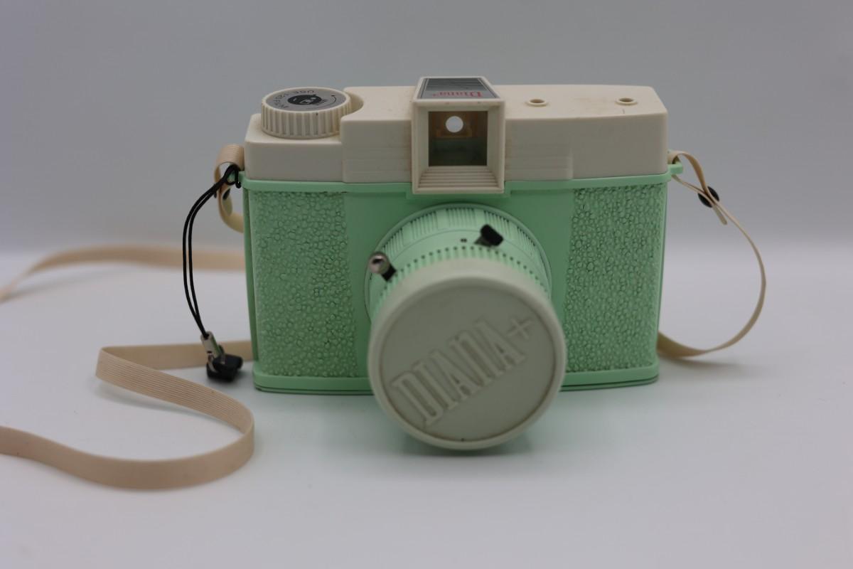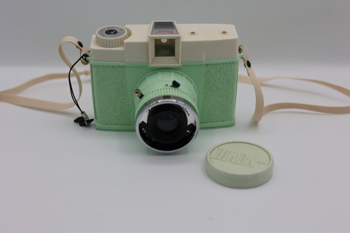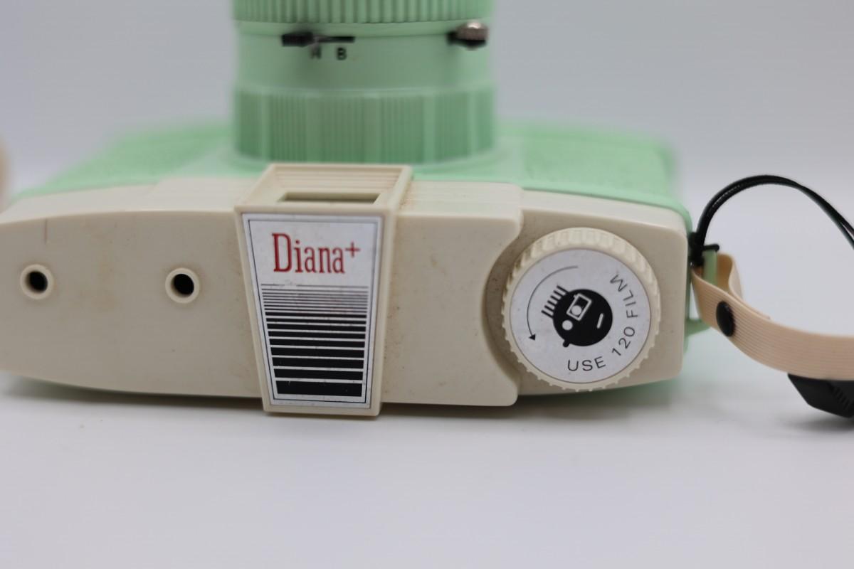 Lomography Diana+ camera in mint green and cream. Retro plastic-body camera known for soft, vignette-style photos. Includes lens cap and strap. Untested.