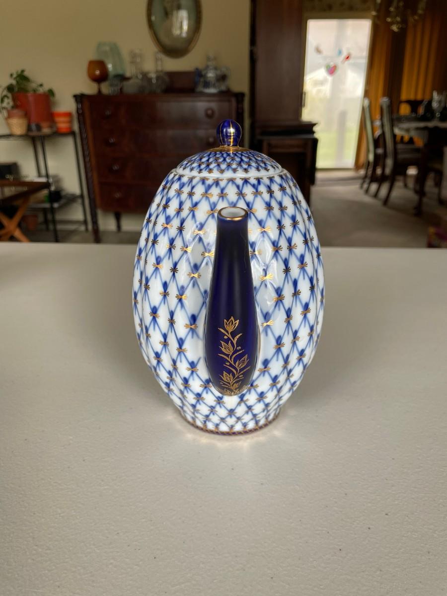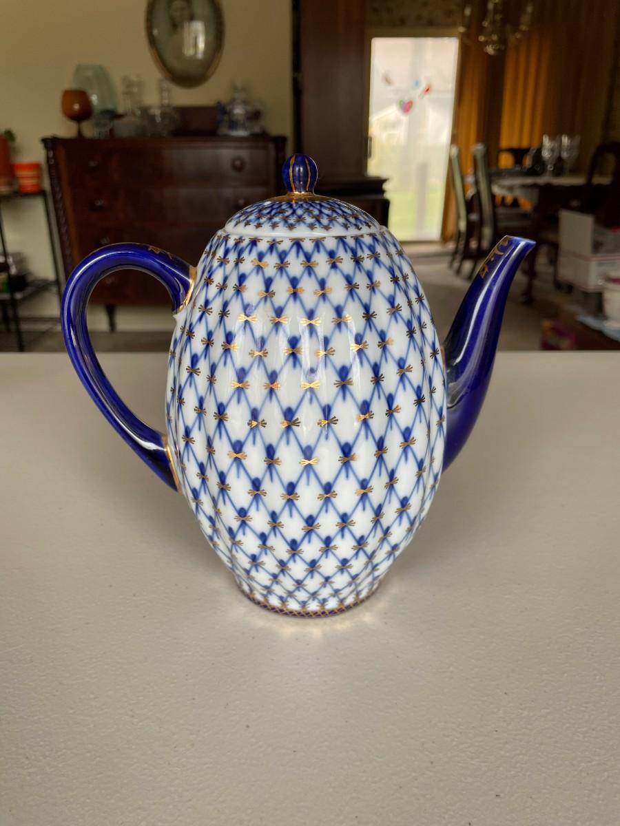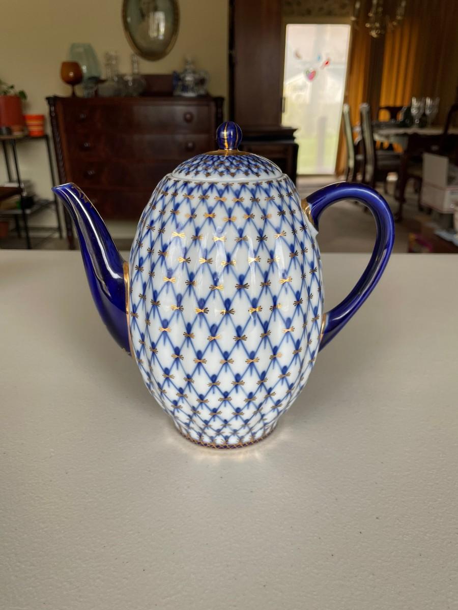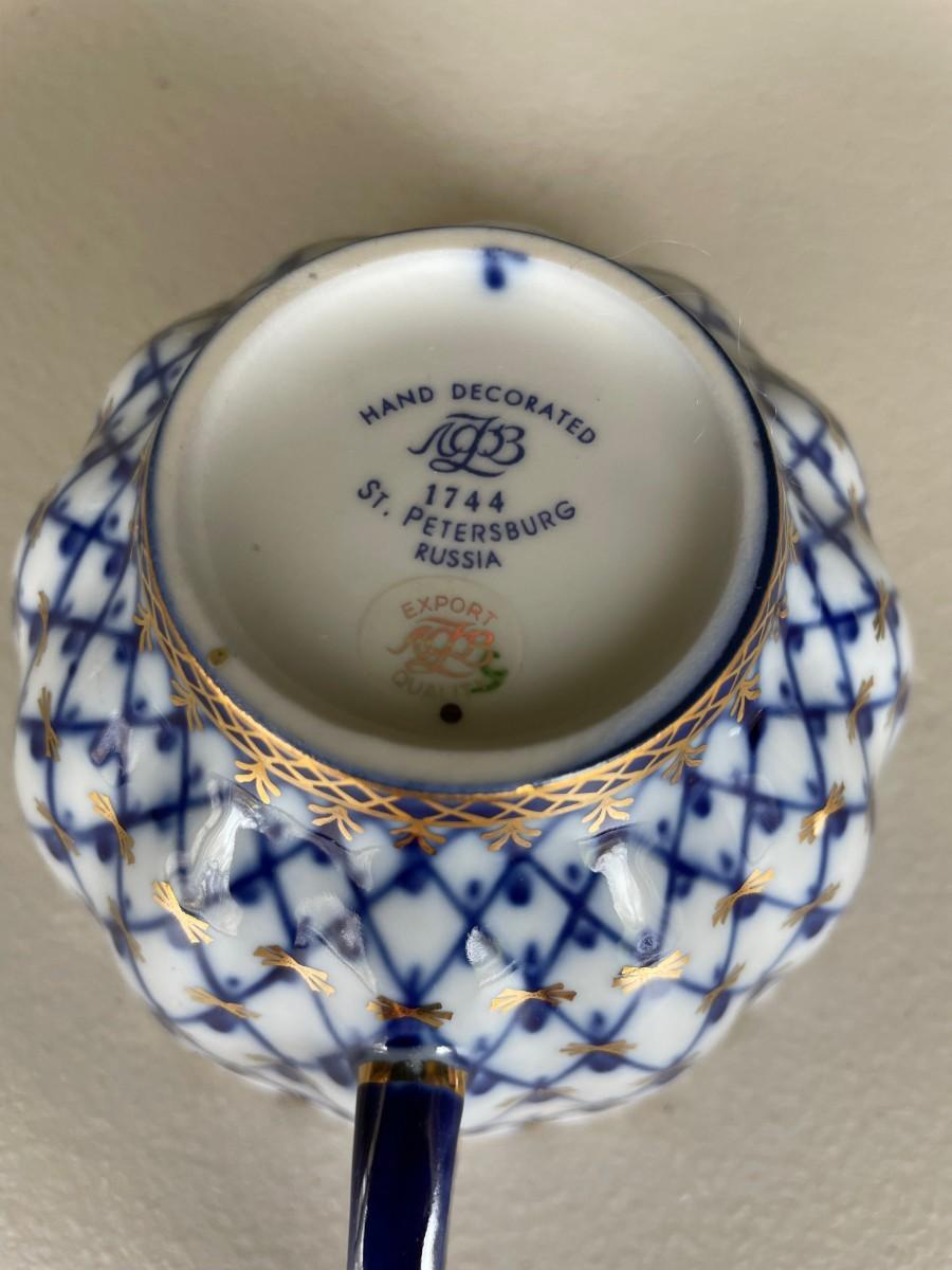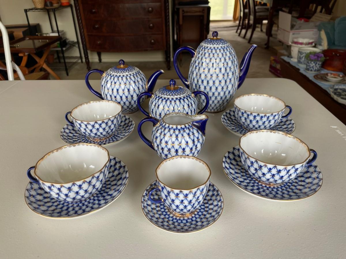 Imperial blue. Cobalt net. 4 coffee cups with 4 Saucers. 1 tea cup with saucer. 1 Teapot with Lid. 1 Coffee Pot with lid. 1 Creamer. 1 Sugarpot with lid. Stamped “Hand Decorated 1744 St. Petersburg Russia.