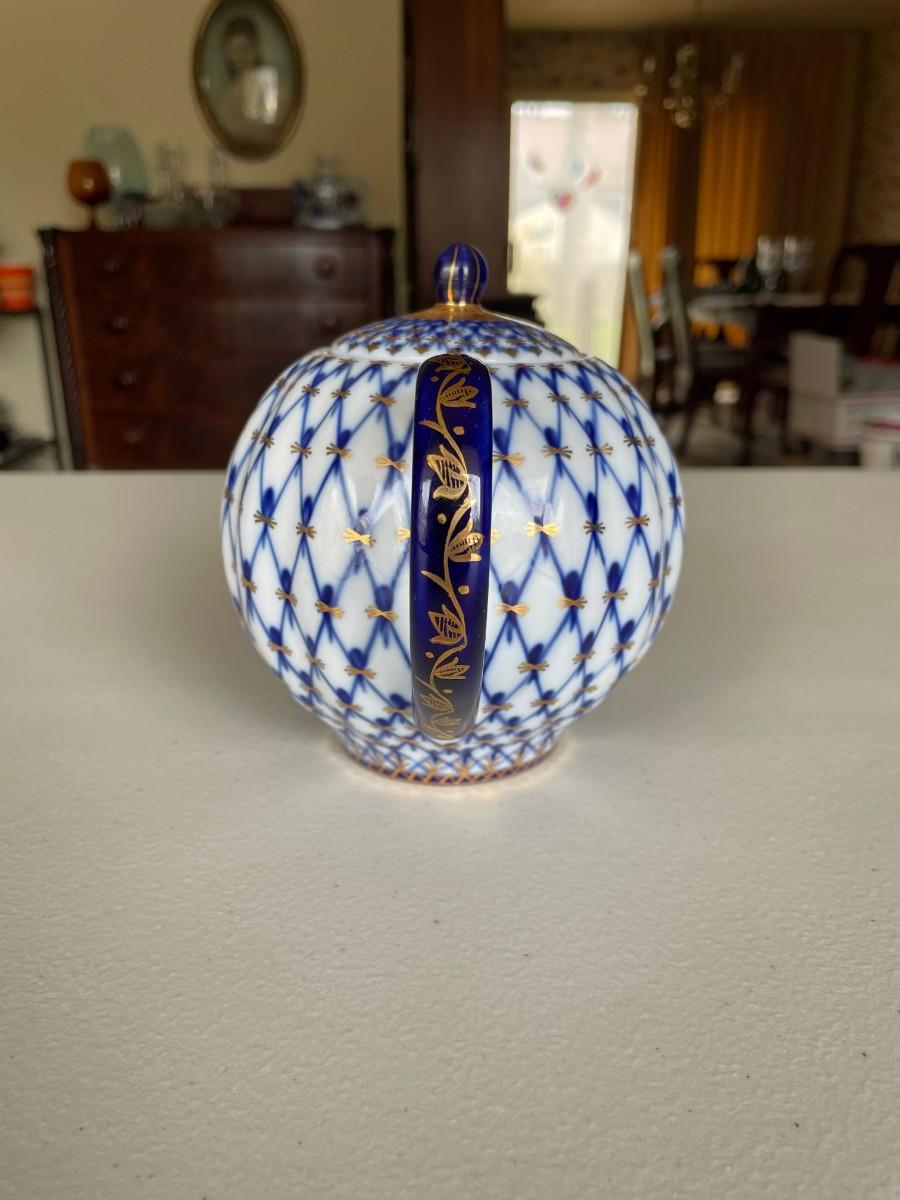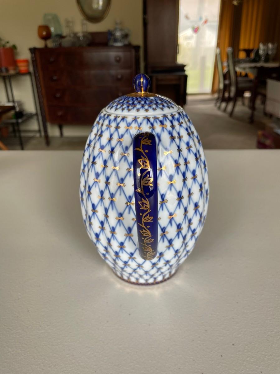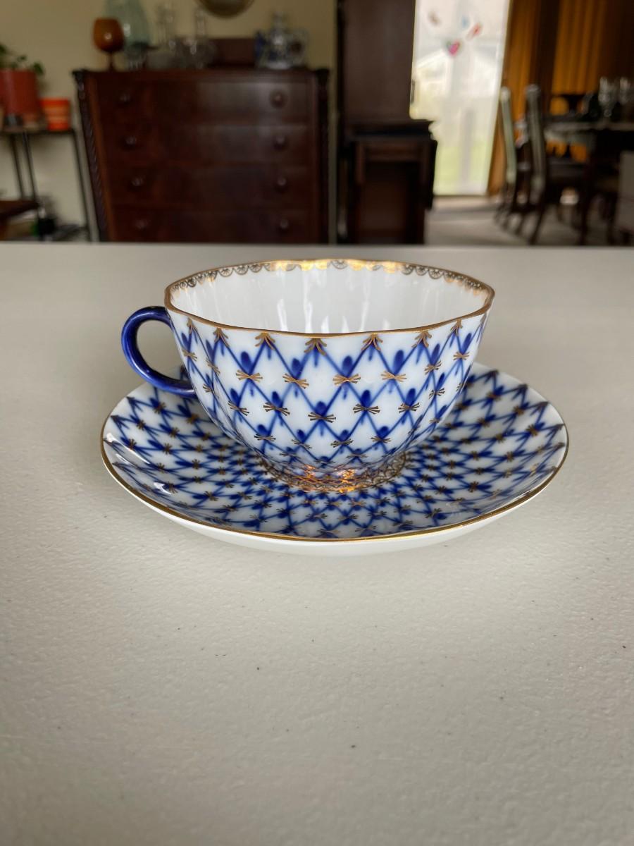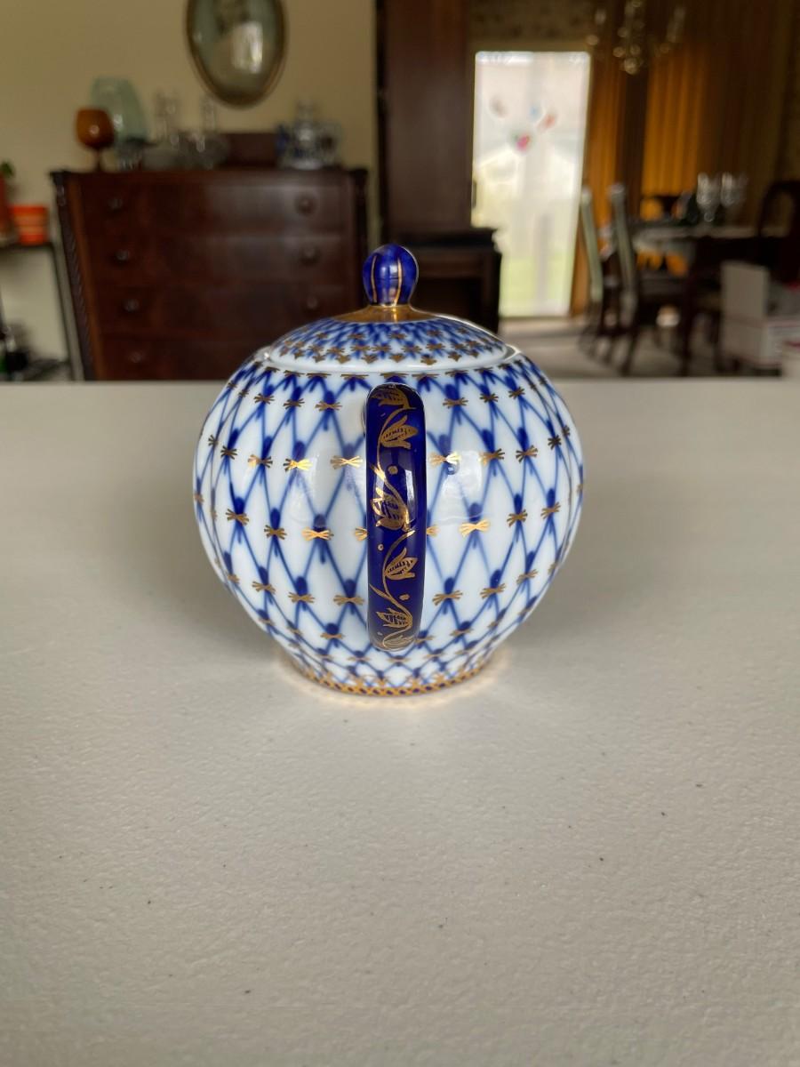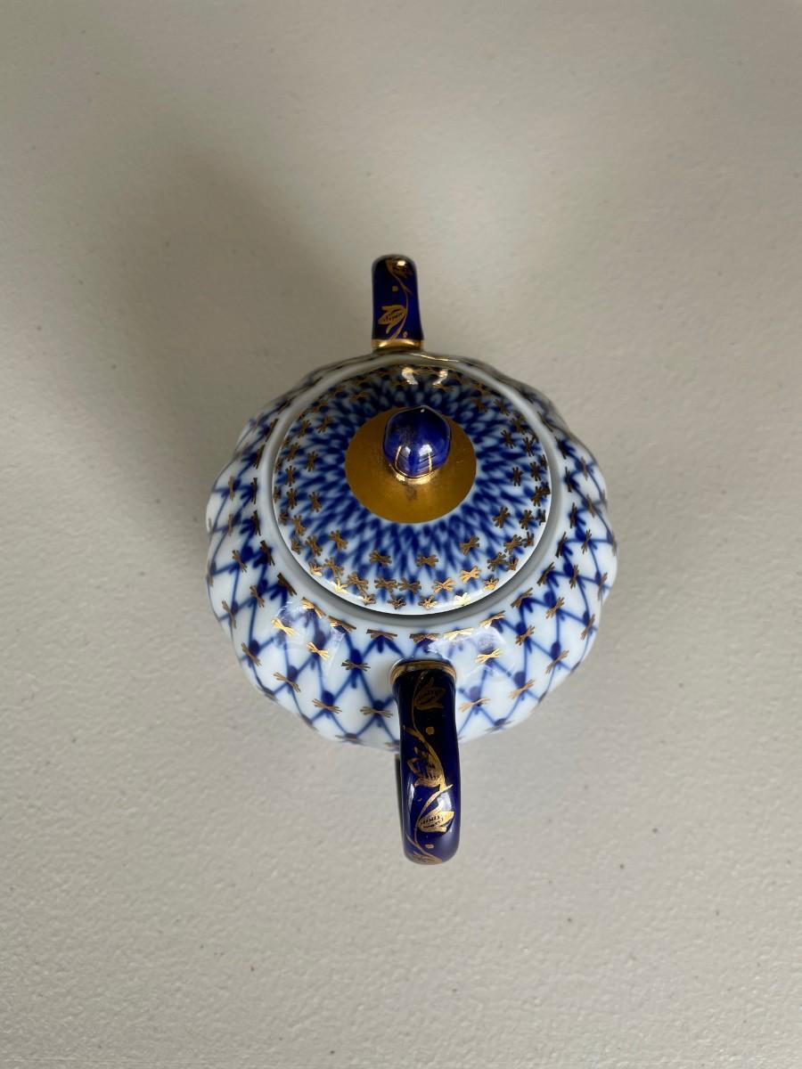 Imperial blue. Cobalt net. 4 coffee cups with 4 Saucers. 1 tea cup with saucer. 1 Teapot with Lid. 1 Coffee Pot with lid. 1 Creamer. 1 Sugarpot with lid. Stamped “Hand Decorated 1744 St. Petersburg Russia.