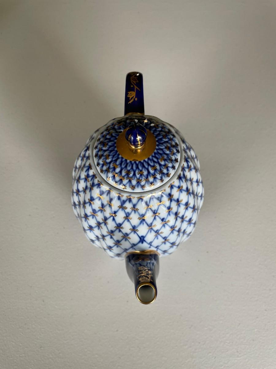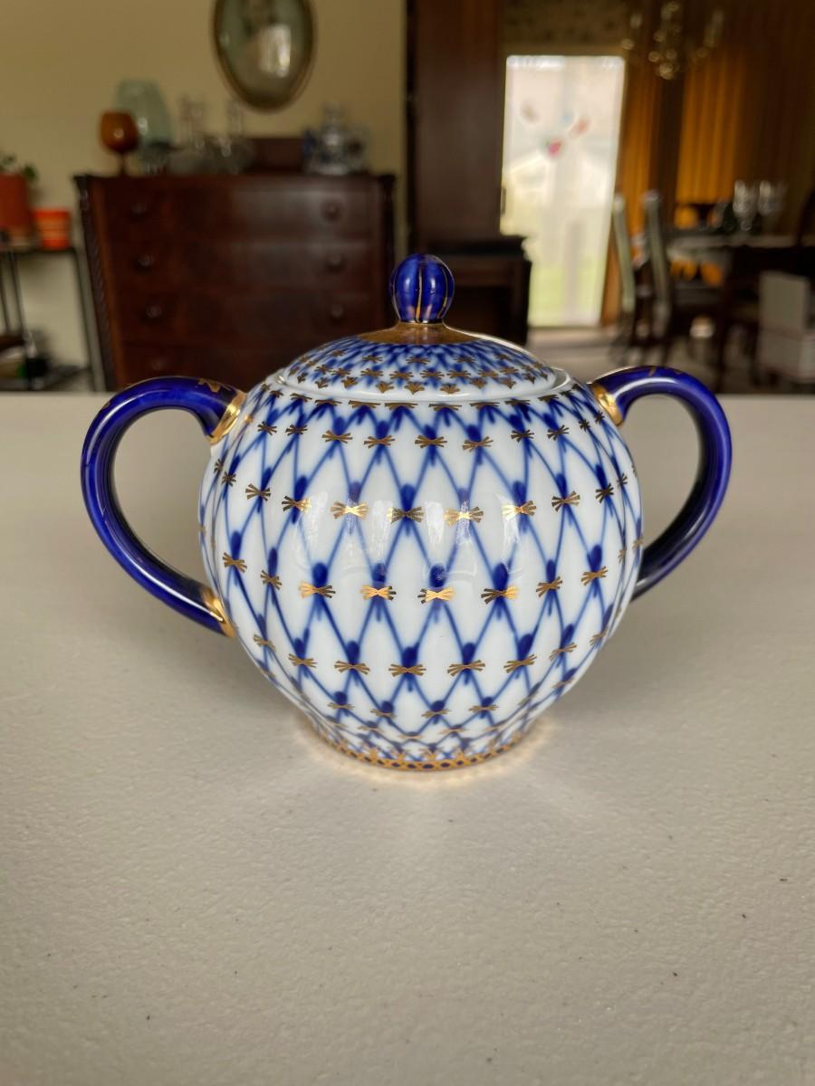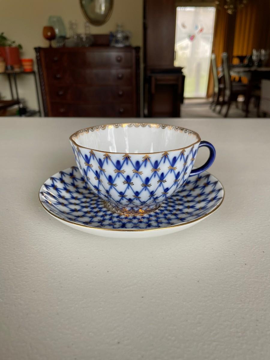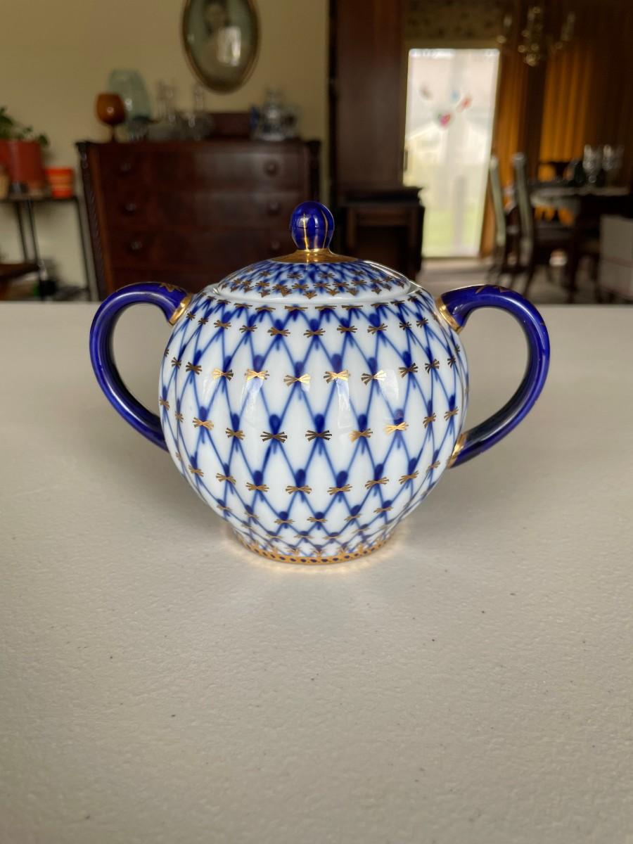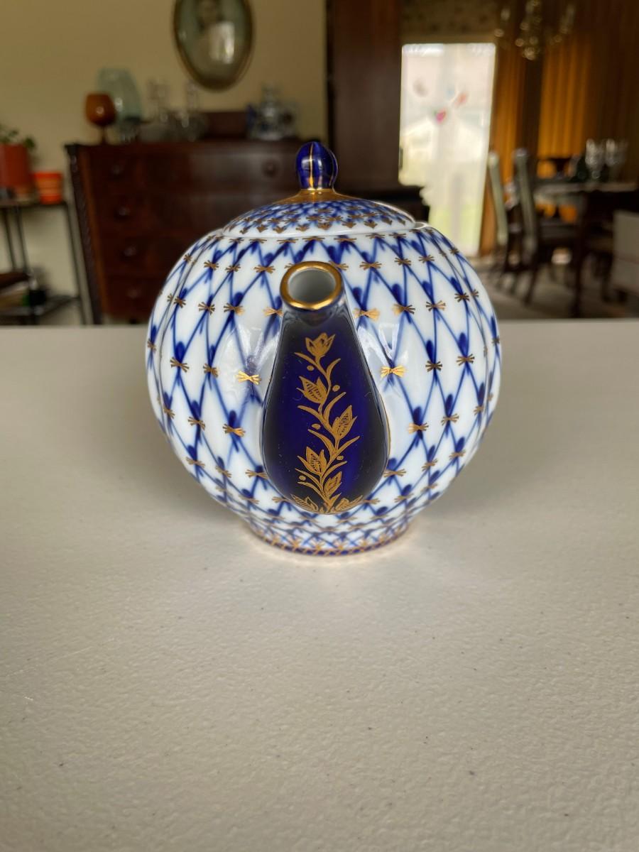 Imperial blue. Cobalt net. 4 coffee cups with 4 Saucers. 1 tea cup with saucer. 1 Teapot with Lid. 1 Coffee Pot with lid. 1 Creamer. 1 Sugarpot with lid. Stamped “Hand Decorated 1744 St. Petersburg Russia.