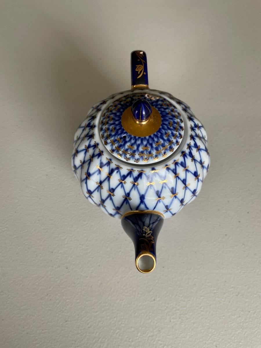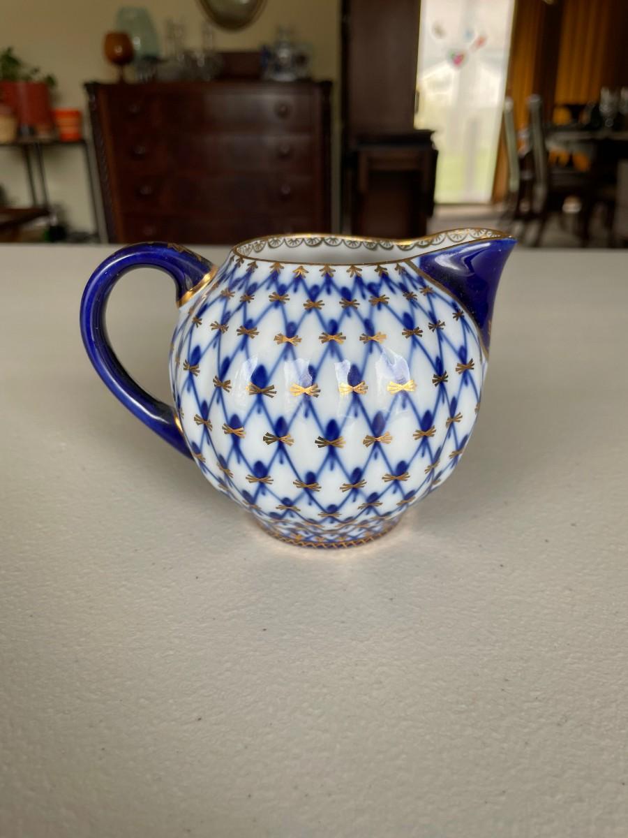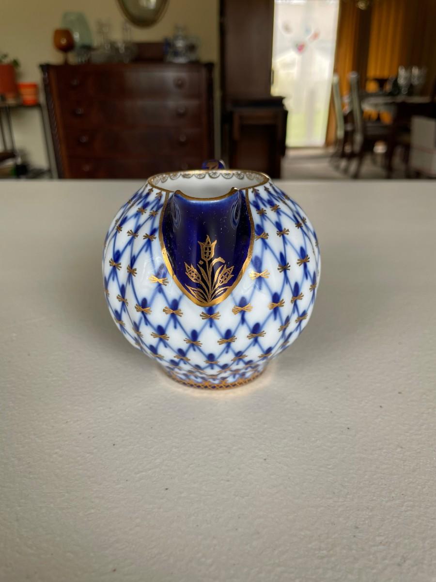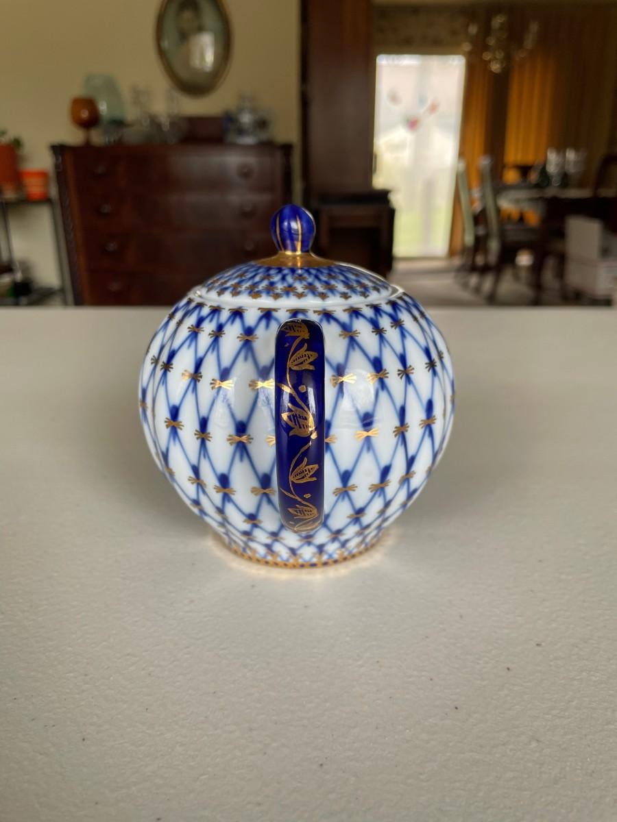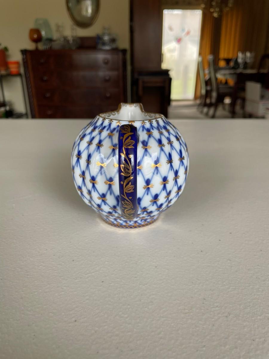 Imperial blue. Cobalt net. 4 coffee cups with 4 Saucers. 1 tea cup with saucer. 1 Teapot with Lid. 1 Coffee Pot with lid. 1 Creamer. 1 Sugarpot with lid. Stamped “Hand Decorated 1744 St. Petersburg Russia.