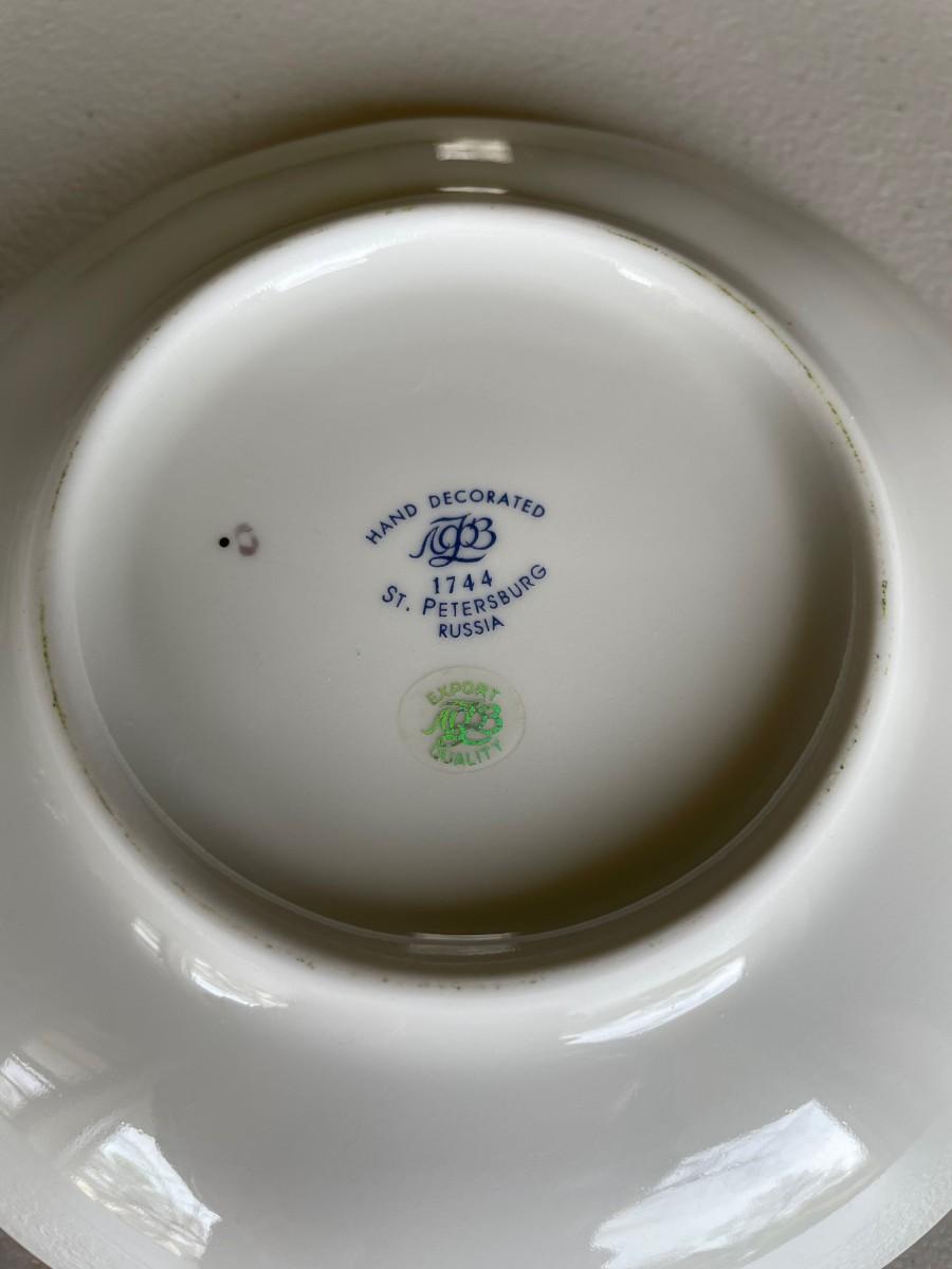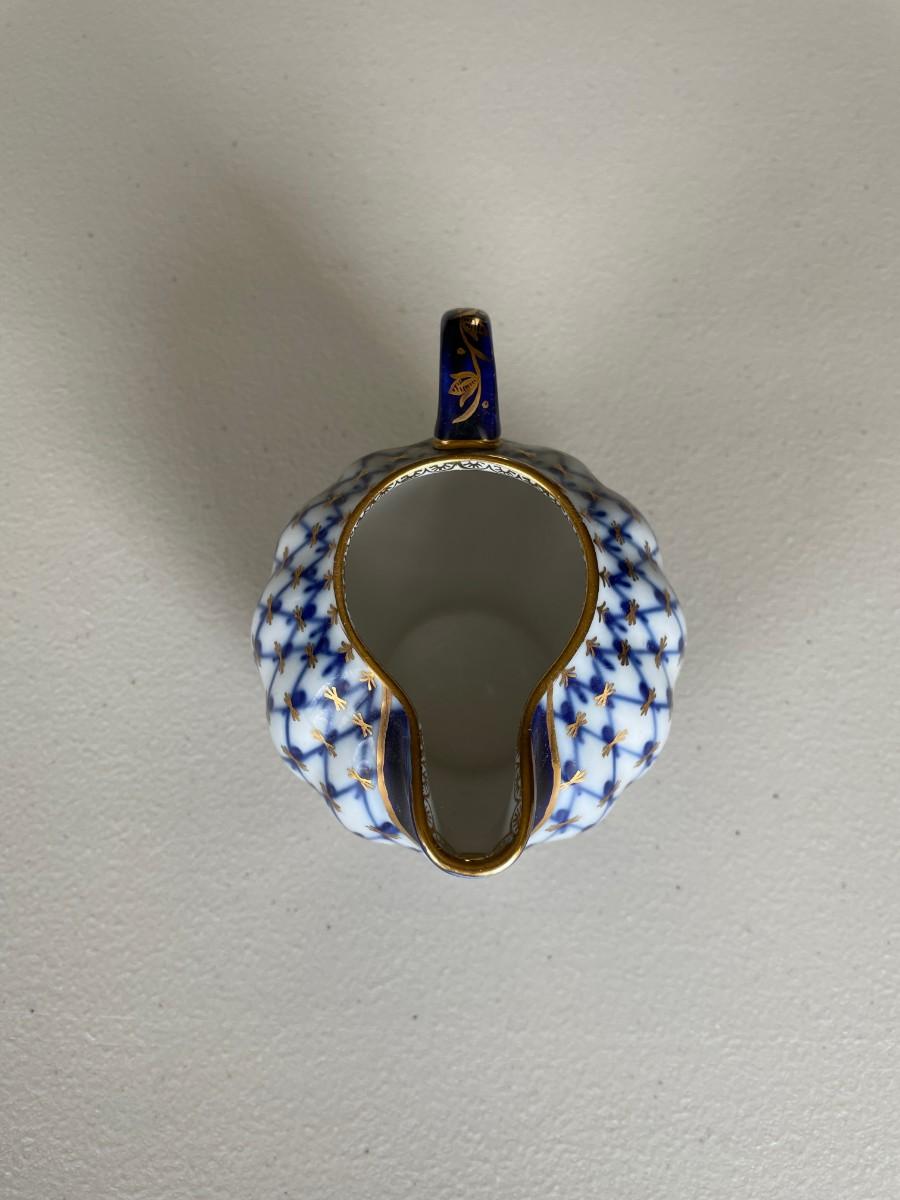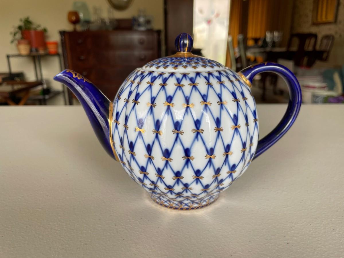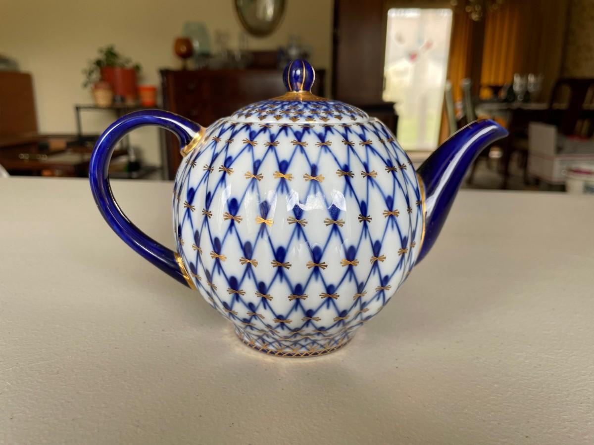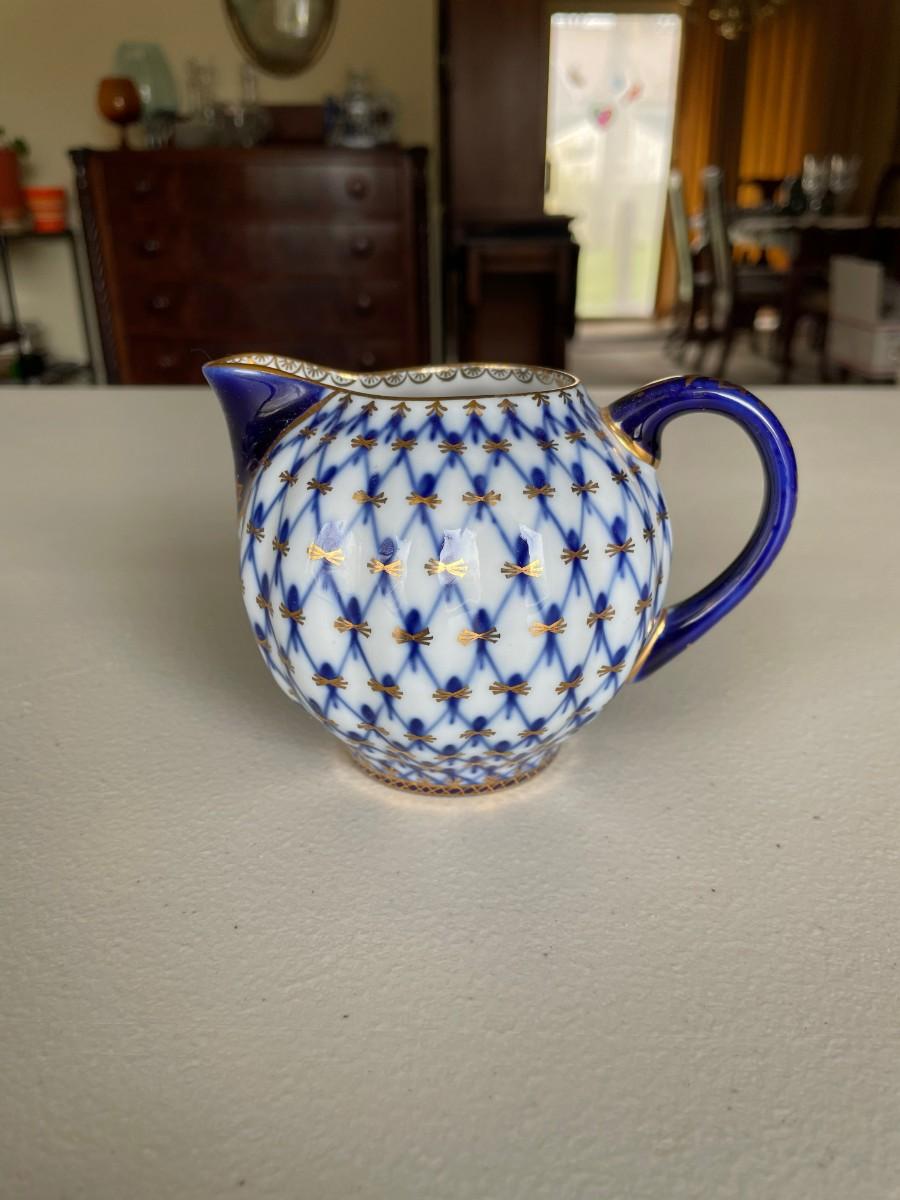 Imperial blue. Cobalt net. 4 coffee cups with 4 Saucers. 1 tea cup with saucer. 1 Teapot with Lid. 1 Coffee Pot with lid. 1 Creamer. 1 Sugarpot with lid. Stamped “Hand Decorated 1744 St. Petersburg Russia.