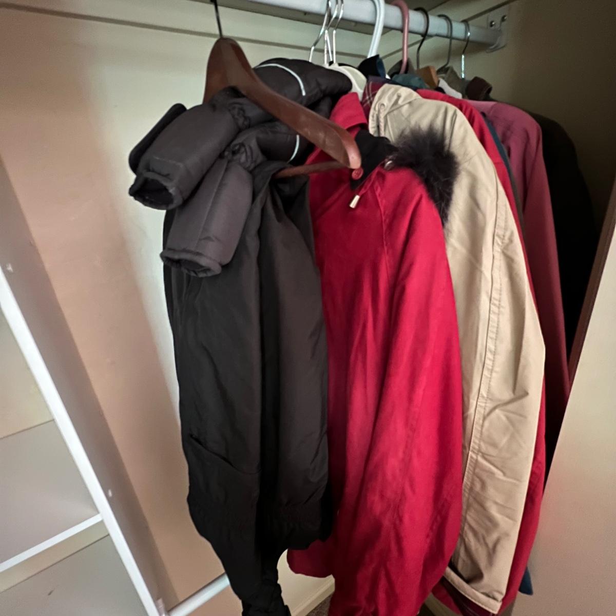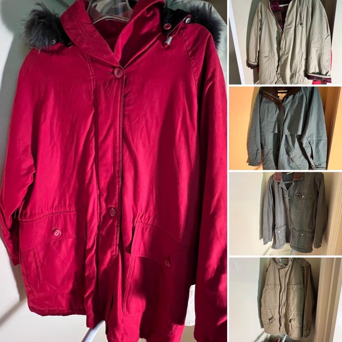 Nine winter jackets, five are size medium, the rest are large. Two jackets have no size label but appear to be large. See photos for more information. Also included is a pair of Gander Mountain ski pants and a pair of heated gloves (note the gloves are battery operated and were not tested).