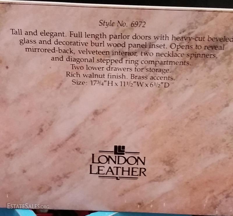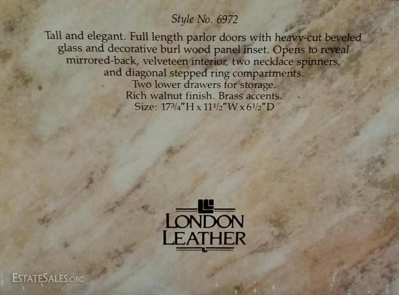 London Leather style No. 6972 Jewelry Box-Tall and elegant. Full length parlor doors with heavy-cut beveled glass and decorative burl wood panel insert. Opens to reveal mirrored-back, velveteen interior, two necklace spinners, and diagonal stepped ring compartments. Two lower drawers for storage. Rich walnut finish. Brass accents. 17.75 high X 11.5 wide X 6.5 deep