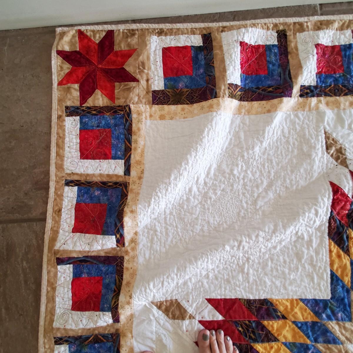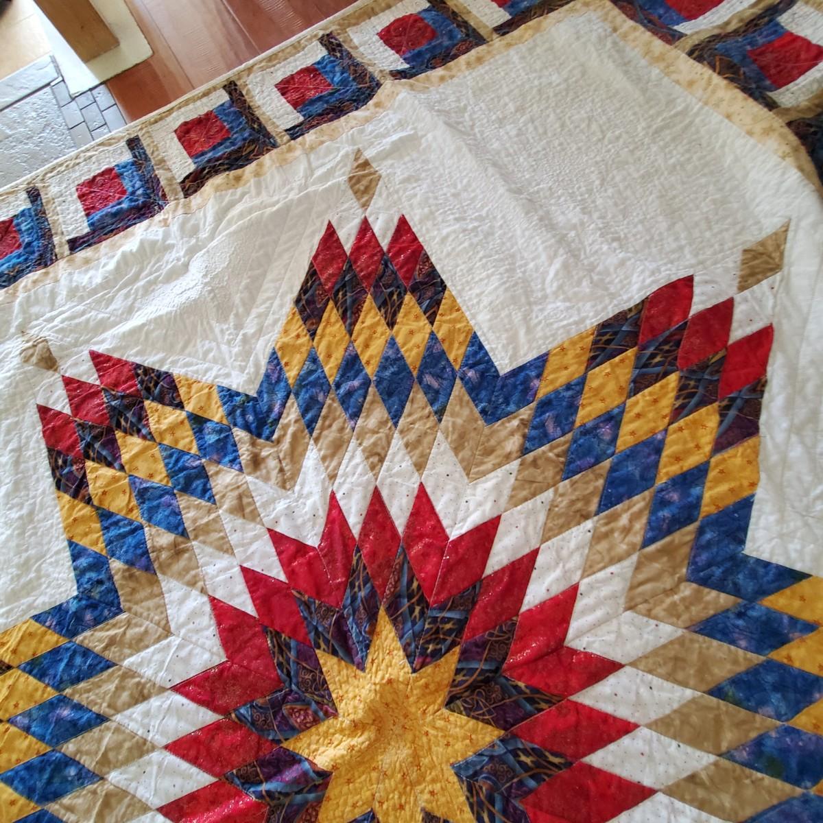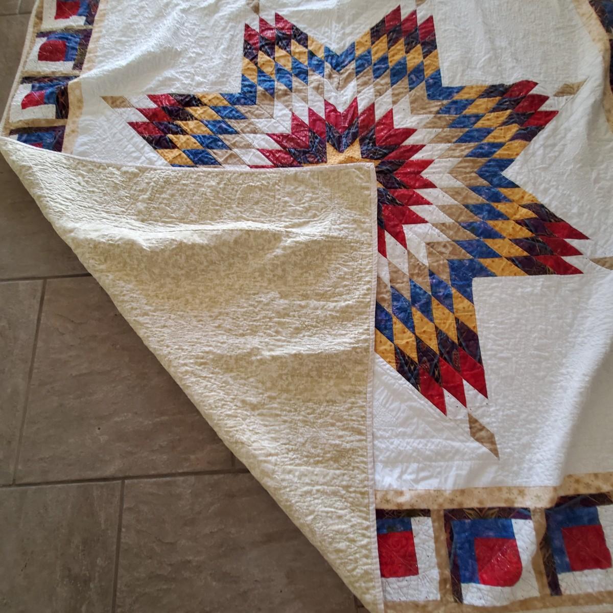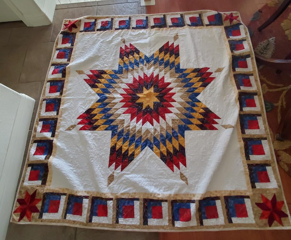 Beautifully sewn and designed quilt, machine stitched. Size is 74" x 72". Purchased new from the quilter. Never used.