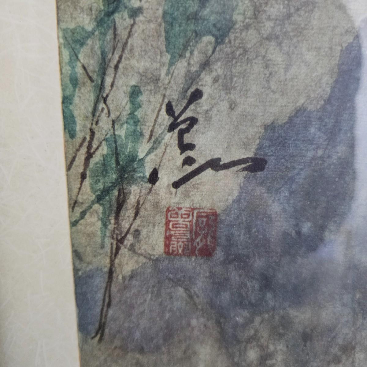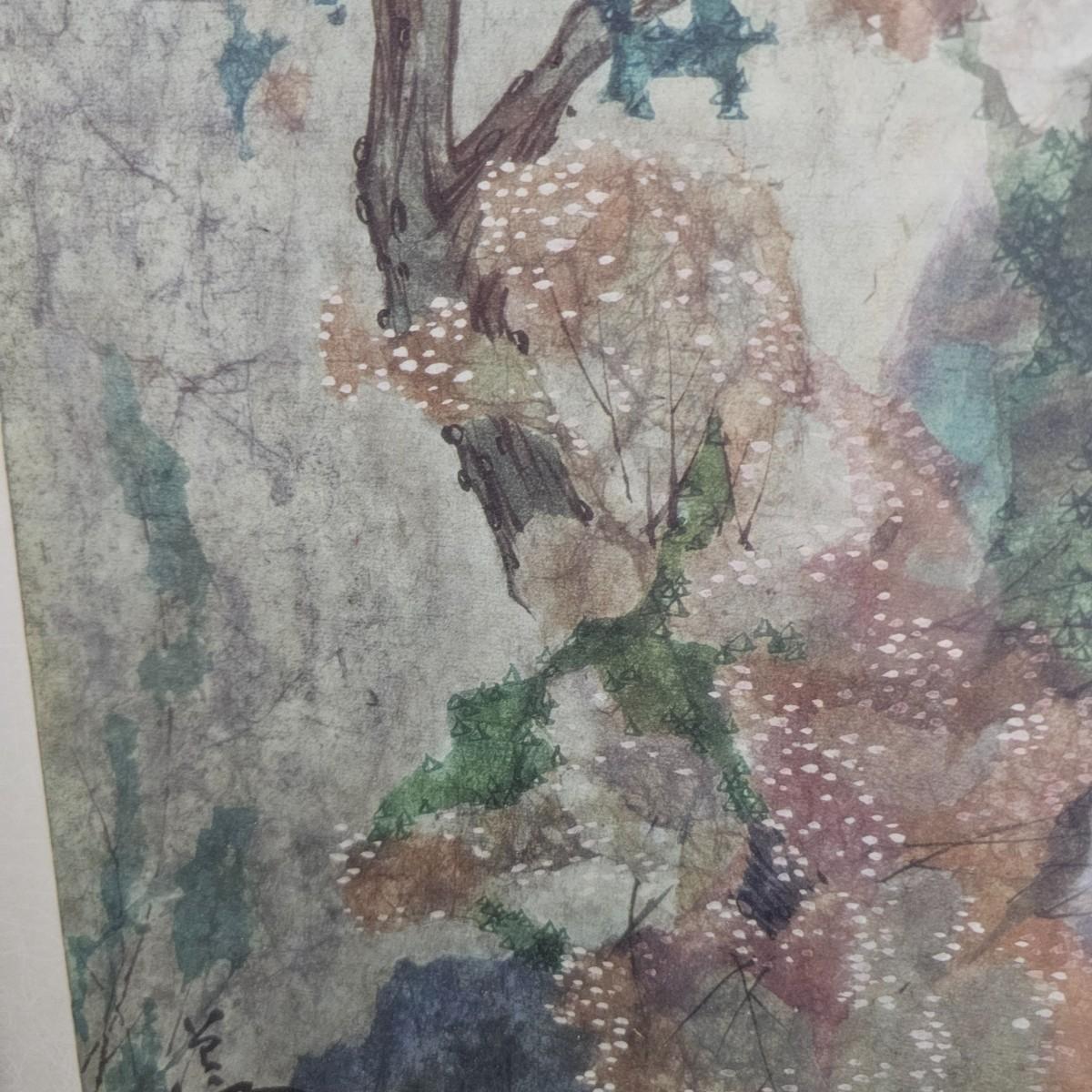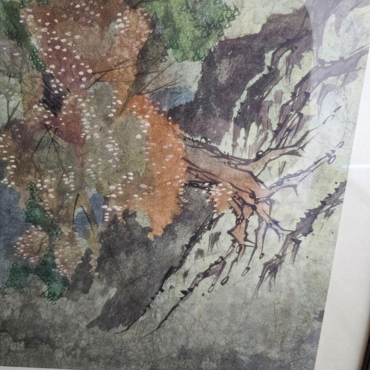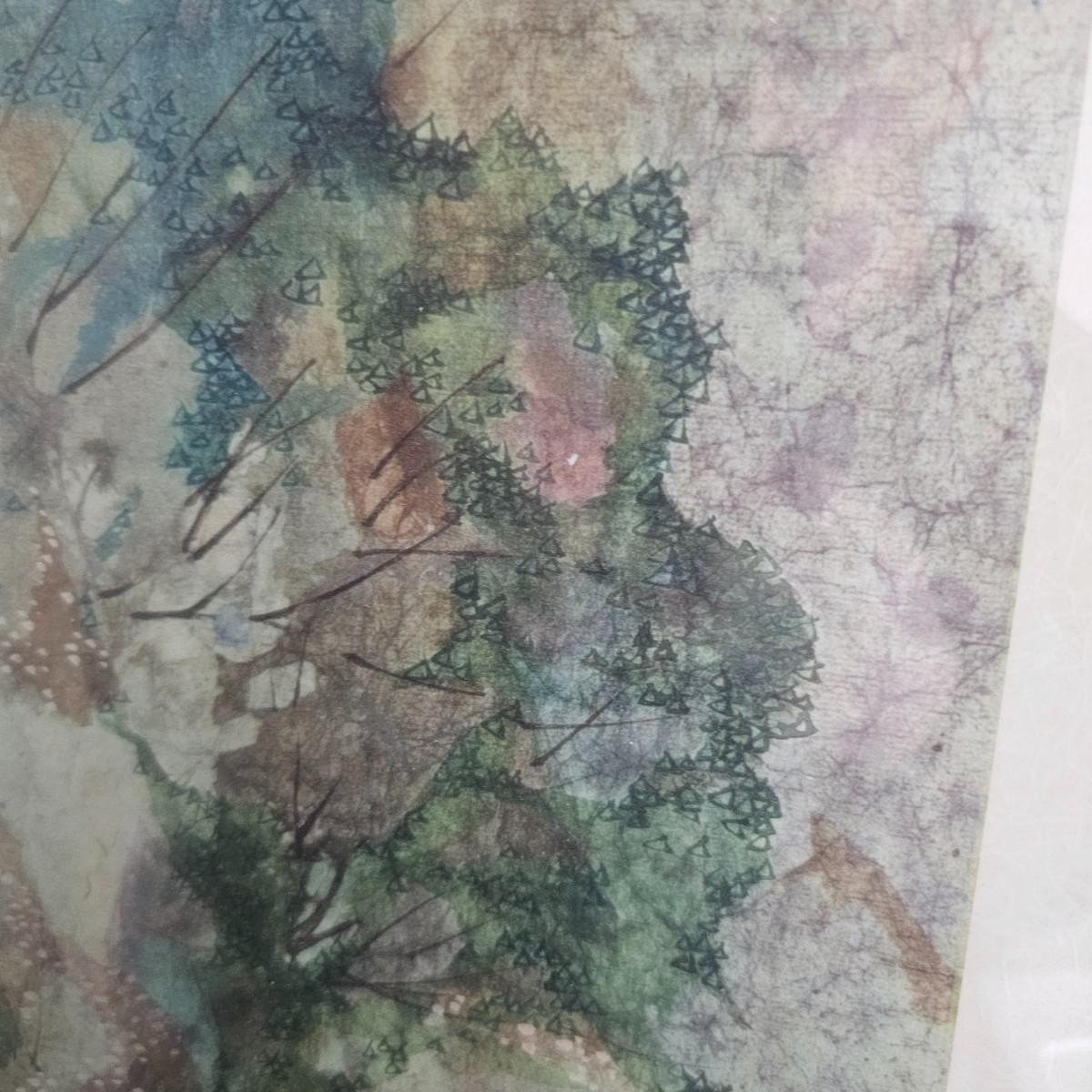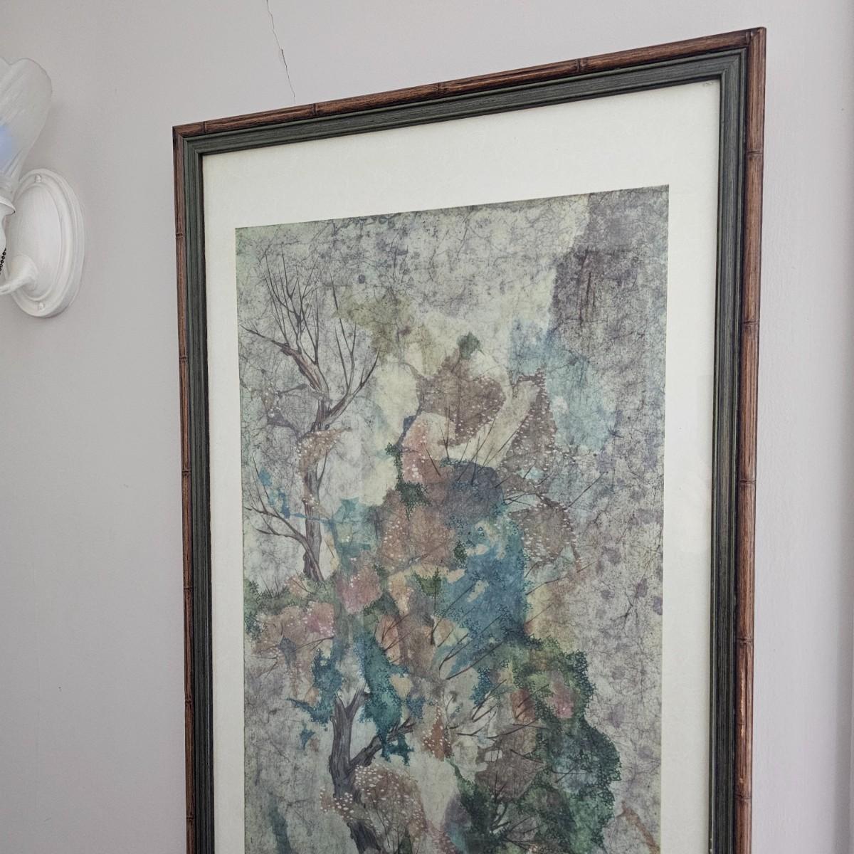 Long slender art print of a single tree and background. Soft, muted colors and shades of pastel provide a calming harmony. Print is wood framed, measures 20" x 42.5"H. Small blemishes on framework. See photos for details. Shipping available. Shipping can be costly. We suggest contacting our preferred local shipping provider, Postage Express, with dimensions and getting an estimate before bidding: (828) 255-9250 or shipping@postageexpressnc.com.