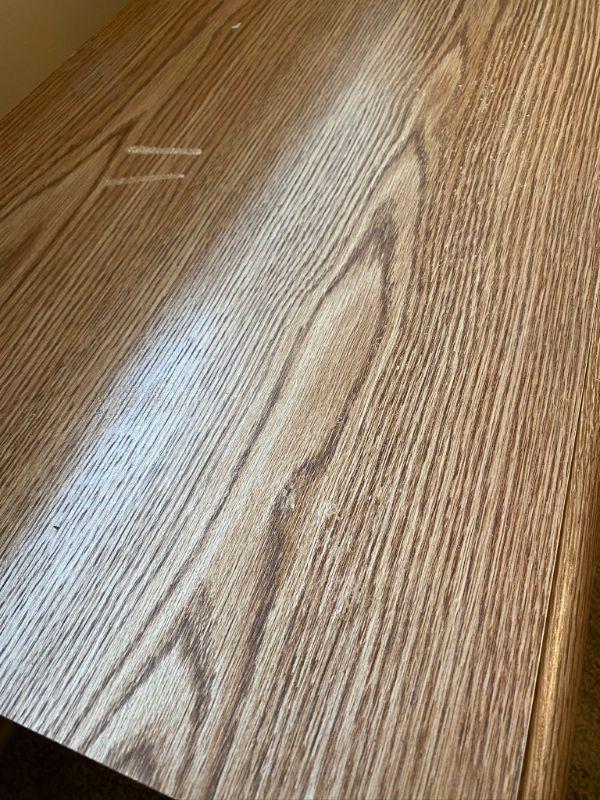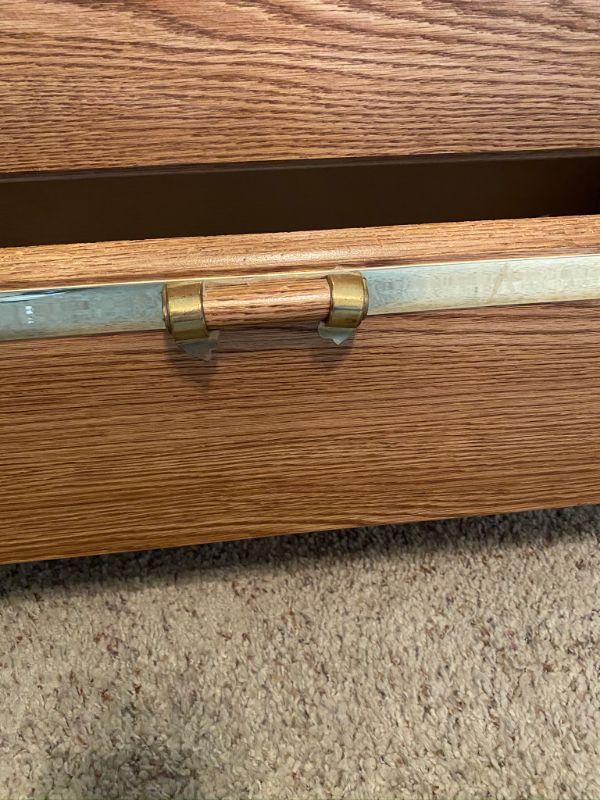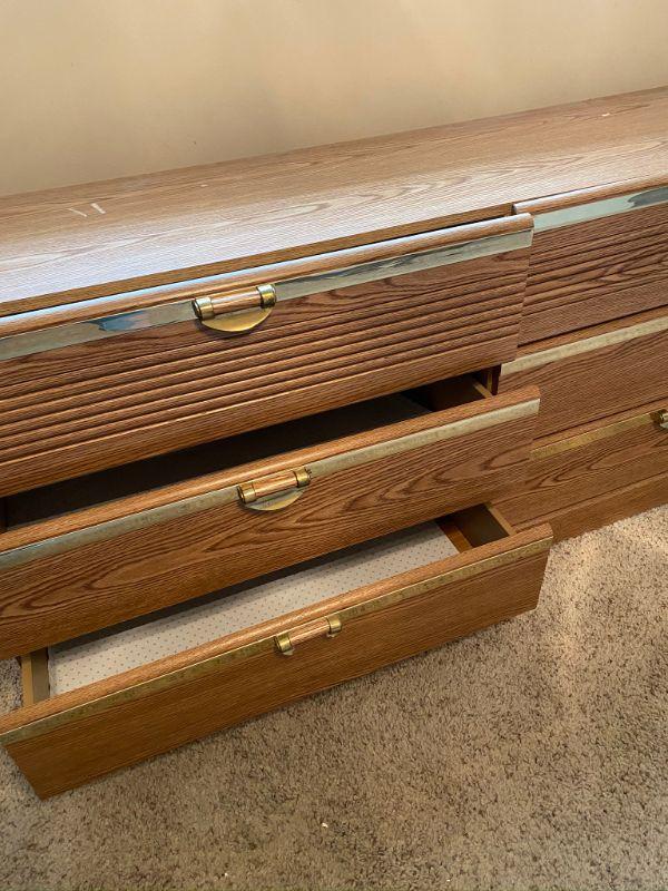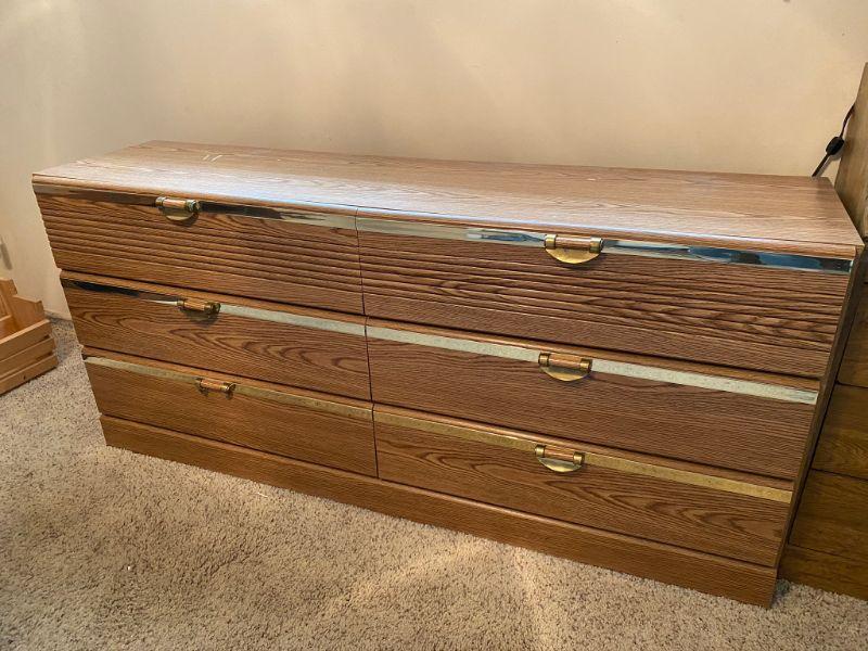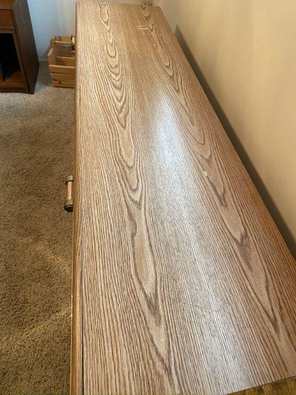 6 Drawer Dresser. Long, about 5.5'. Veneer finish. Bottom drawer has a broken handle. Drawers slide okay. Back looks a bit warped from age.