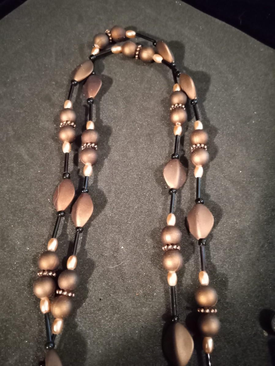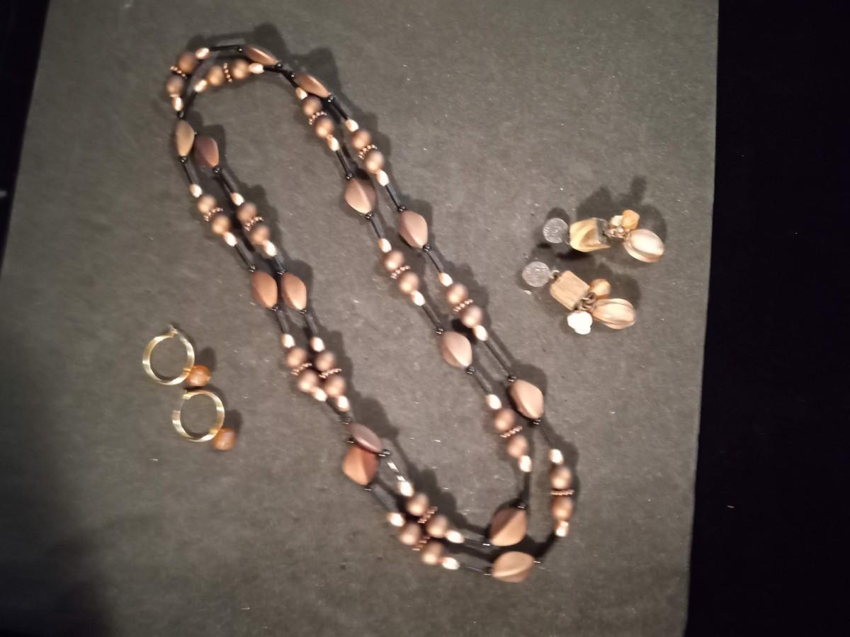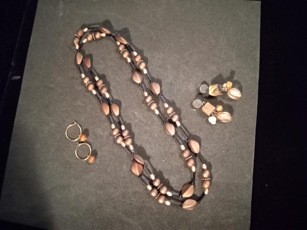 LONG BEADED NECKLACE AND 2 PAIRS OF PIERCED EARRINGS