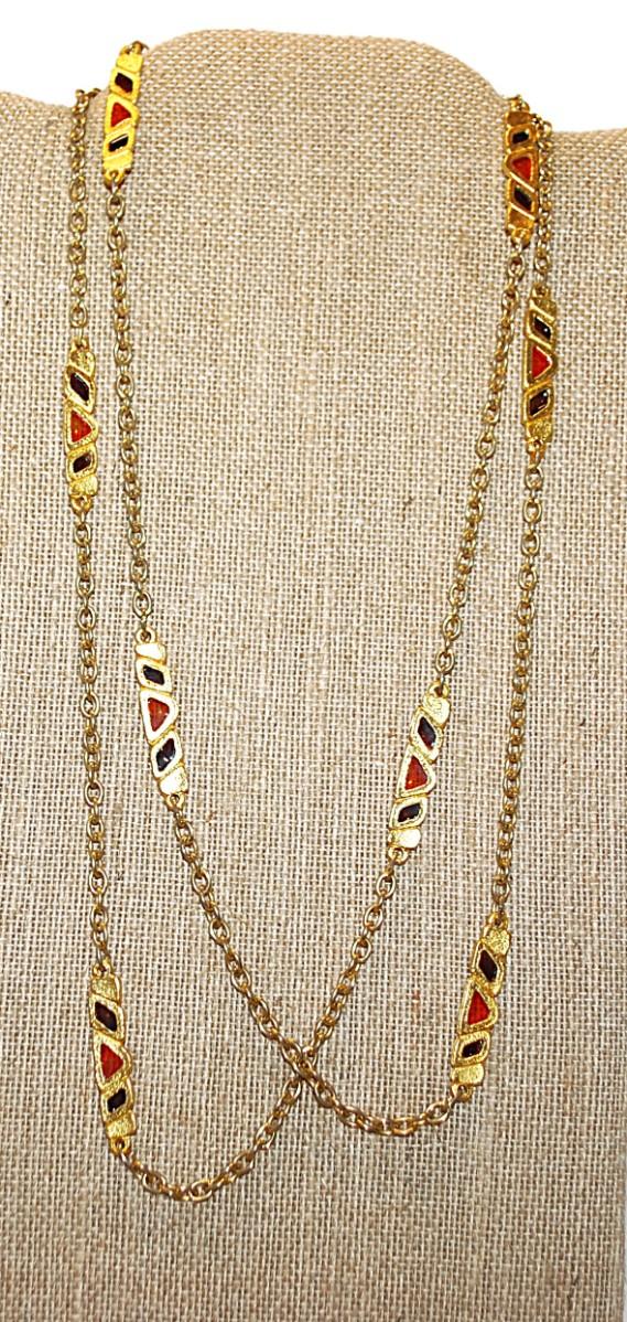 Long Colorful Wrap-Around Necklace Chain with Amber & Red Glass Stone Sections with Barrel Lock Closure 44" L