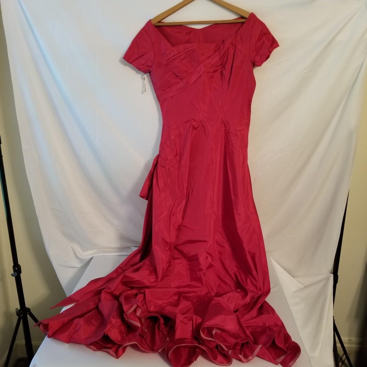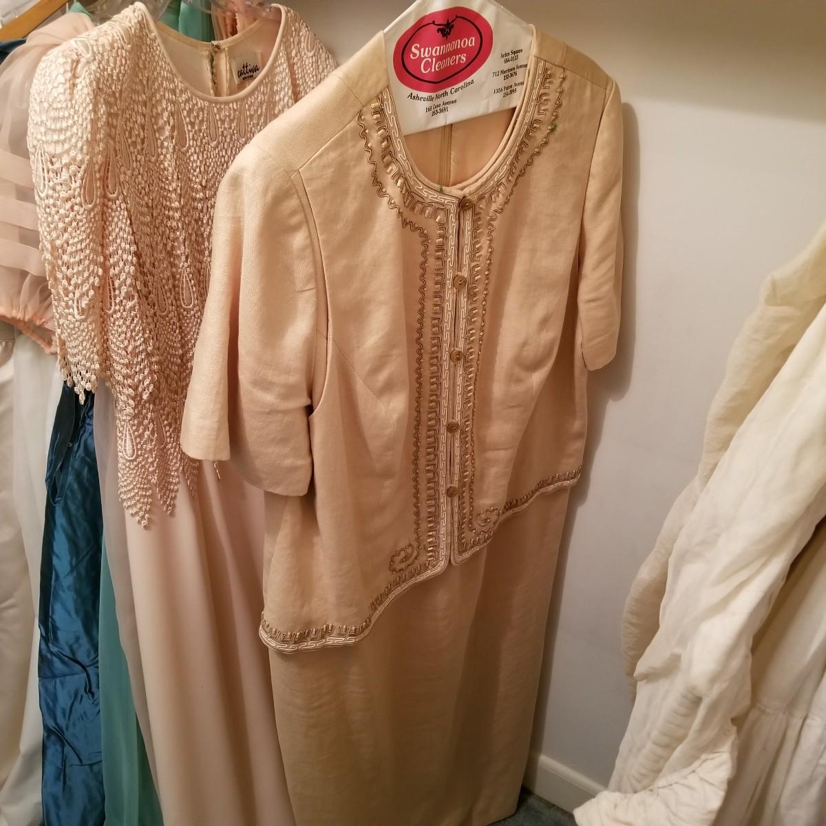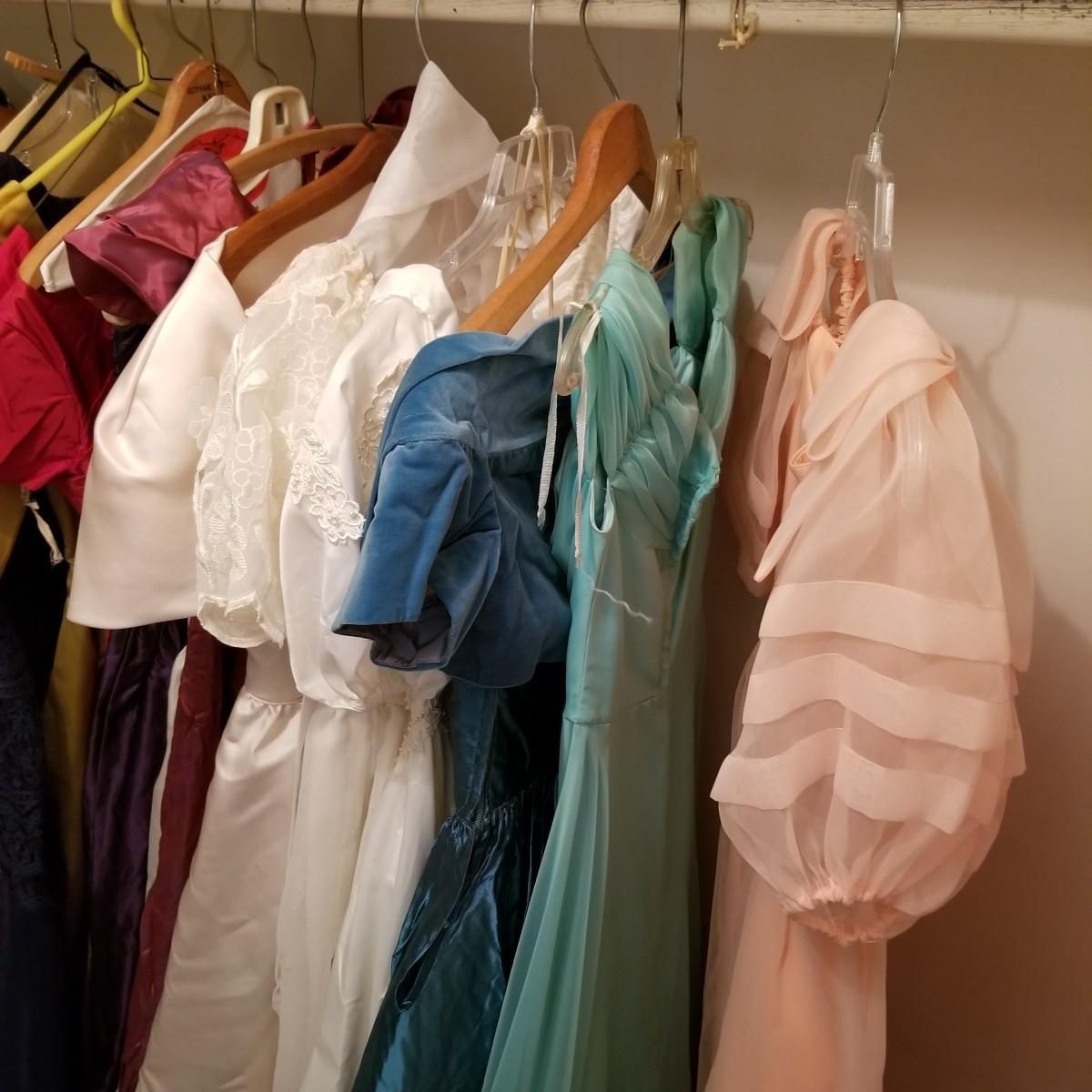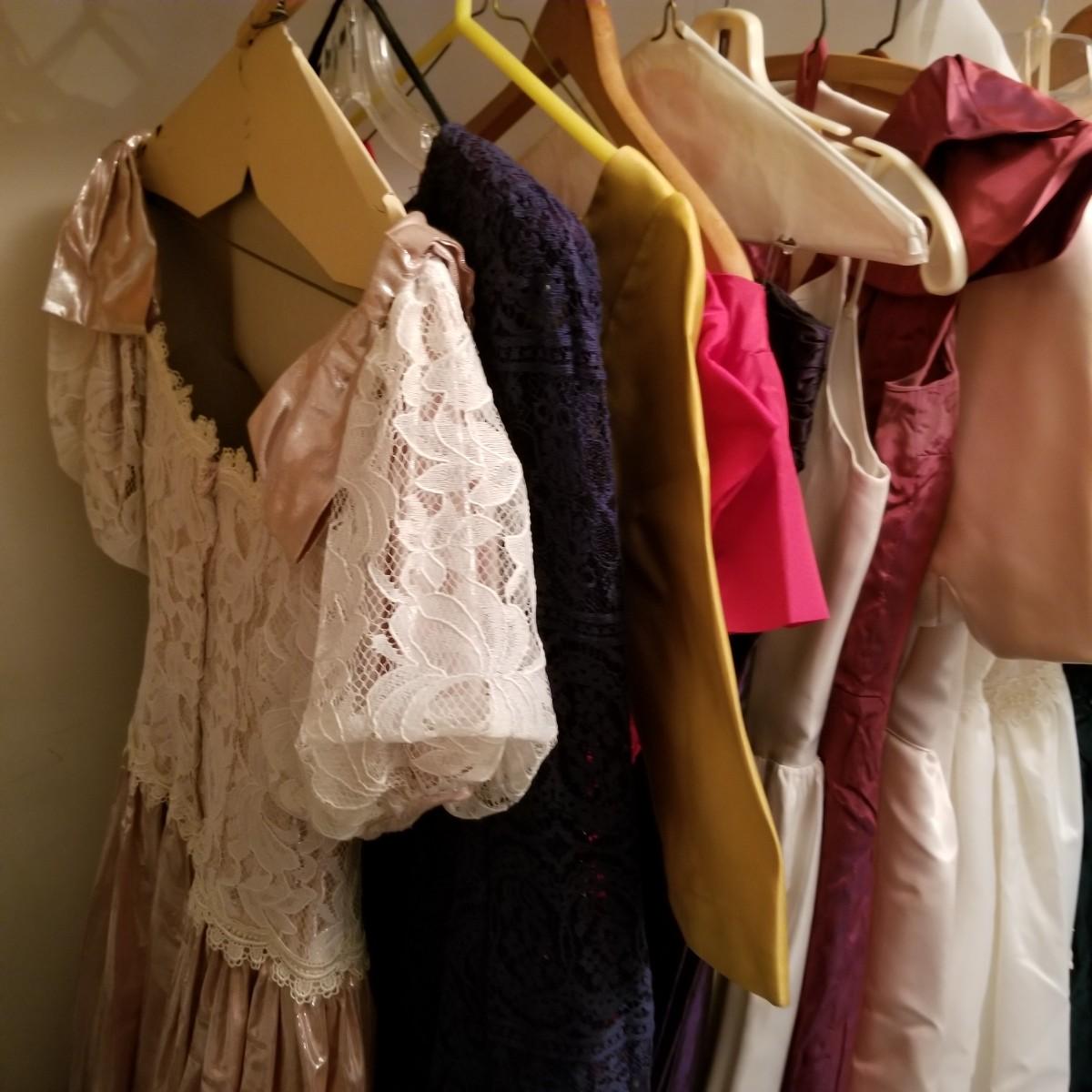Eighteen pieces of elegance. Evening gowns, some with capes or sleeveless. Linen, rayon, acetate and more. One muslin hoop skirt and a set of petticoats. Sizes are mostly 18W, but a couple of smaller items down to 6. All longer styles, most floor length. Many items appear custom made. Most items in good condition. Local pickup only.