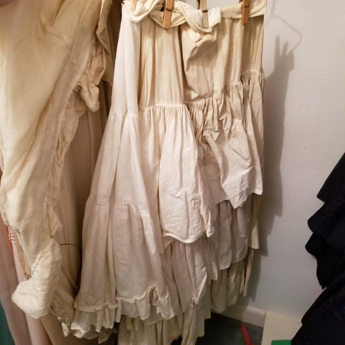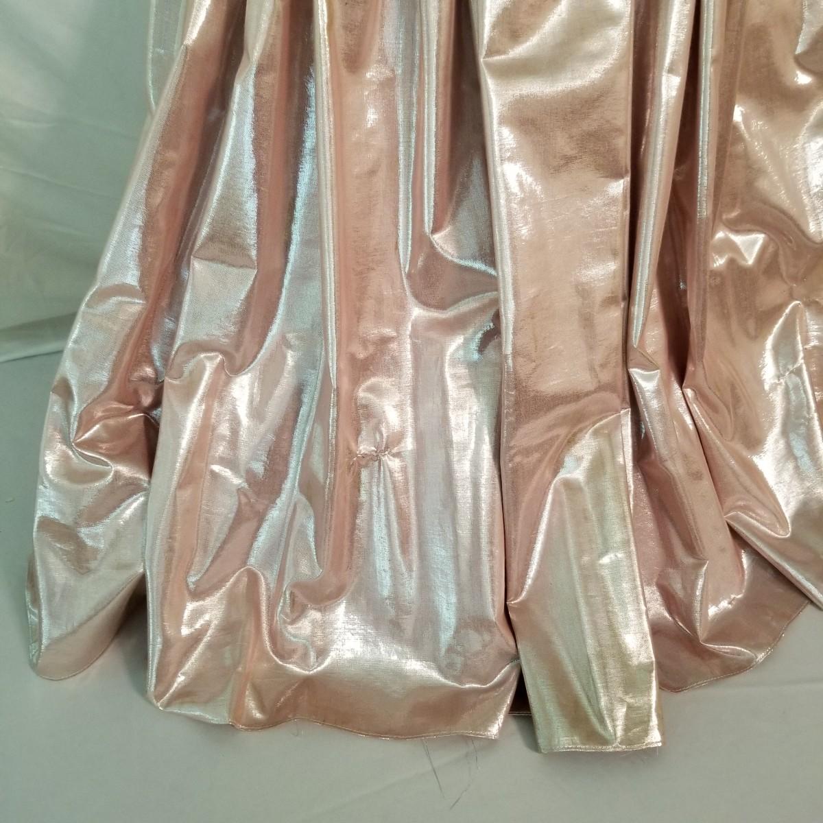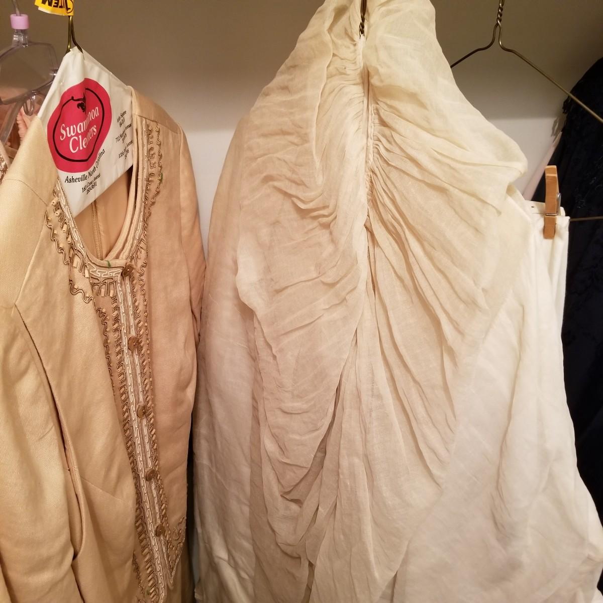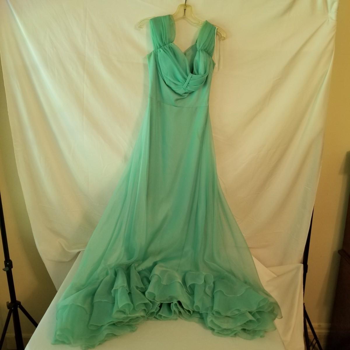 Eighteen pieces of elegance. Evening gowns, some with capes or sleeveless. Linen, rayon, acetate and more. One muslin hoop skirt and a set of petticoats. Sizes are mostly 18W, but a couple of smaller items down to 6. All longer styles, most floor length. Many items appear custom made. Most items in good condition. Local pickup only.