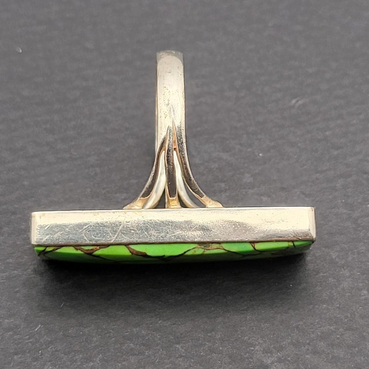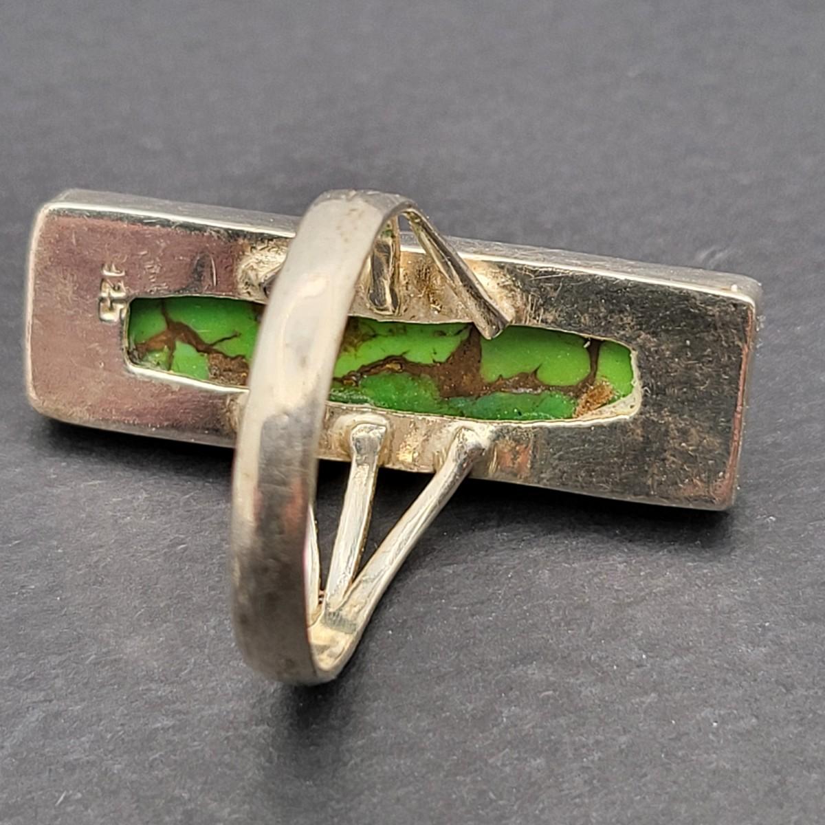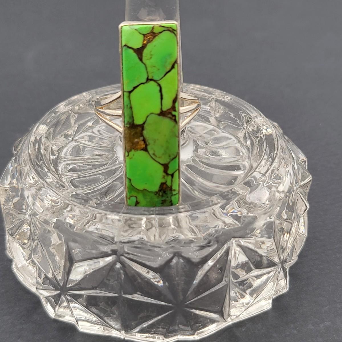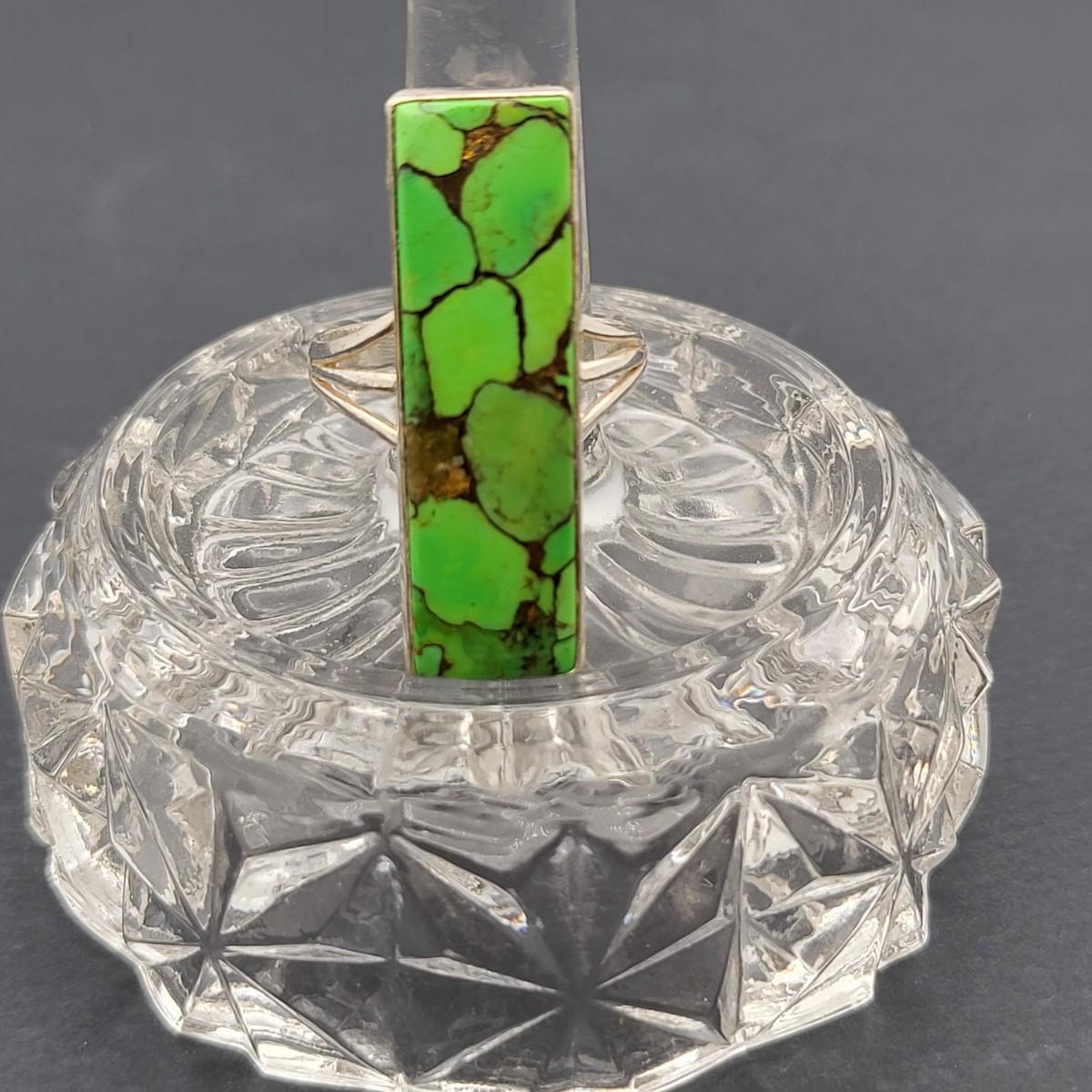 Outstanding, long rectangle green turquoise ring. Size 10. Weighs 7.3 grams.