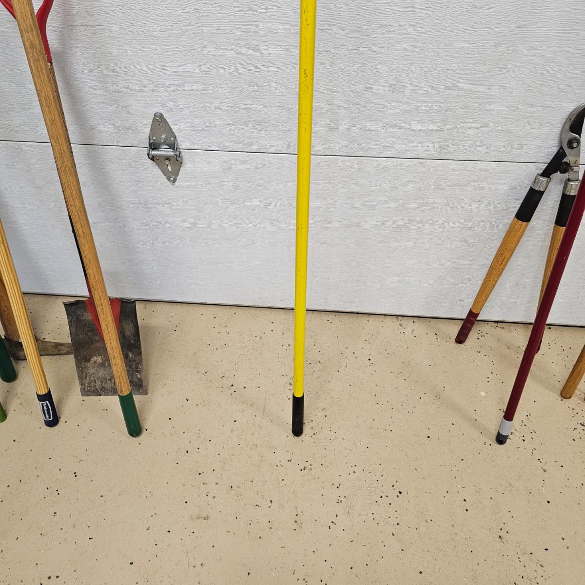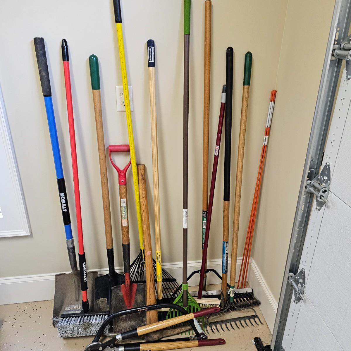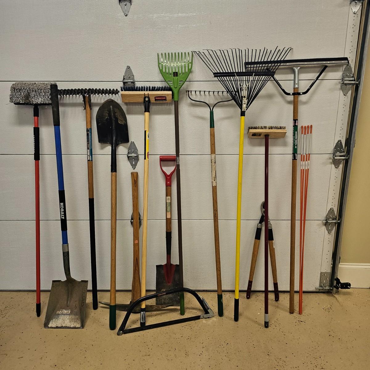 Rakes, shovels, brooms, trimmers, more. Square and round point shovels. Leaf and garden rakes. Long handle loppers. See photos for details. Local pickup only.