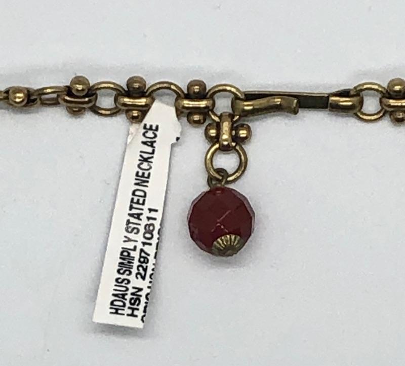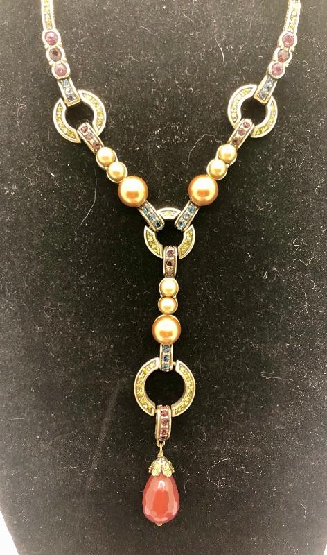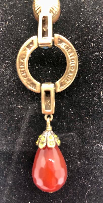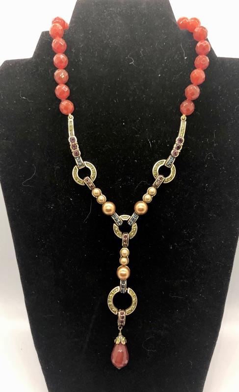Long Heidi Daus red bead necklace. Bead and gold tone Y necklace. Jewel tone Swarovski crystals set in the metal pieces. About 12" to 15" length depending on where you hook it. No missing stones.