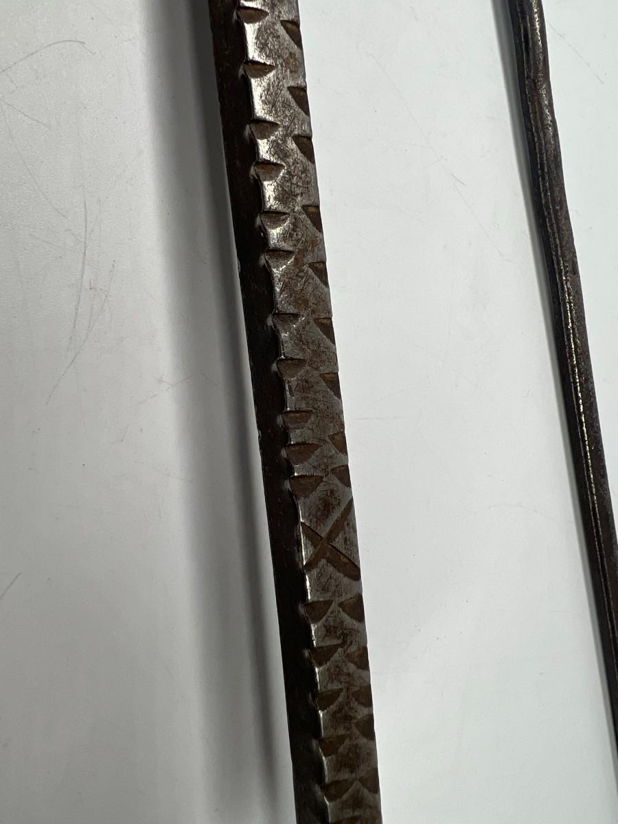 Long Primitive Cast Iron Metal Ladle Spoon & Pronged Poker. In good condition. Spoon is flatter than a soup ladle, and poker has prongs that hook back. Could be used with a fireplace or open fire or just as rustic primitive decor. About 27" length.