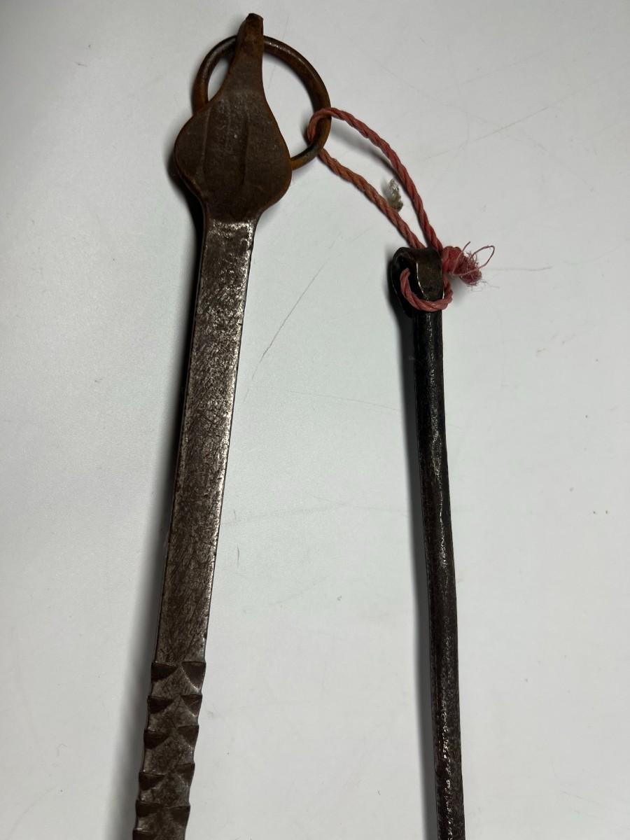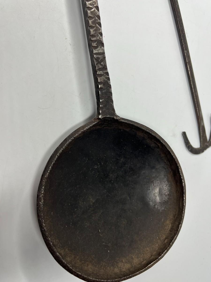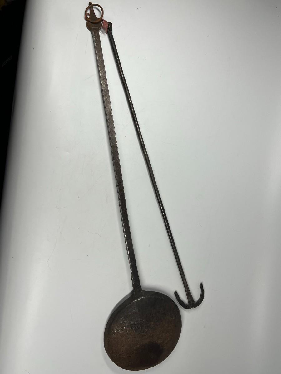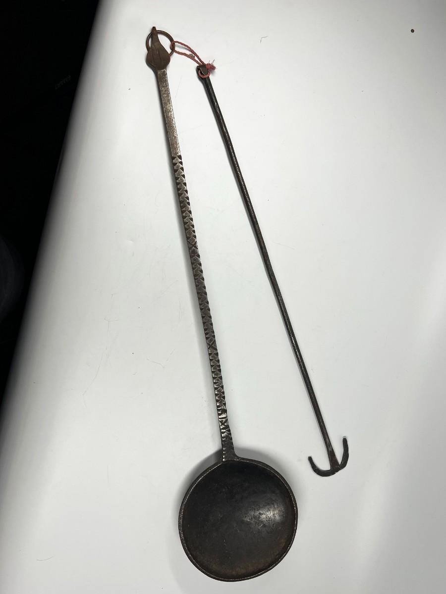 Long Primitive Cast Iron Metal Ladle Spoon & Pronged Poker Fireplace Firepit Tools