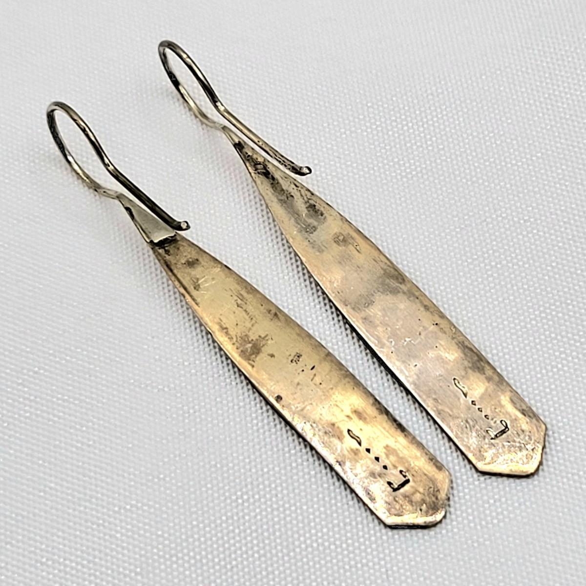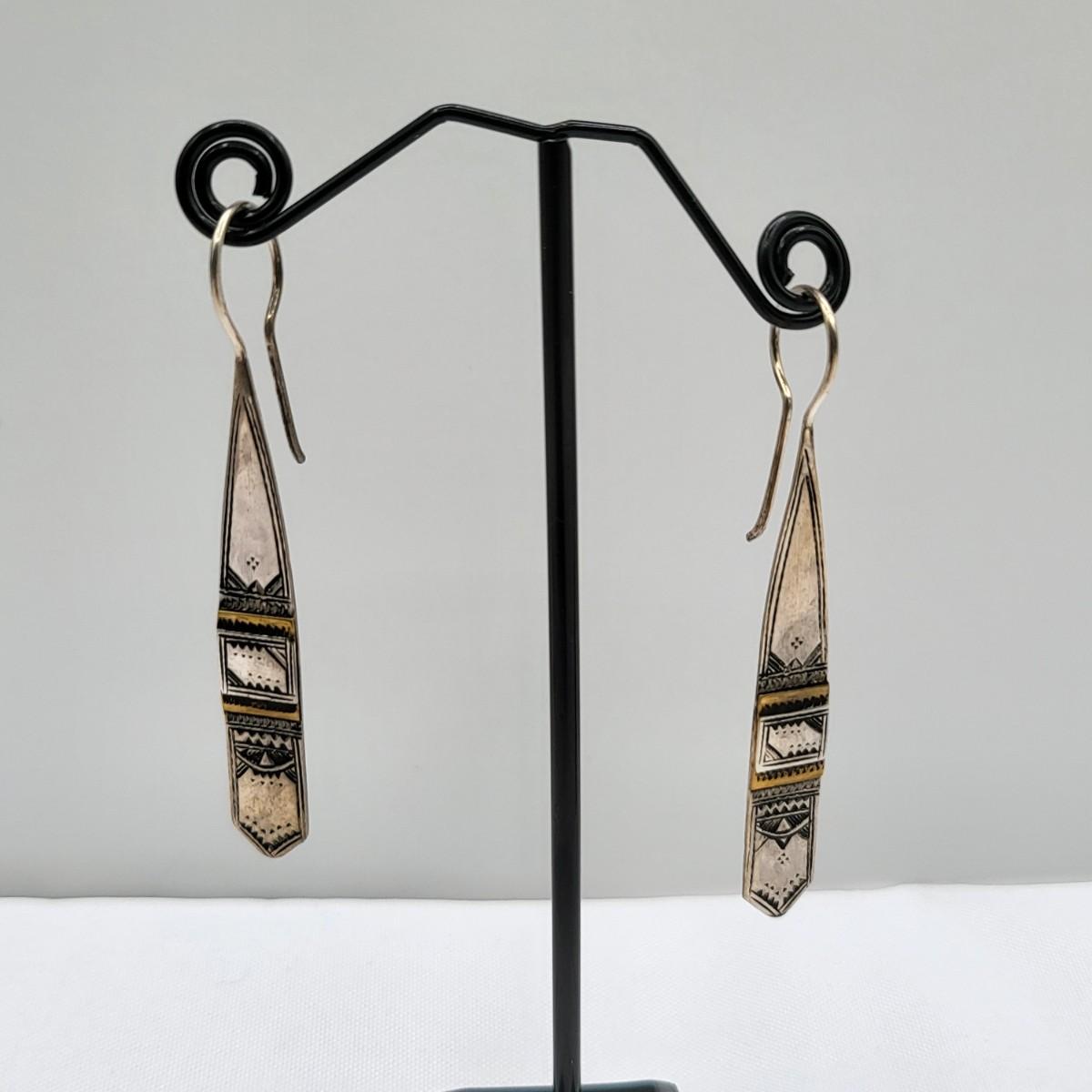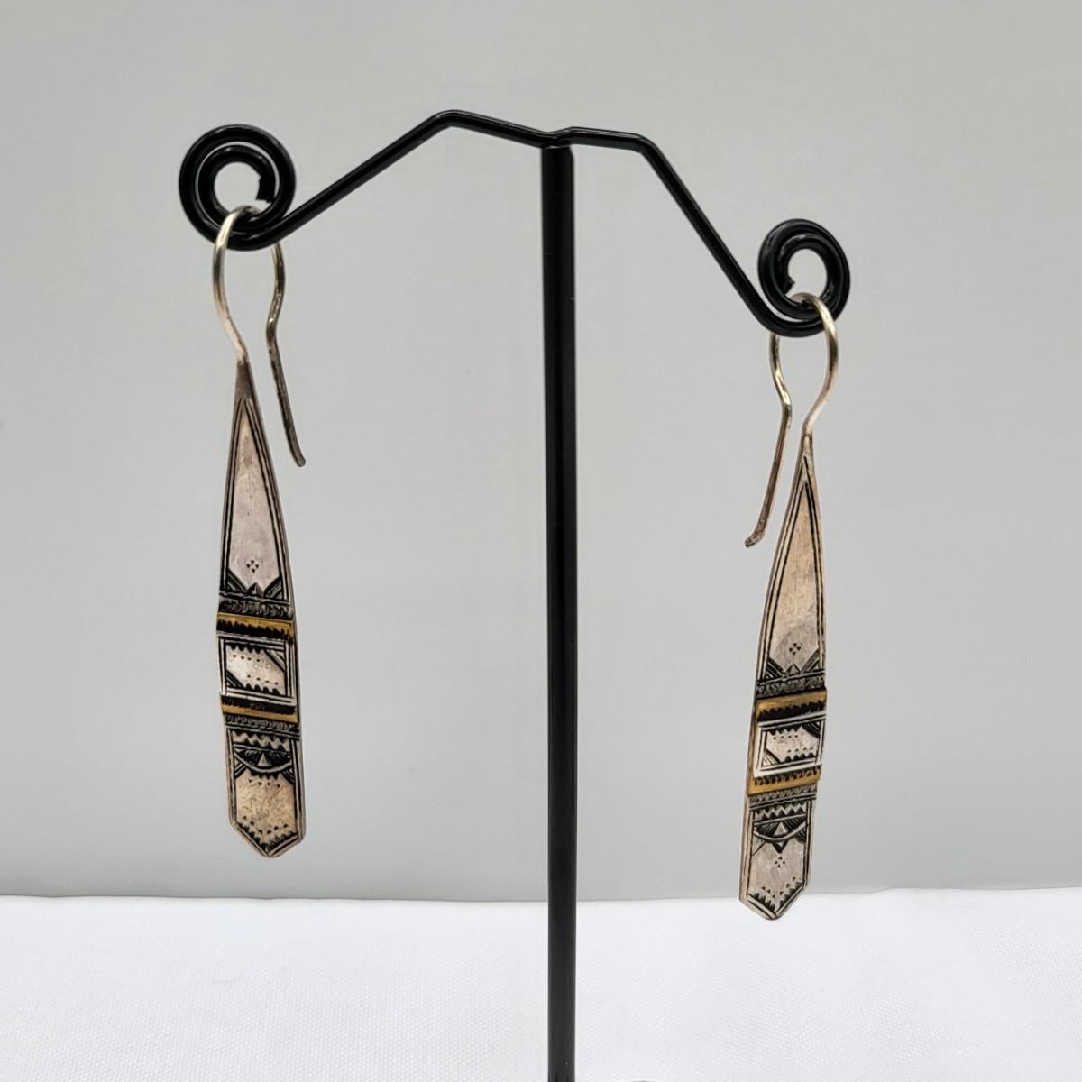 There is an unknown makers mark on the back. Long dangle, silver or silver plated tribal-style shepherd's hook pierced earrings, 2.5" long.