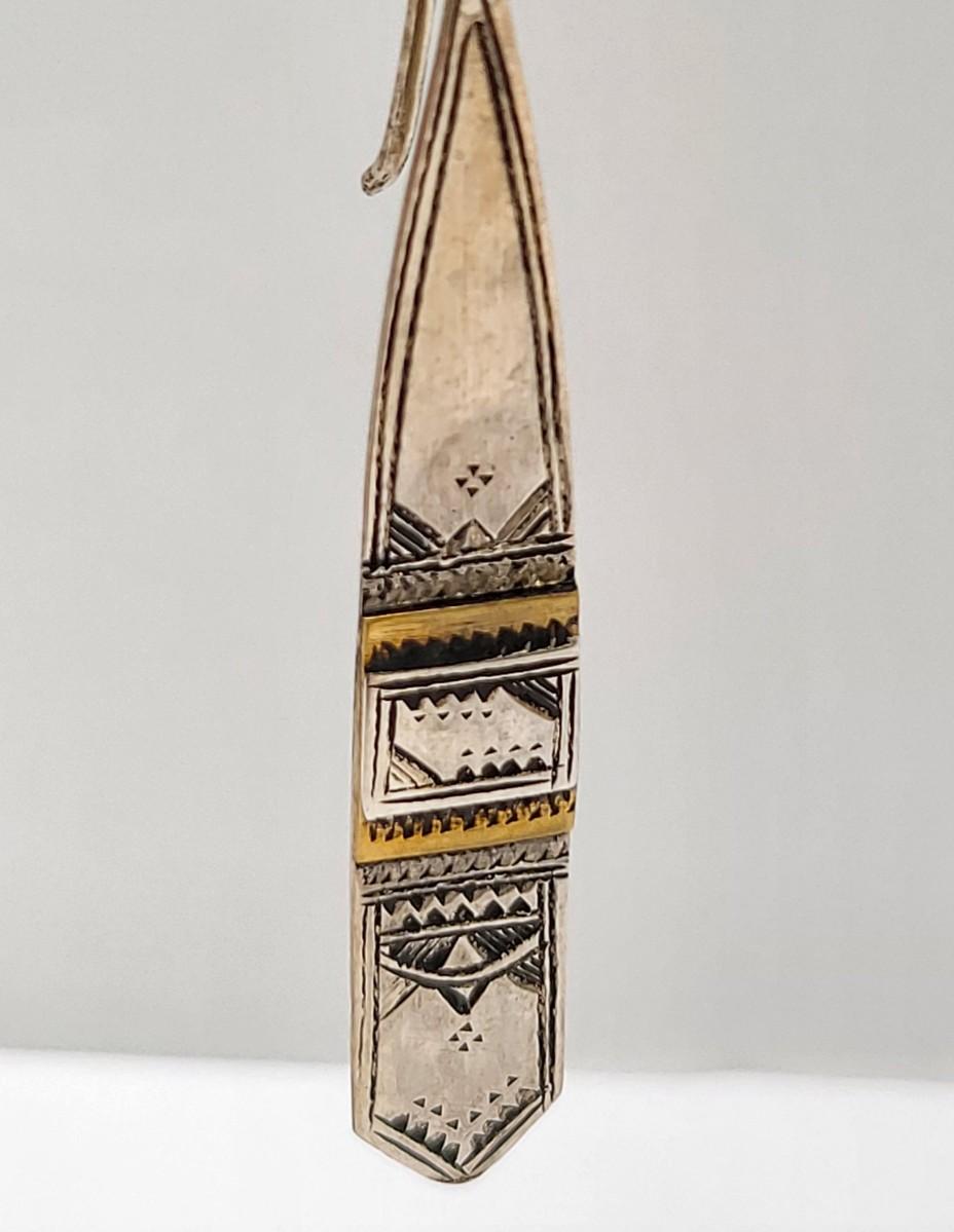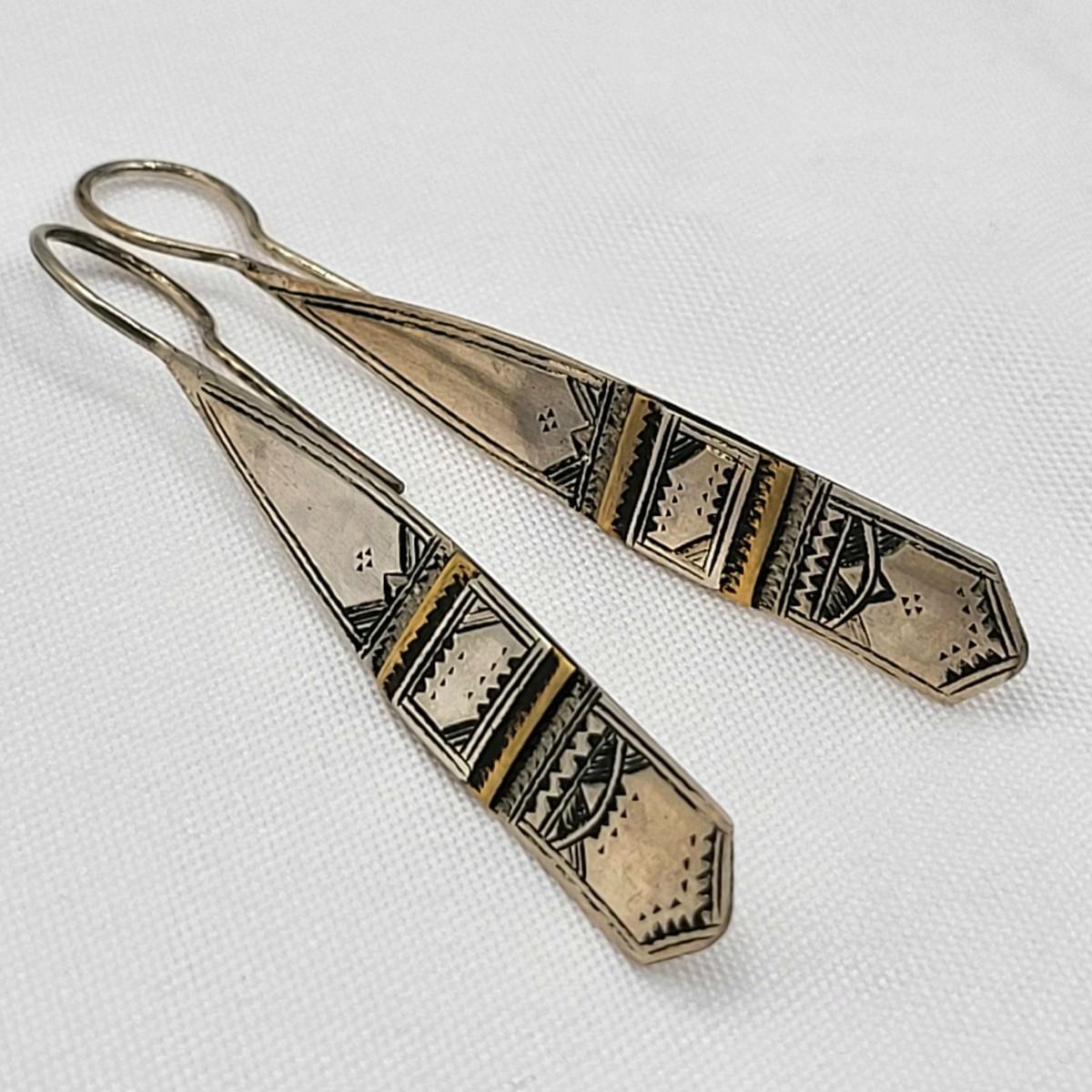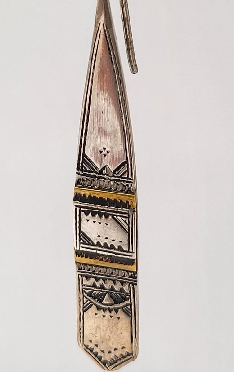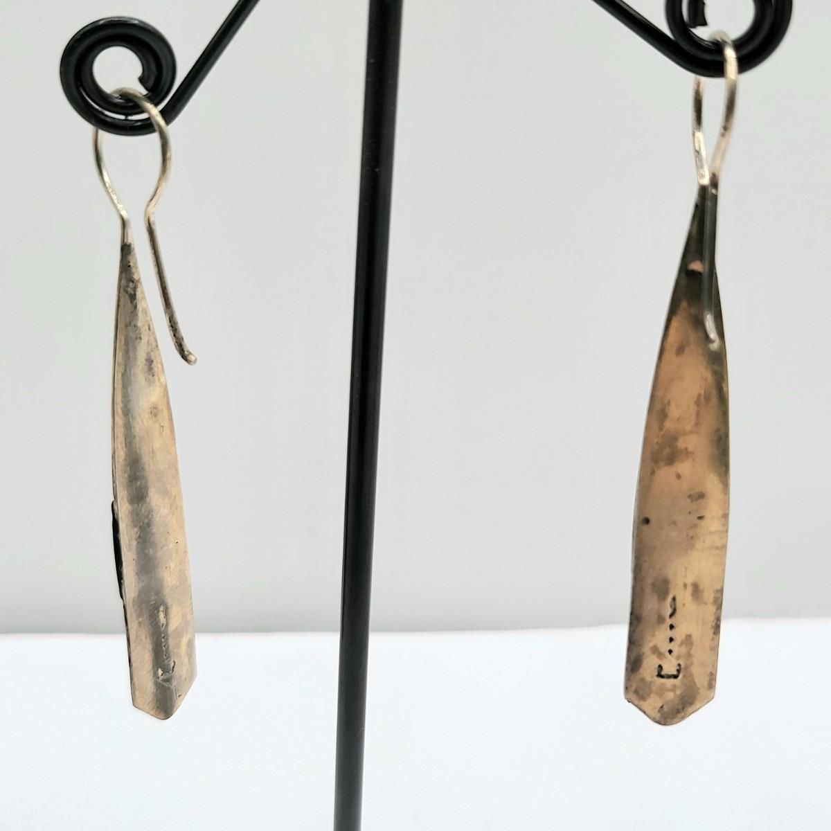 There is an unknown makers mark on the back. Long dangle, silver or silver plated tribal-style shepherd's hook pierced earrings, 2.5" long.
