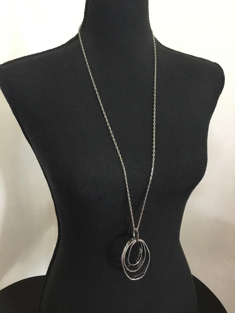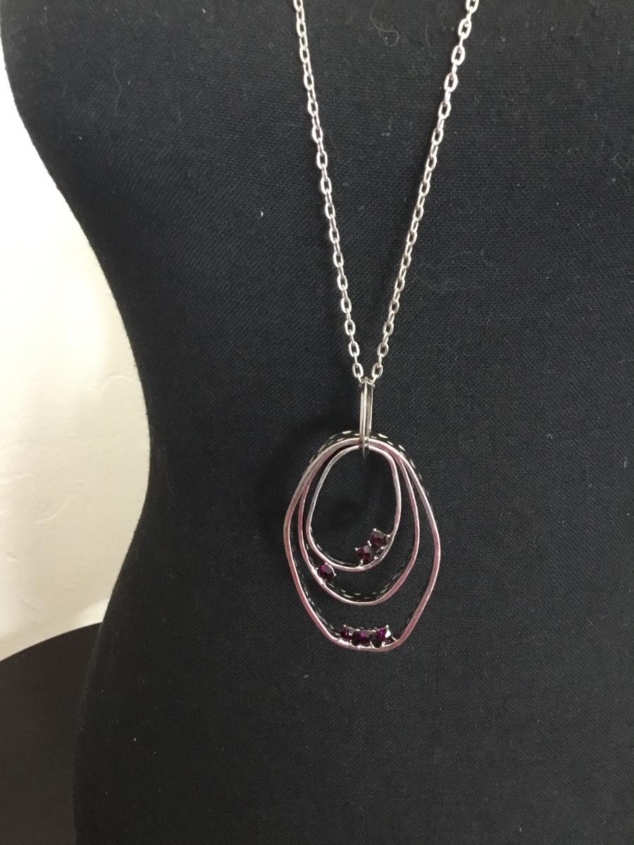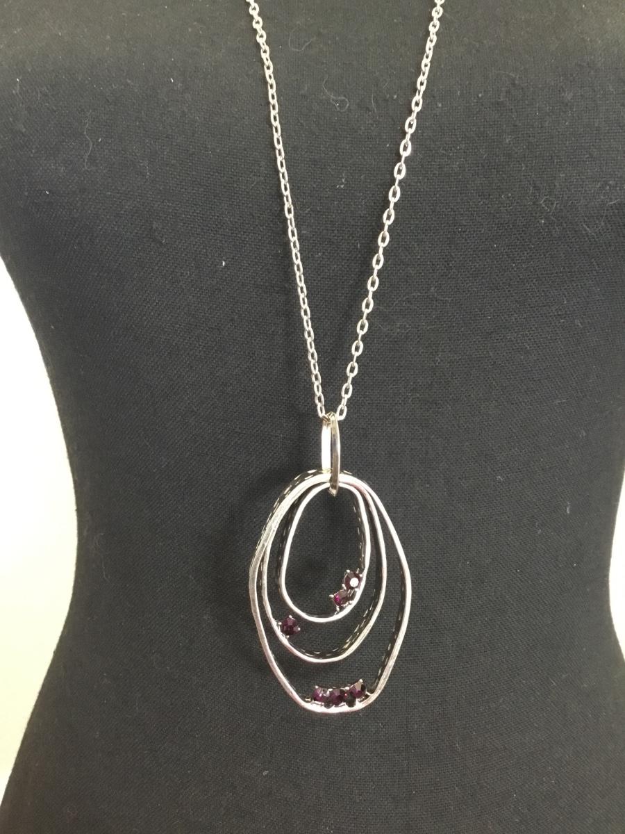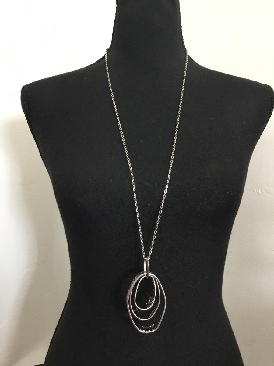 Long, silver, toned, purple rhinestone necklace