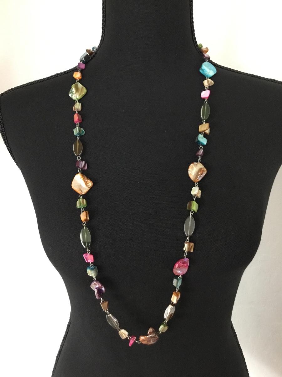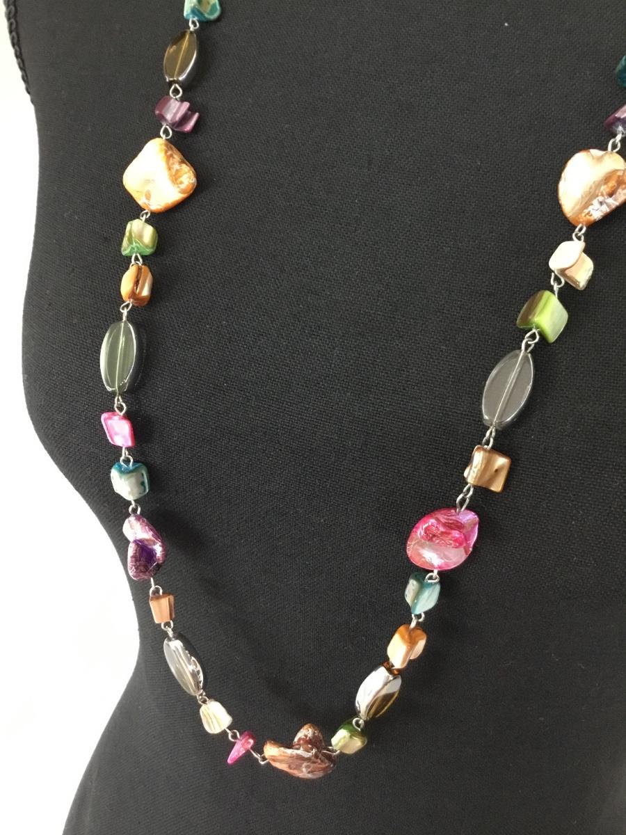 Long single-strand necklace with bright, large pink and turquoise colored asymetrical beads decorated with silver, 36 inches long