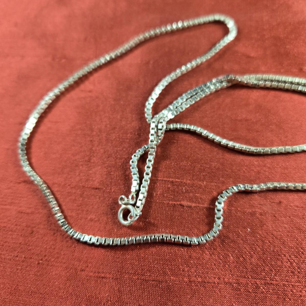 This auction lot is for a Long Sterling Box Chain Necklace. It is a lovely 24-inch Sterling Silver Box chain necklace. It weighs about .514 ozt. It is in very good condition and ready for wear.