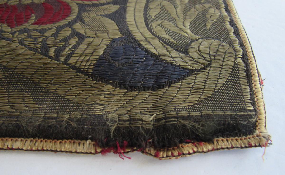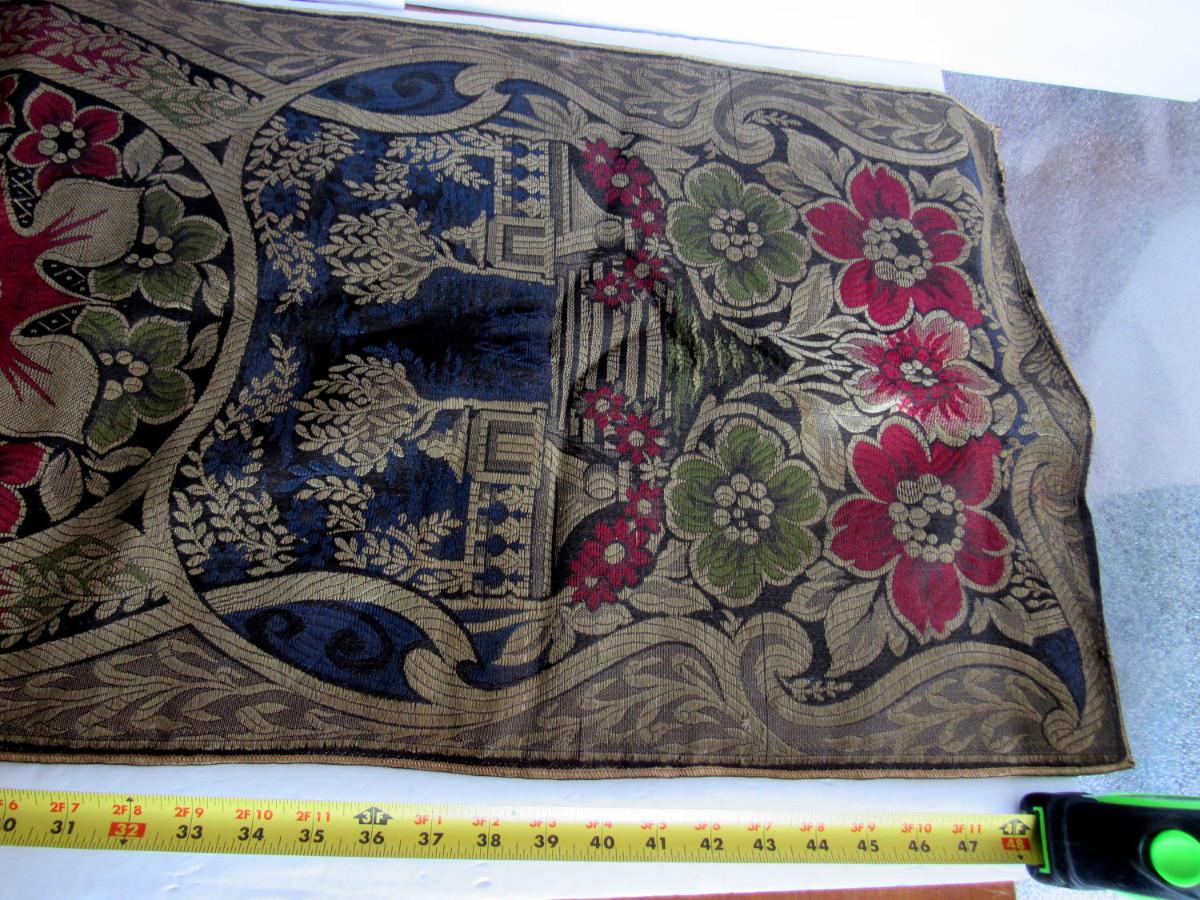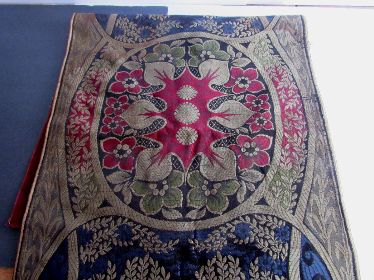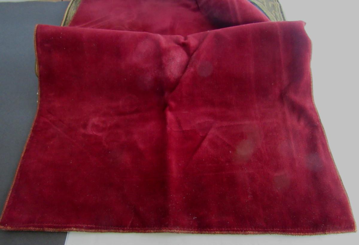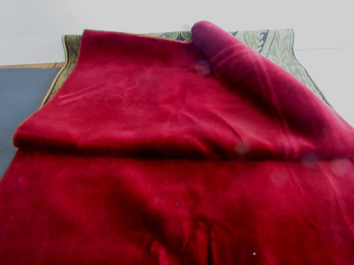 Small areas of stains, damaged hem at one edge, thread flaw, see magnified photos. Velvet is more maroon in color than pink. Overall nice and unusual pattern. Shipping is available at actual cost plus $5.00 per box handling and supply fee. See our terms for details. All sales final.