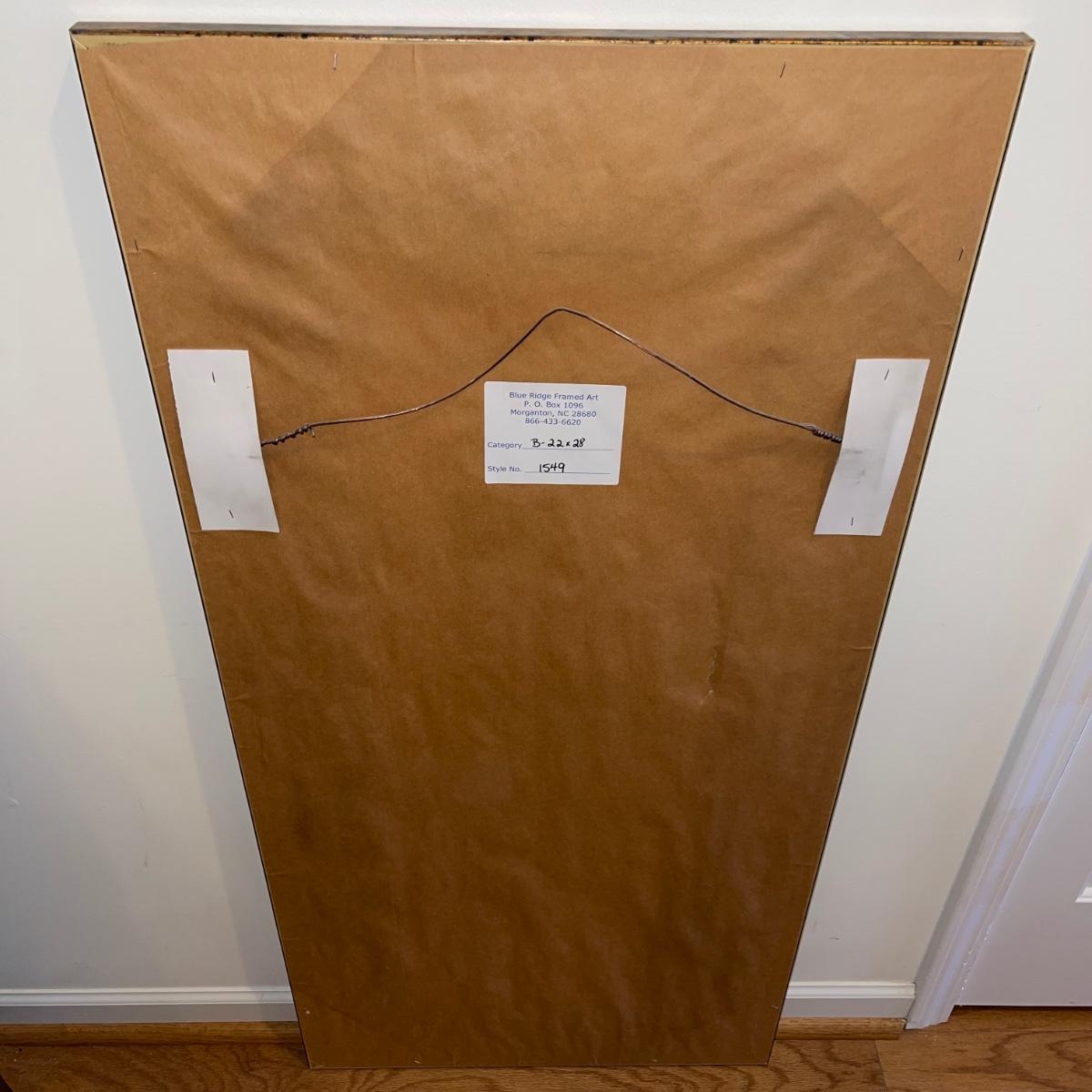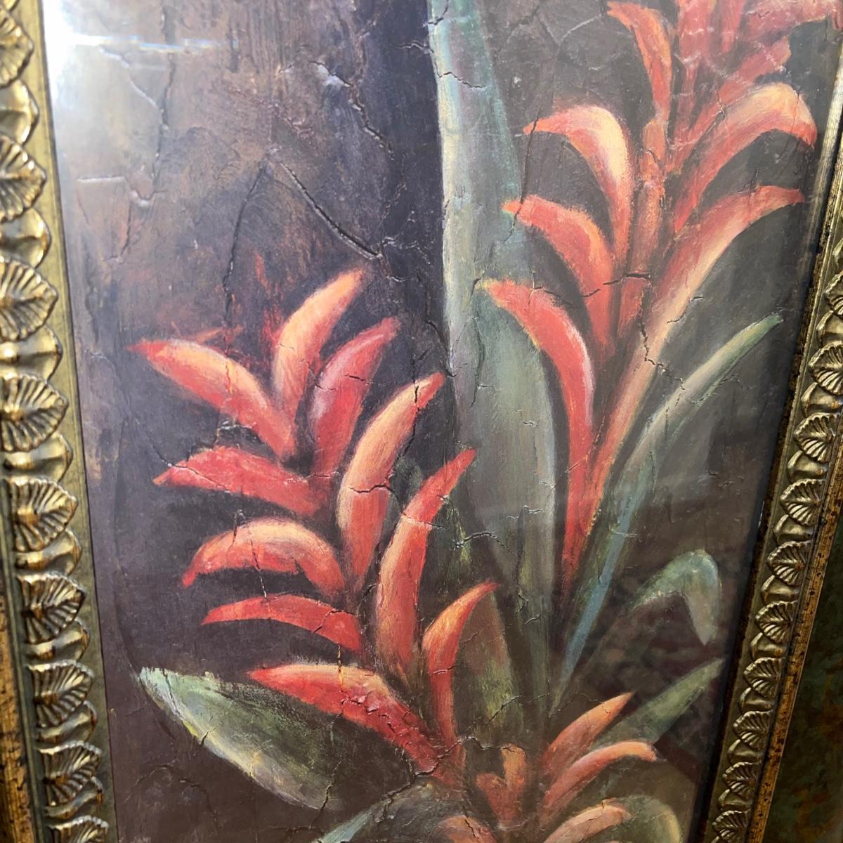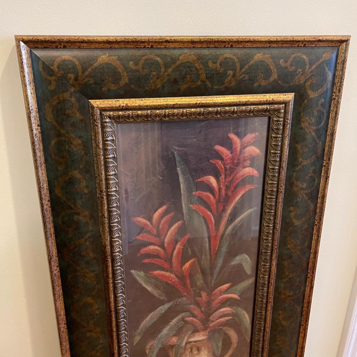 Artwork of a tropical plant in a vase with a long green and gold colored frame. It was framed by Blue Ridge Framed Art and measures 22” x 46”. The artwork itself appears to be textured.