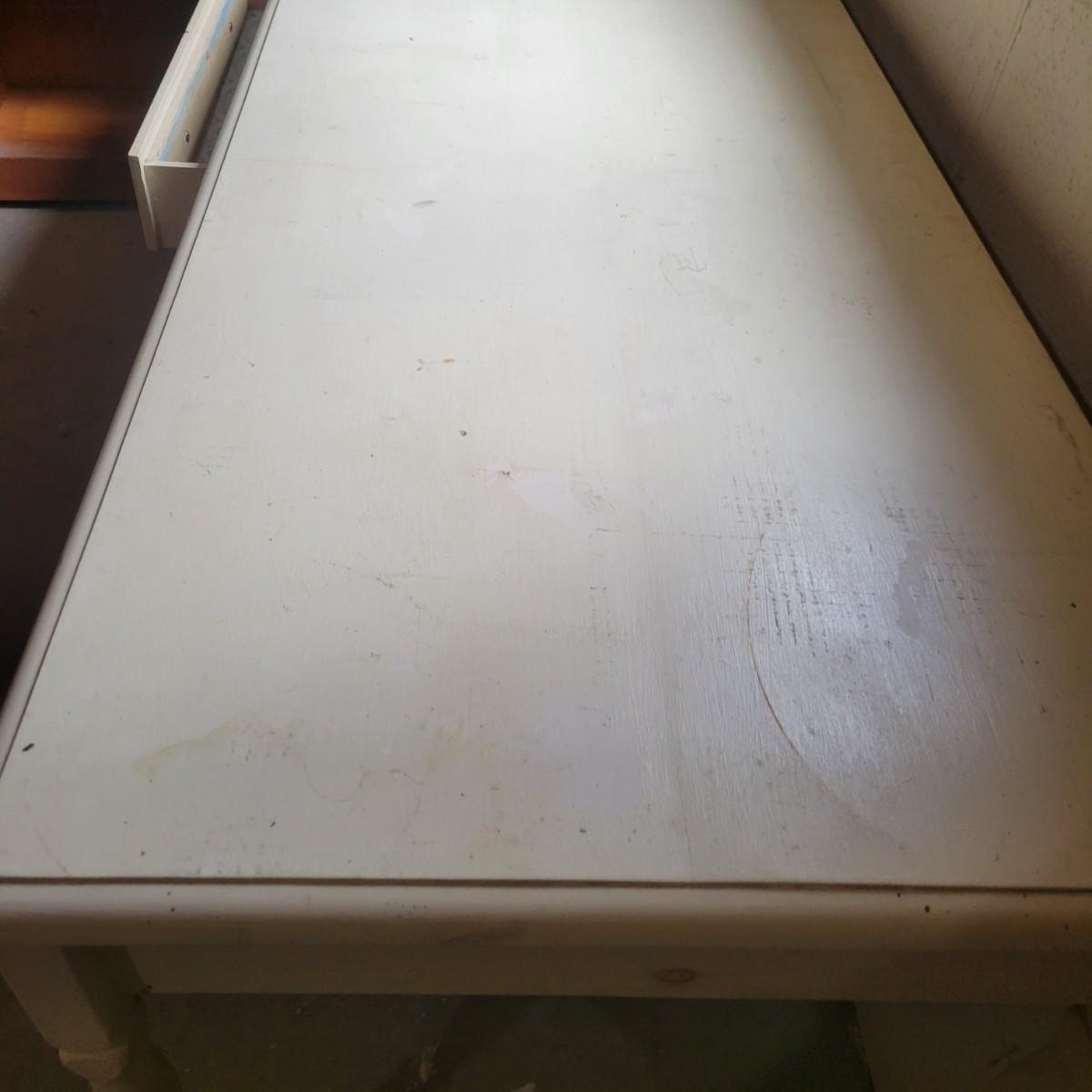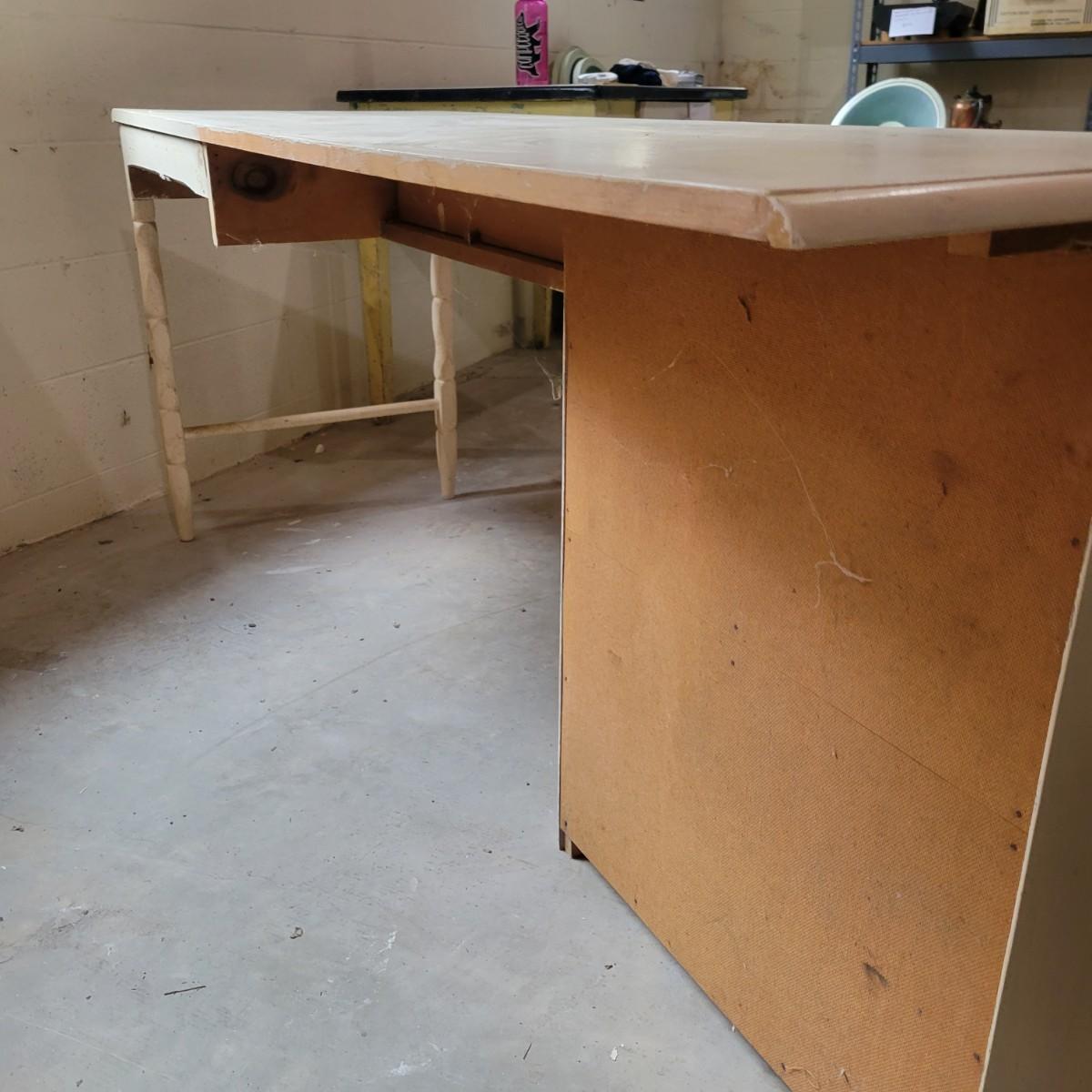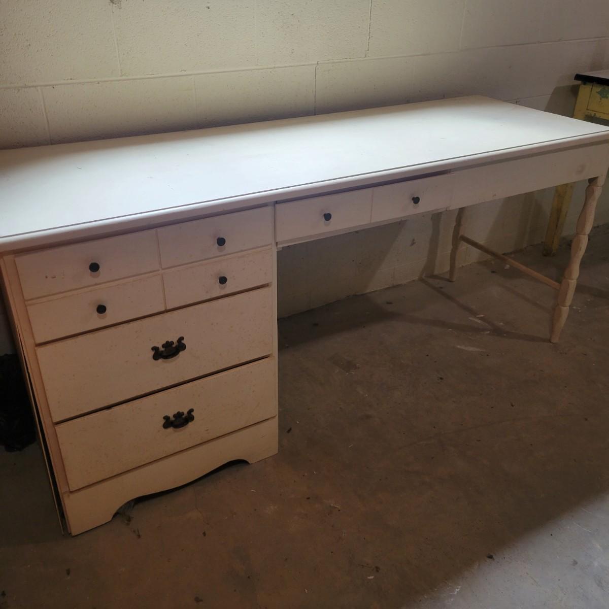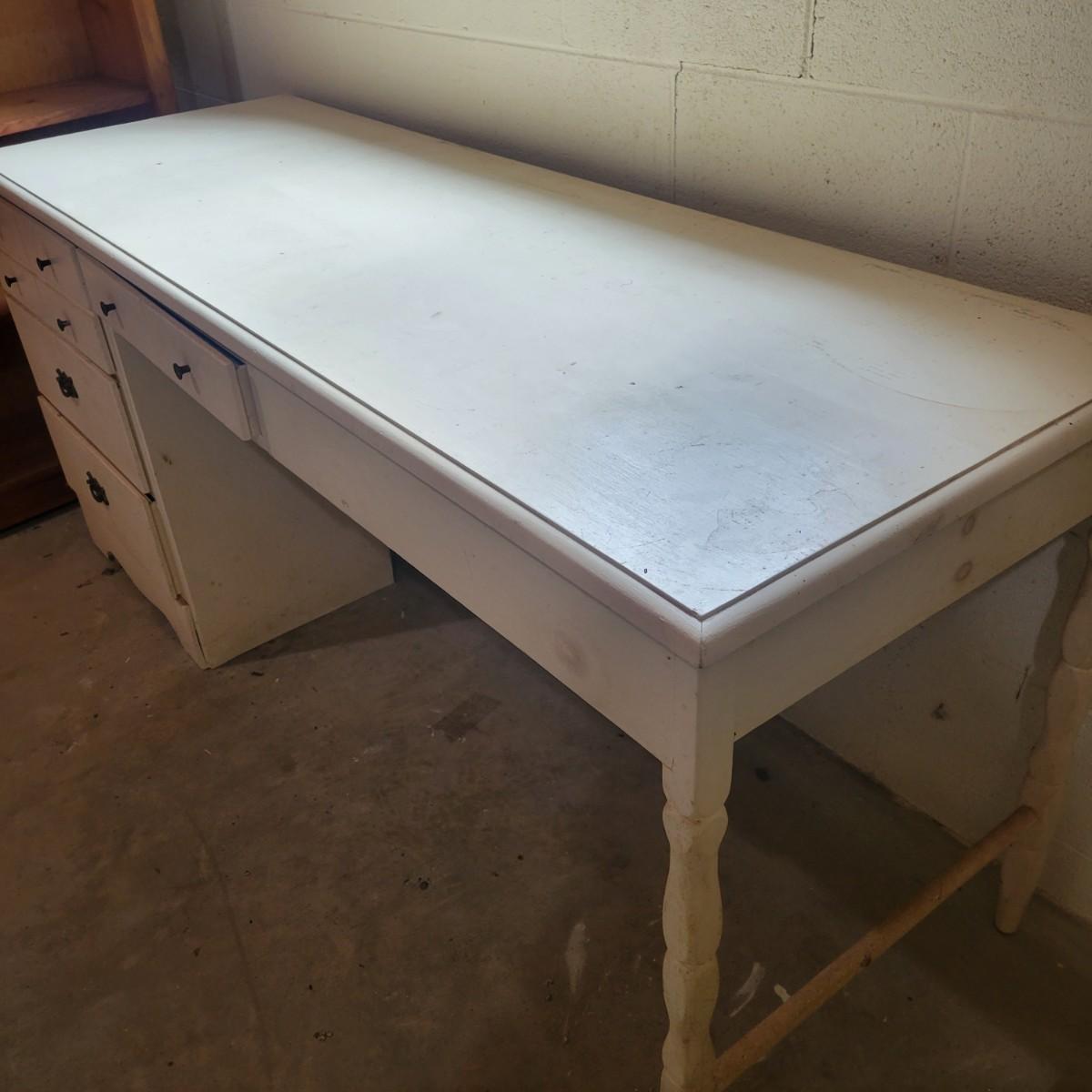 A white wooden desk that features four drawers, brass hardware and a large working surface. Measures approximately 23" x 67" x 29.5". Desk is in fair condition with some scratches and one end of the desk is coming loose, though it can be repaired. Local pickup only. Winning bidder must bring assistance to help move and load this item due to its weight and/or size. Item is in a basement, but no stairs involved.