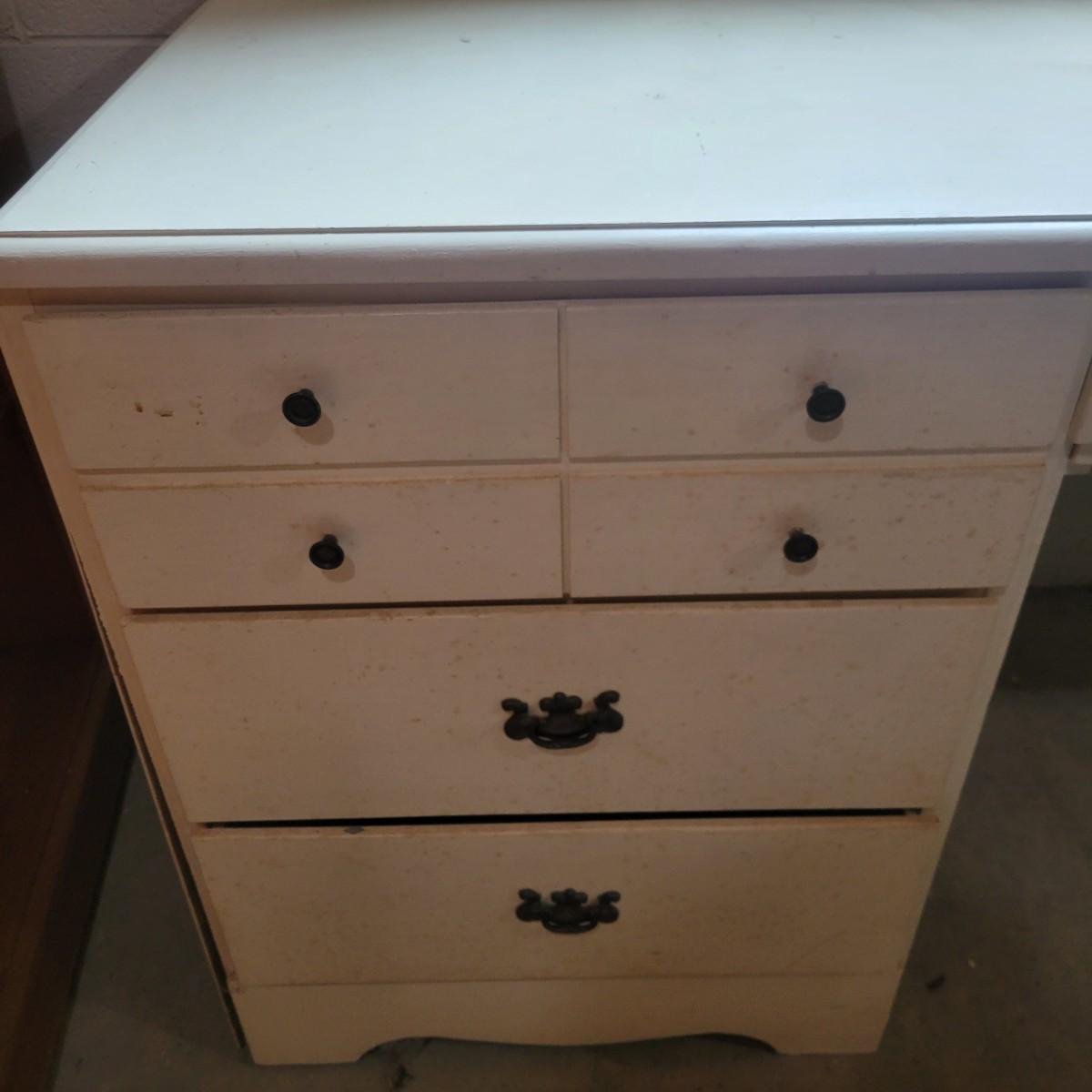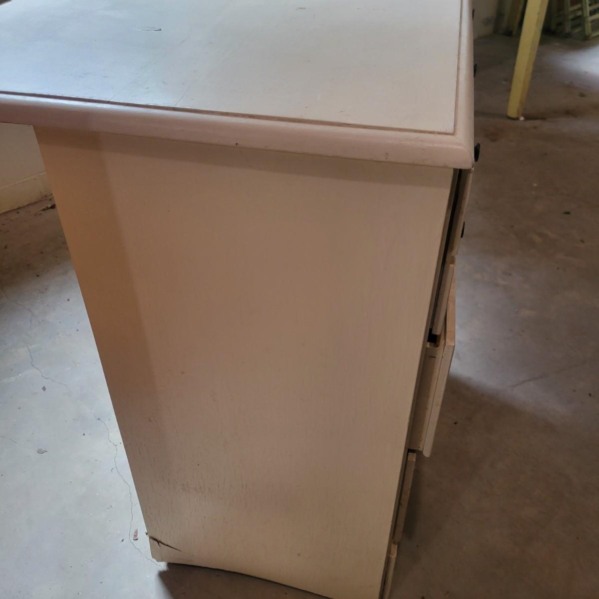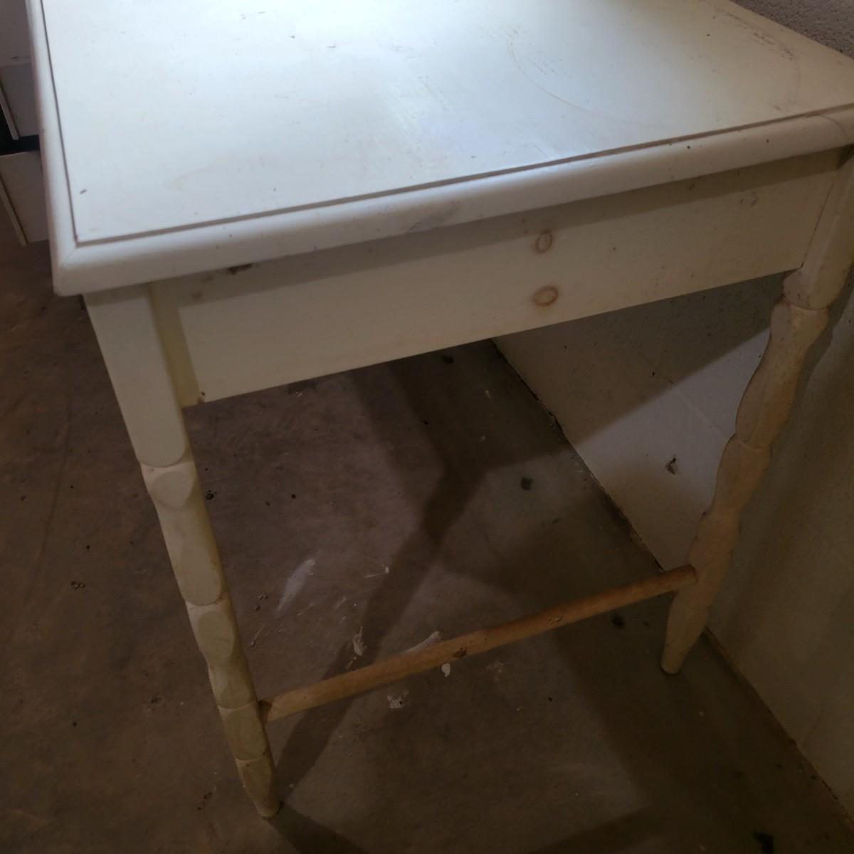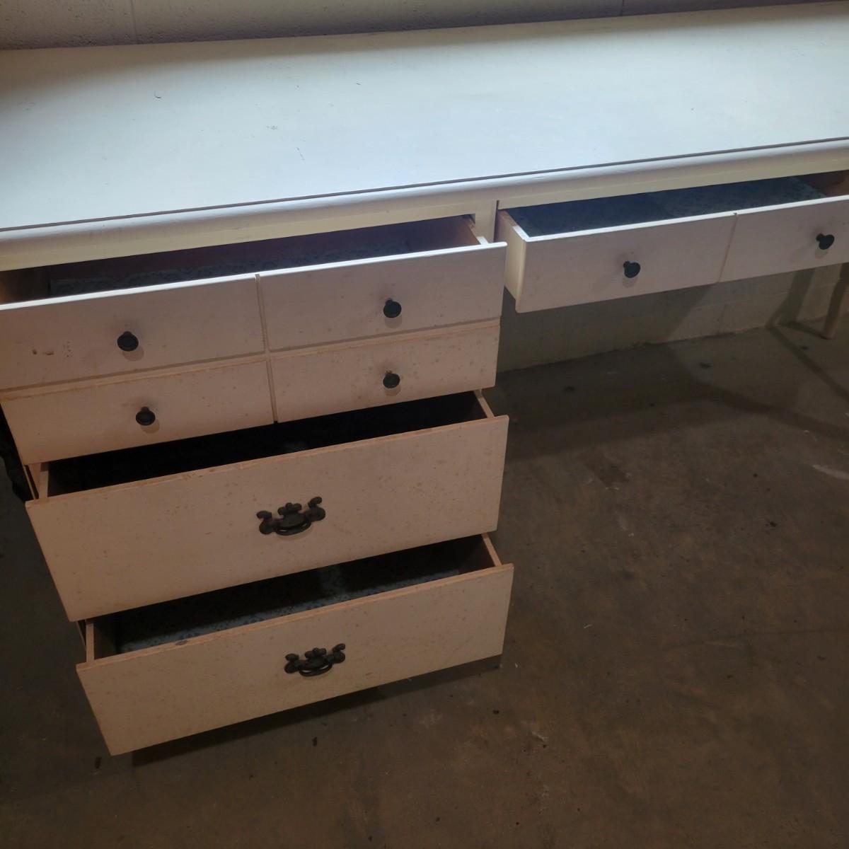 A white wooden desk that features four drawers, brass hardware and a large working surface. Measures approximately 23" x 67" x 29.5". Desk is in fair condition with some scratches and one end of the desk is coming loose, though it can be repaired. Local pickup only. Winning bidder must bring assistance to help move and load this item due to its weight and/or size. Item is in a basement, but no stairs involved.