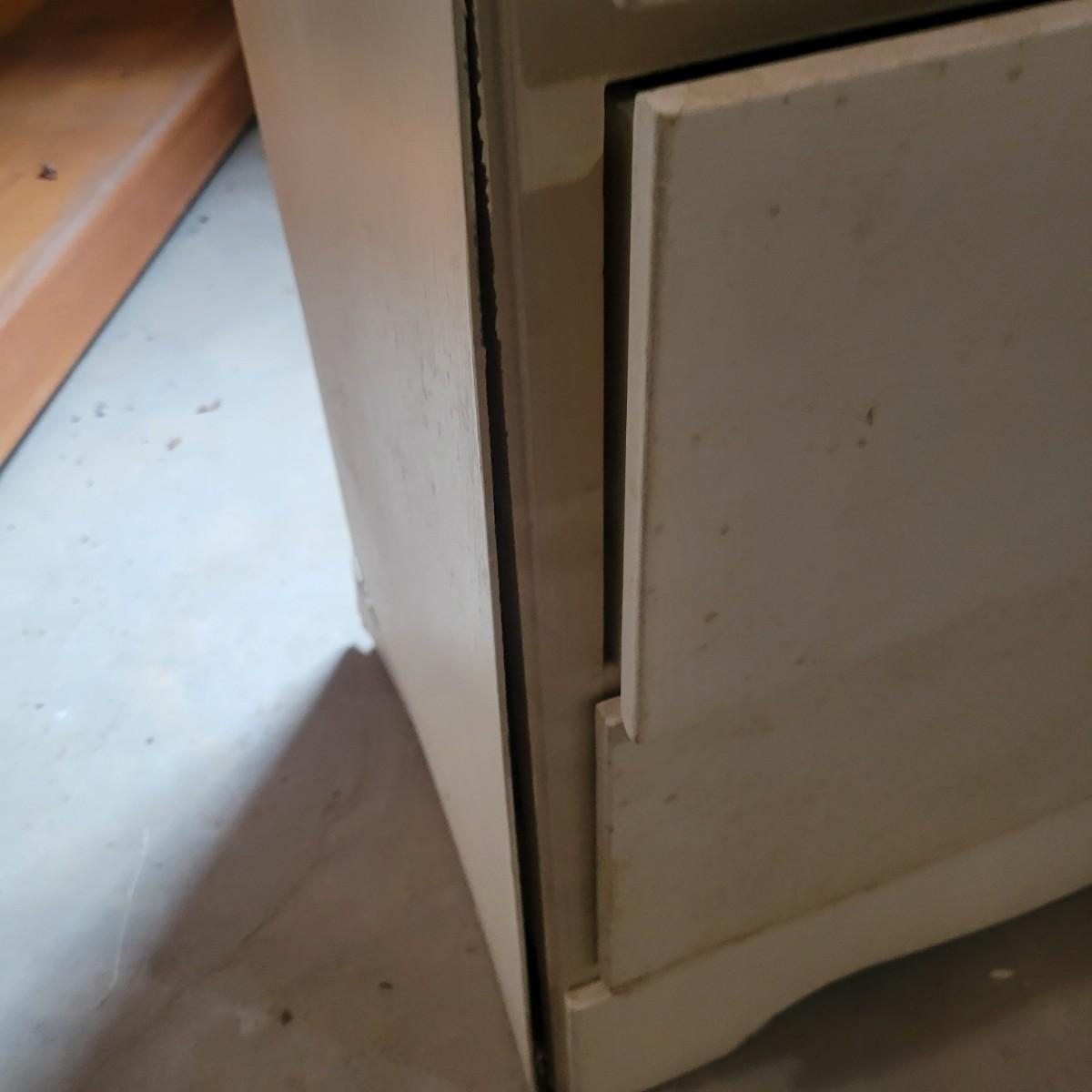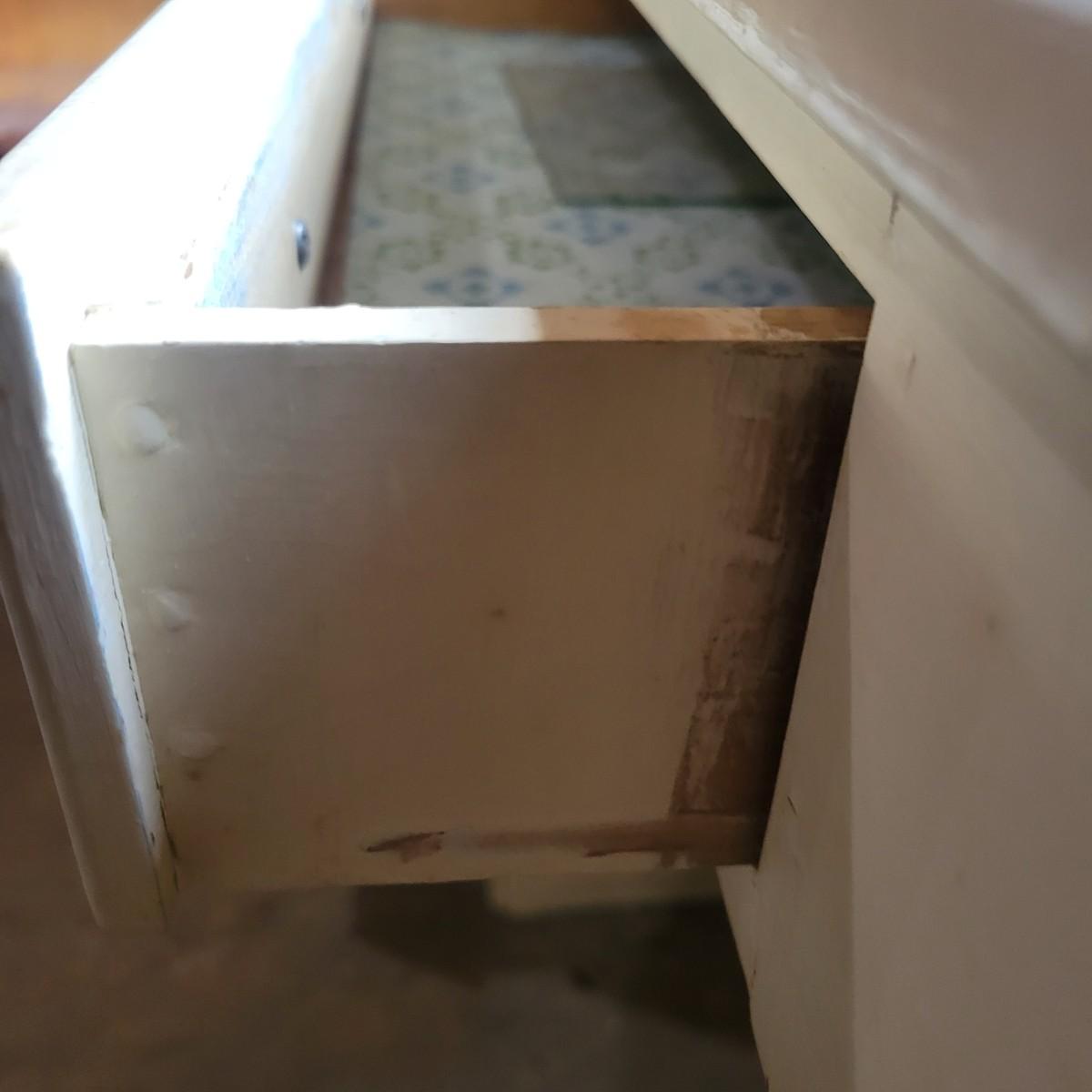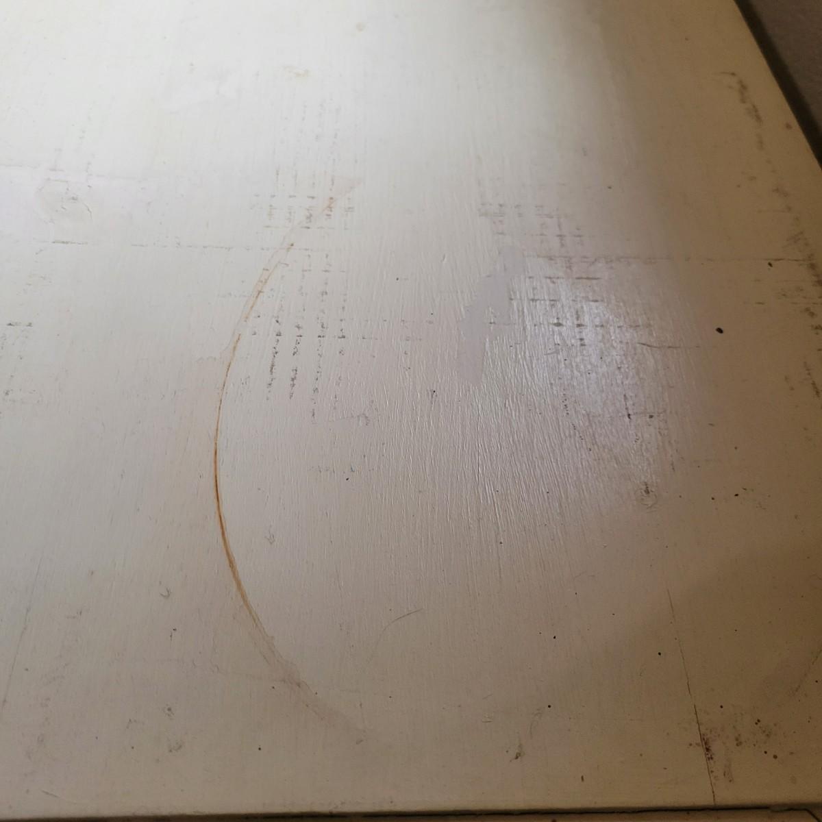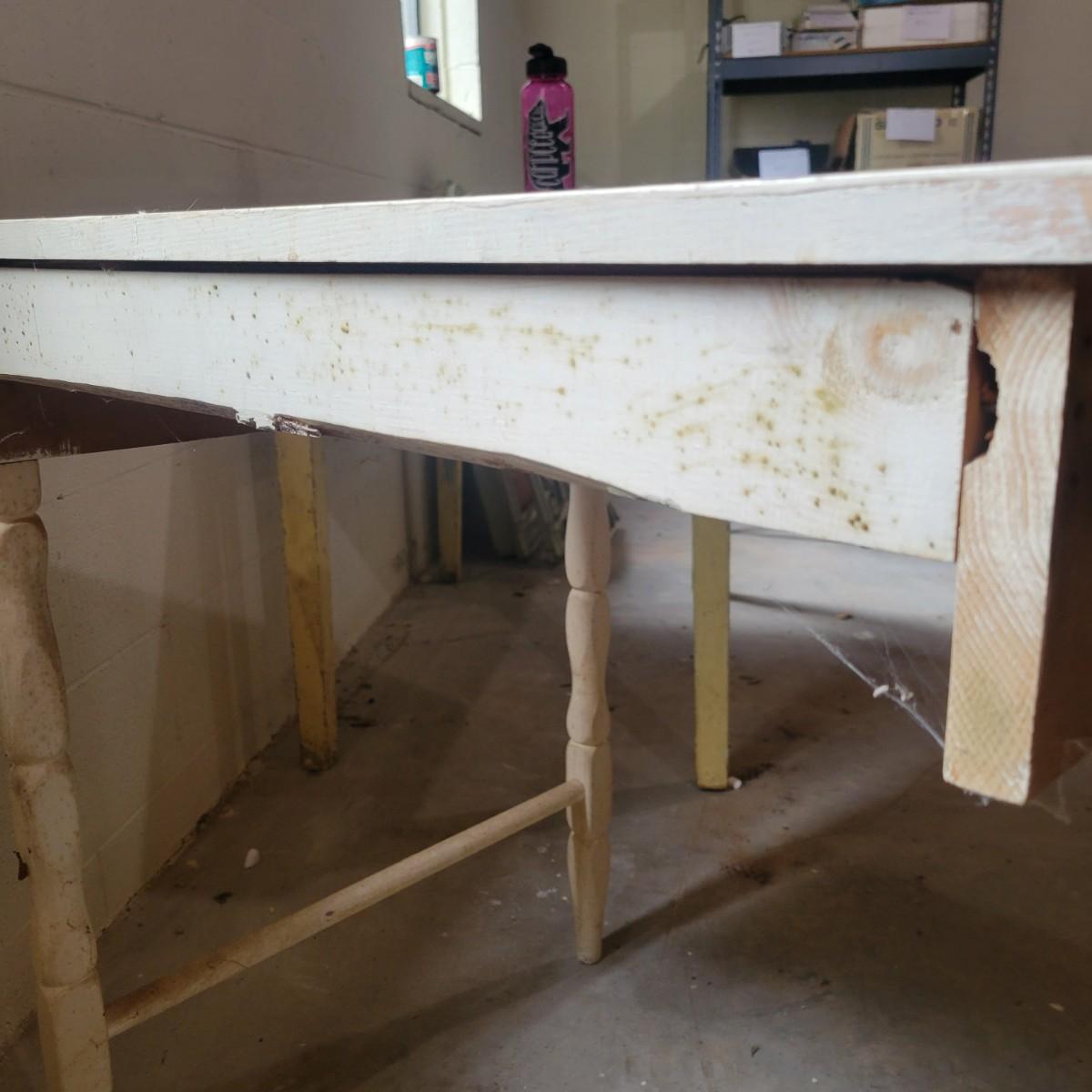 A white wooden desk that features four drawers, brass hardware and a large working surface. Measures approximately 23" x 67" x 29.5". Desk is in fair condition with some scratches and one end of the desk is coming loose, though it can be repaired. Local pickup only. Winning bidder must bring assistance to help move and load this item due to its weight and/or size. Item is in a basement, but no stairs involved.