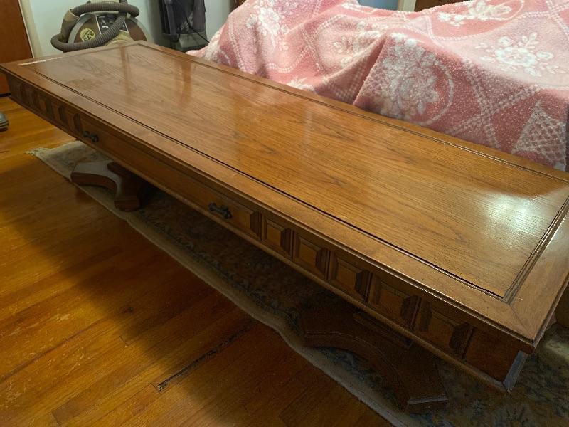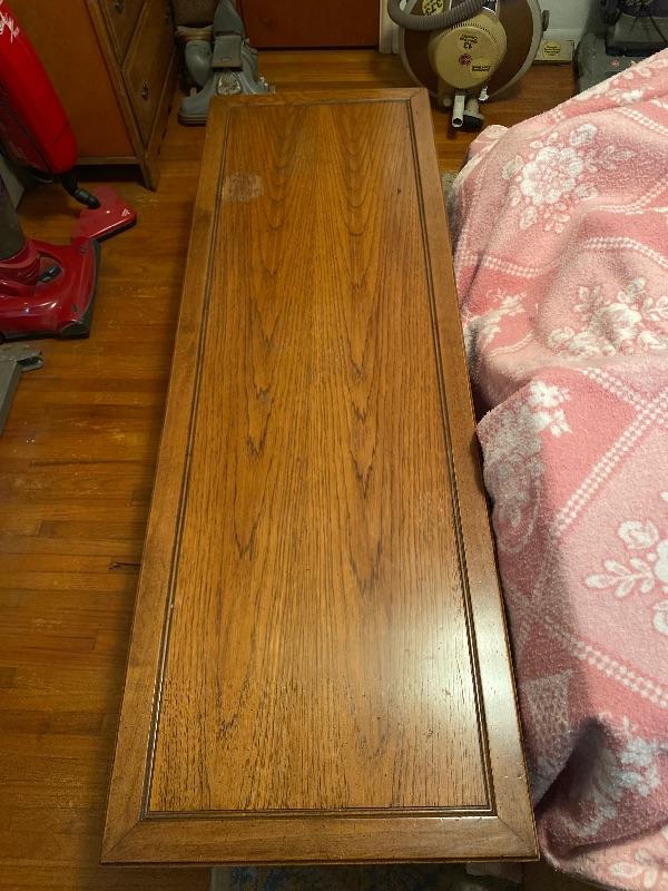 Long and slender wood coffee table. Has some signs of use to the surface, needs refinish or paint, no major scratches or damage. Measures 60”x20” and is 16” tall.