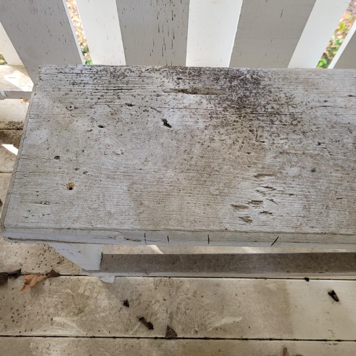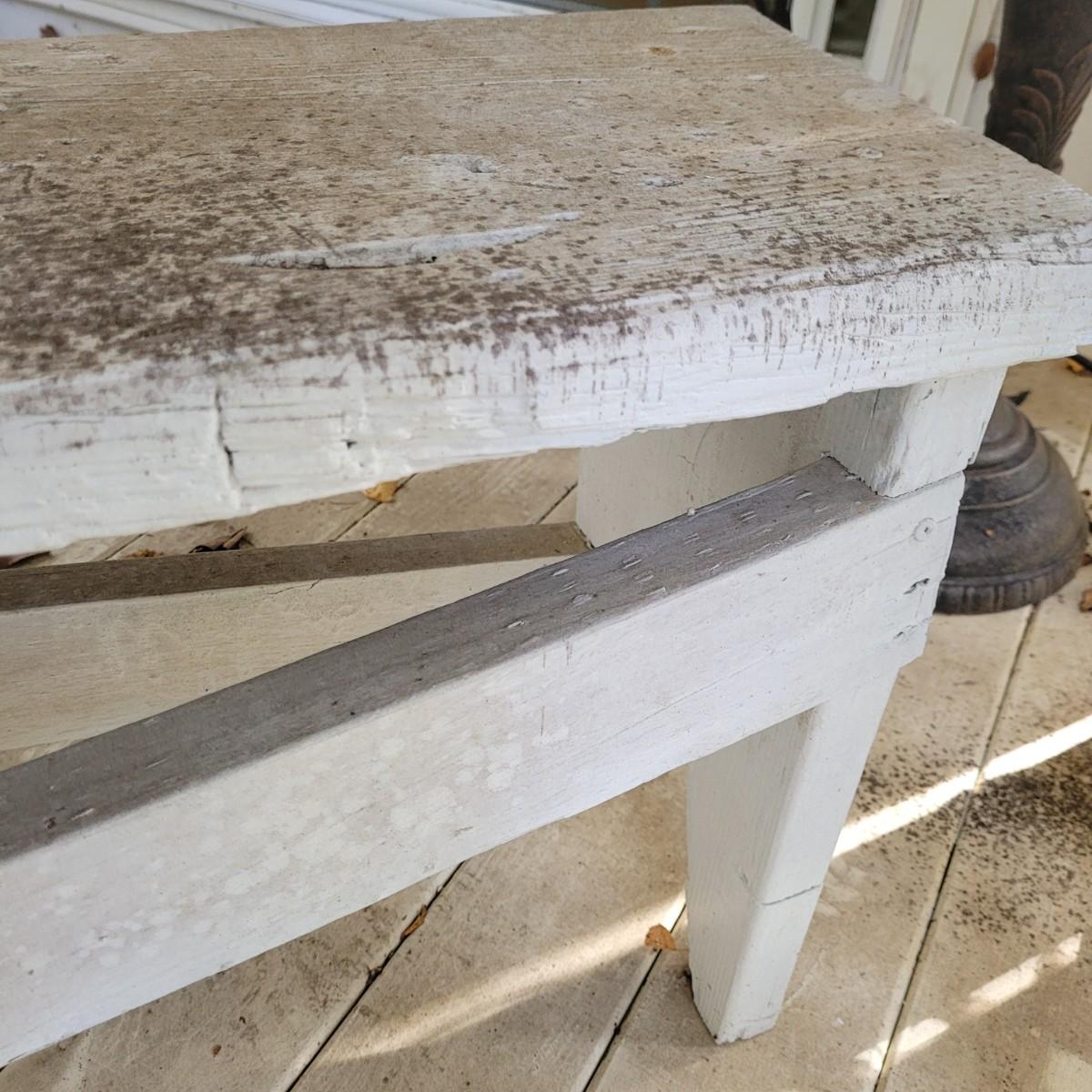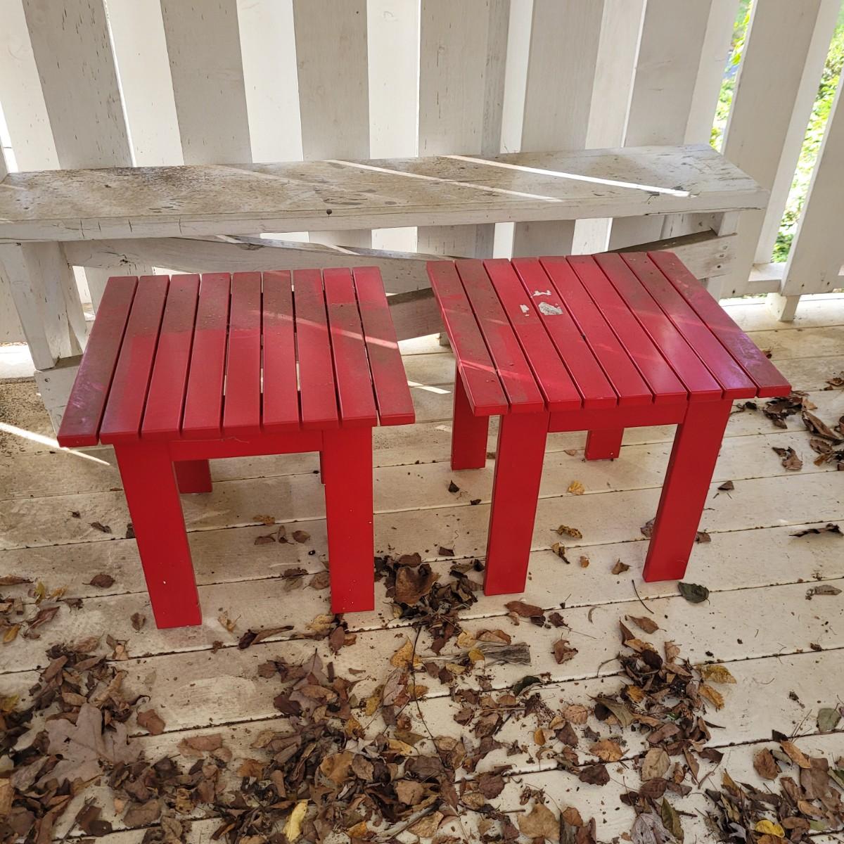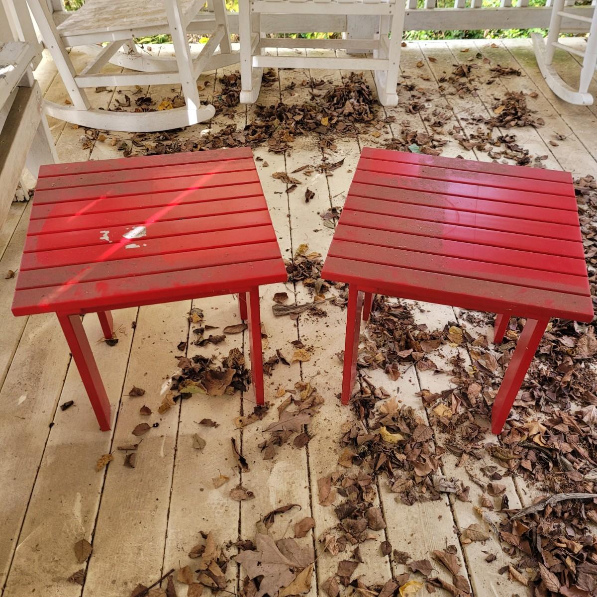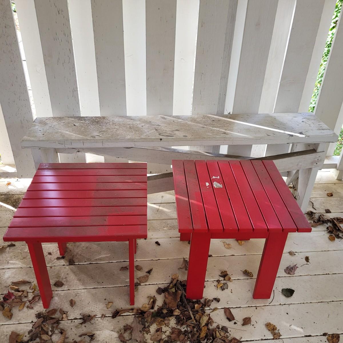 Solid wood, long farmhouse style bench and pair of red small tables, all in sturdy shape. Accumulation of dirt and fungal growth from being outside. Appears to be easily cleanable. Bench measures approximately 58"L x11.5"W x20"H. Red tables are 18”square x 17”tall. Local pickup only.