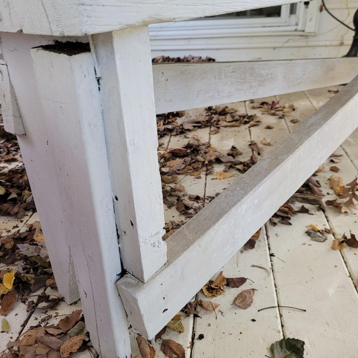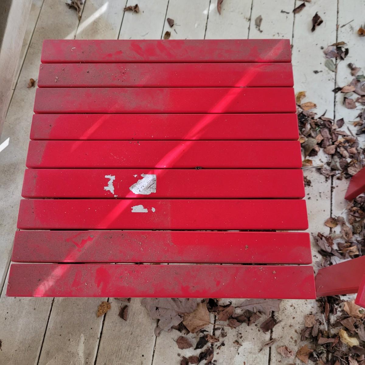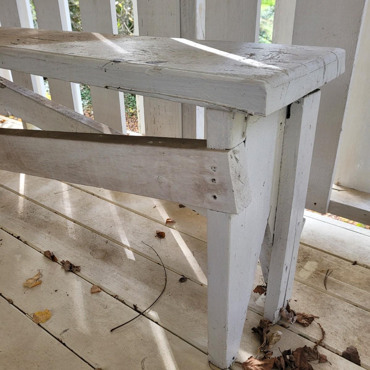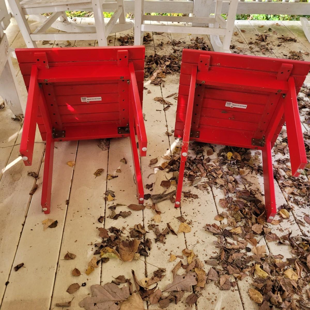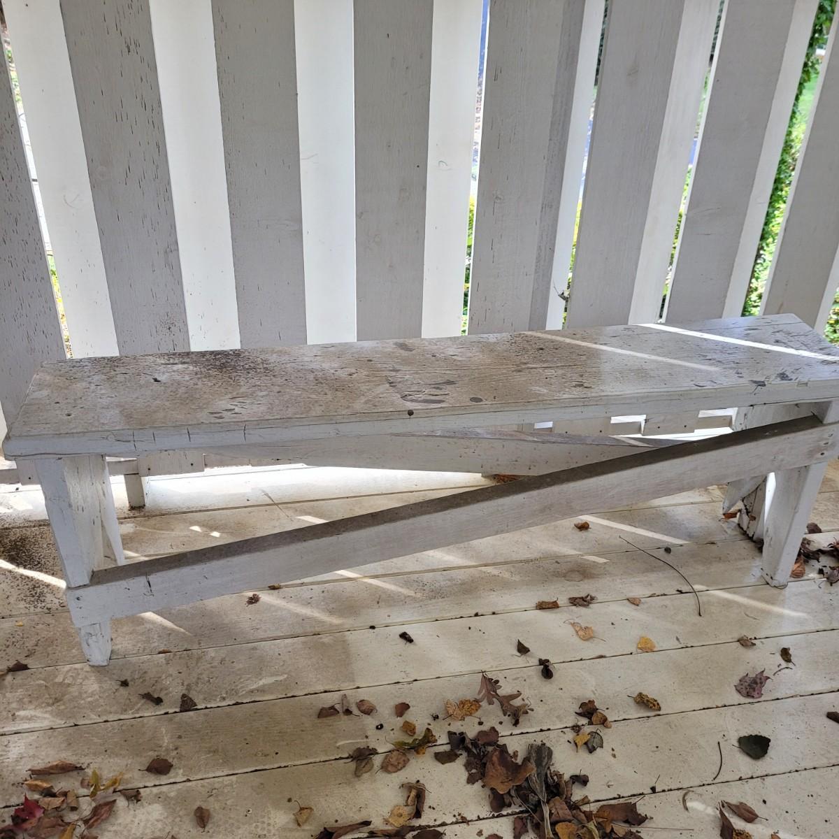 Solid wood, long farmhouse style bench and pair of red small tables, all in sturdy shape. Accumulation of dirt and fungal growth from being outside. Appears to be easily cleanable. Bench measures approximately 58"L x11.5"W x20"H. Red tables are 18”square x 17”tall. Local pickup only.