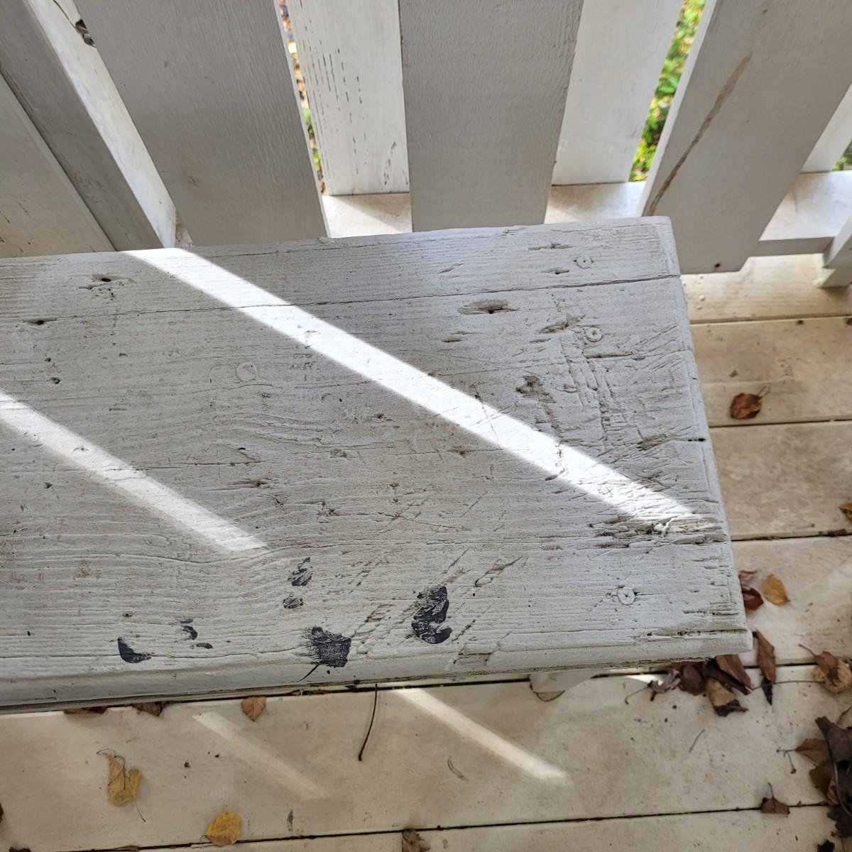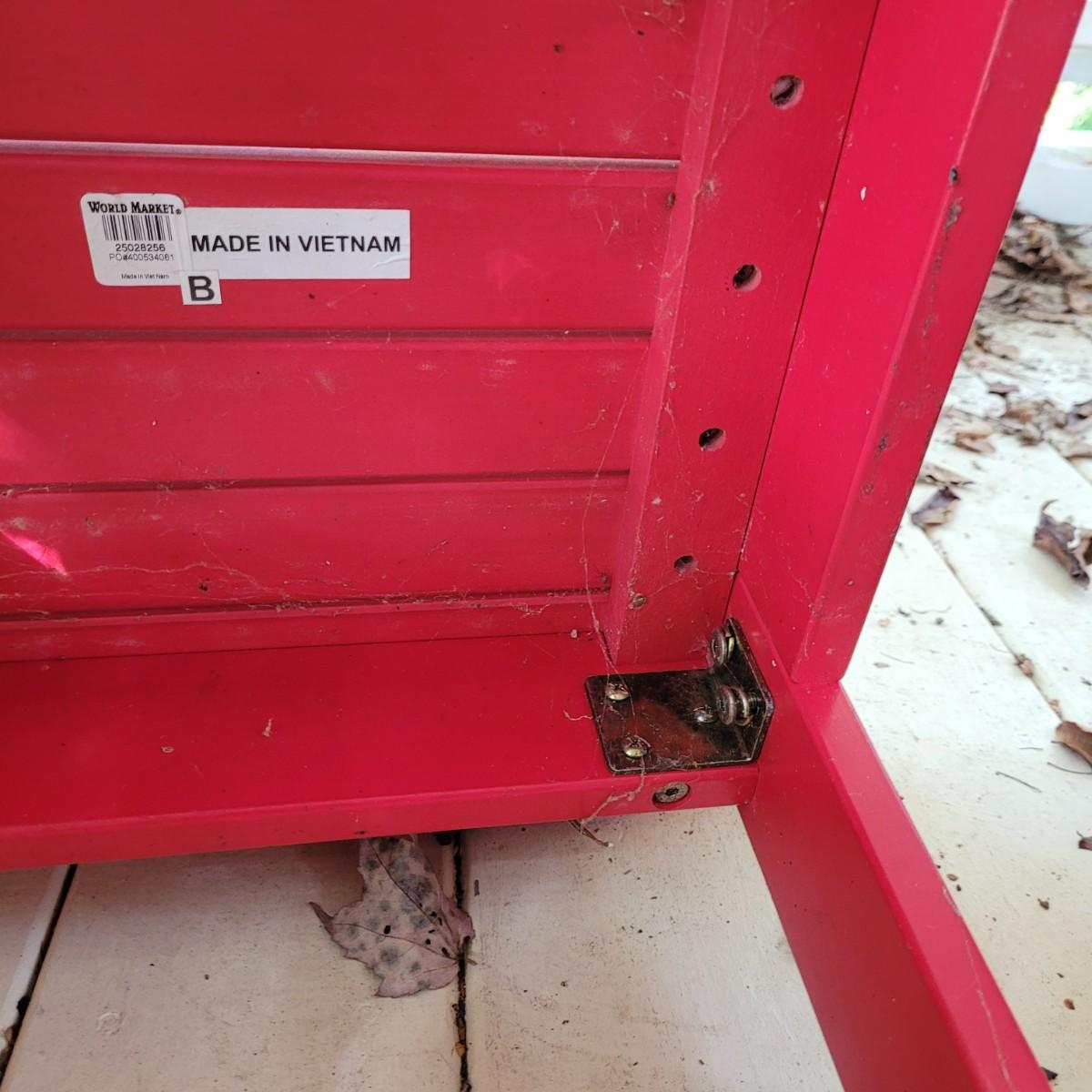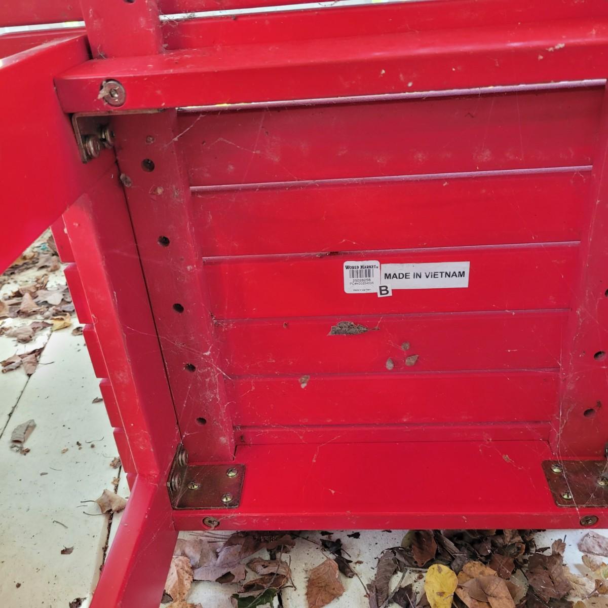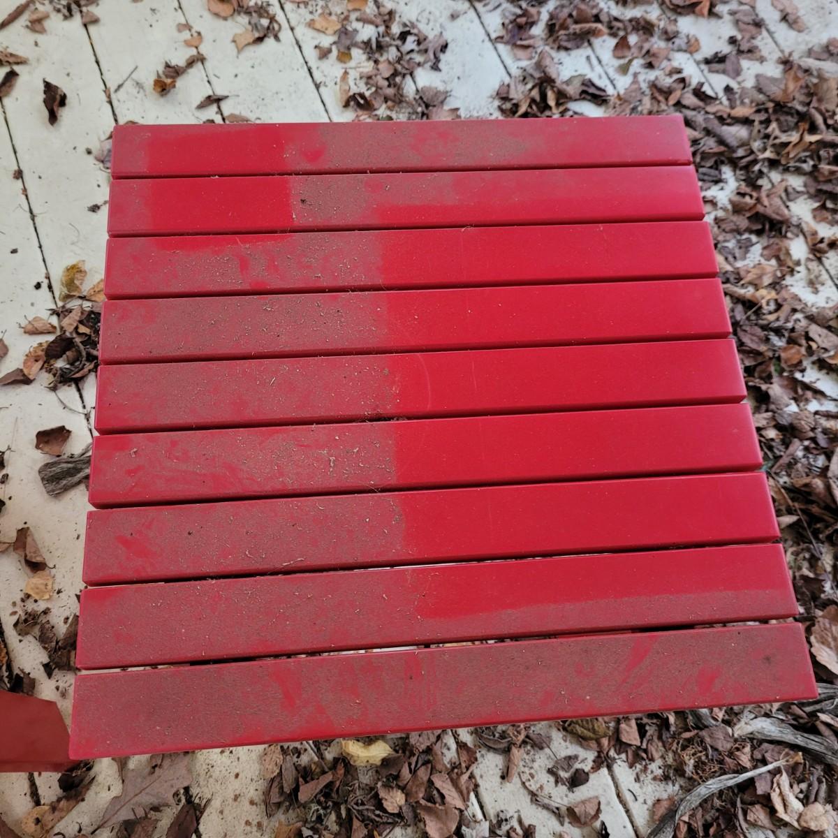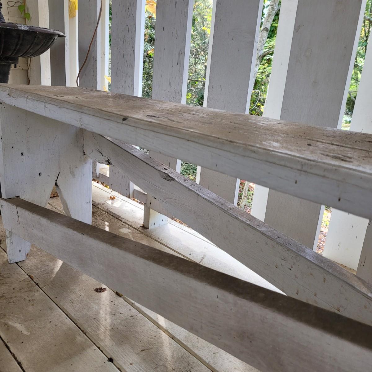 Solid wood, long farmhouse style bench and pair of red small tables, all in sturdy shape. Accumulation of dirt and fungal growth from being outside. Appears to be easily cleanable. Bench measures approximately 58"L x11.5"W x20"H. Red tables are 18”square x 17”tall. Local pickup only.