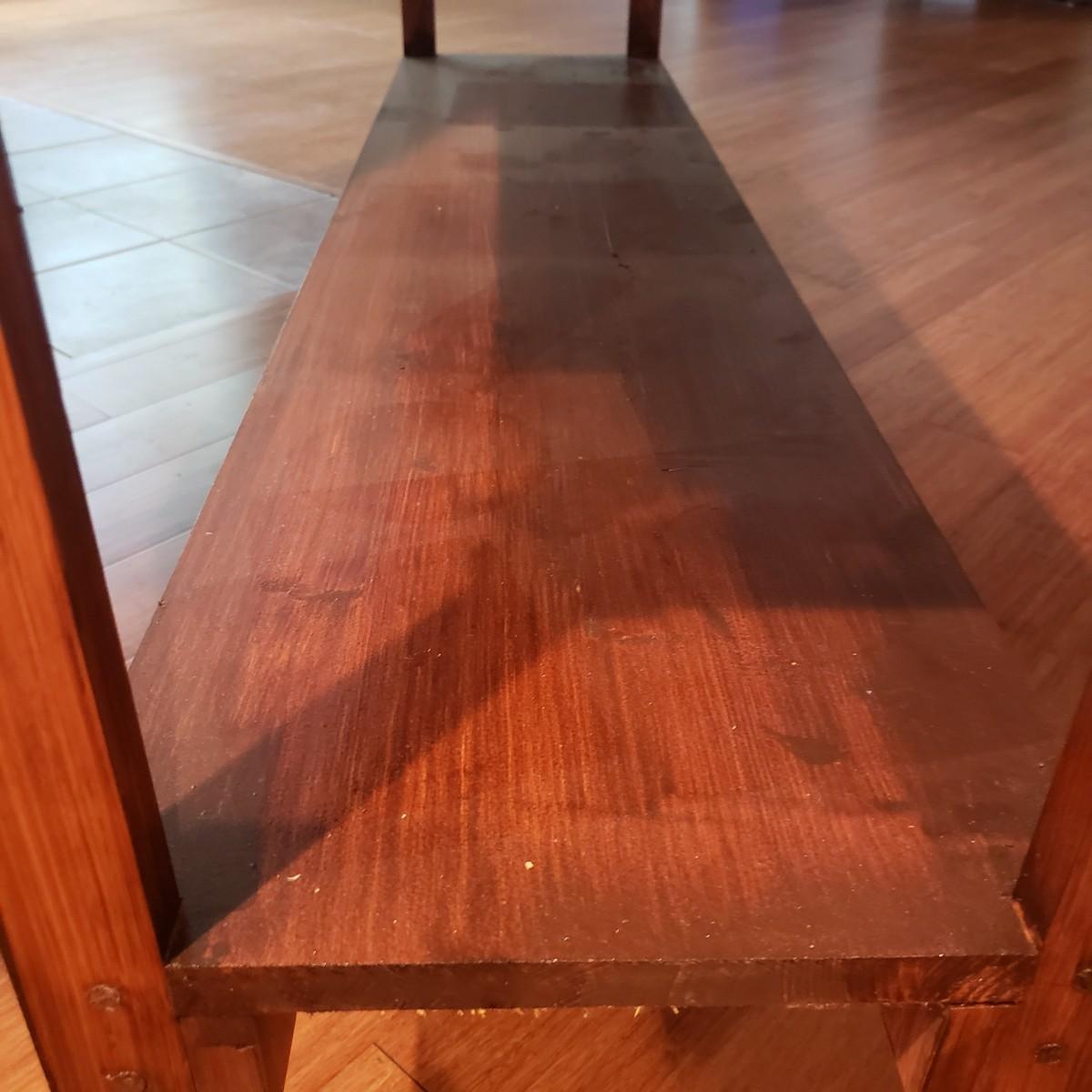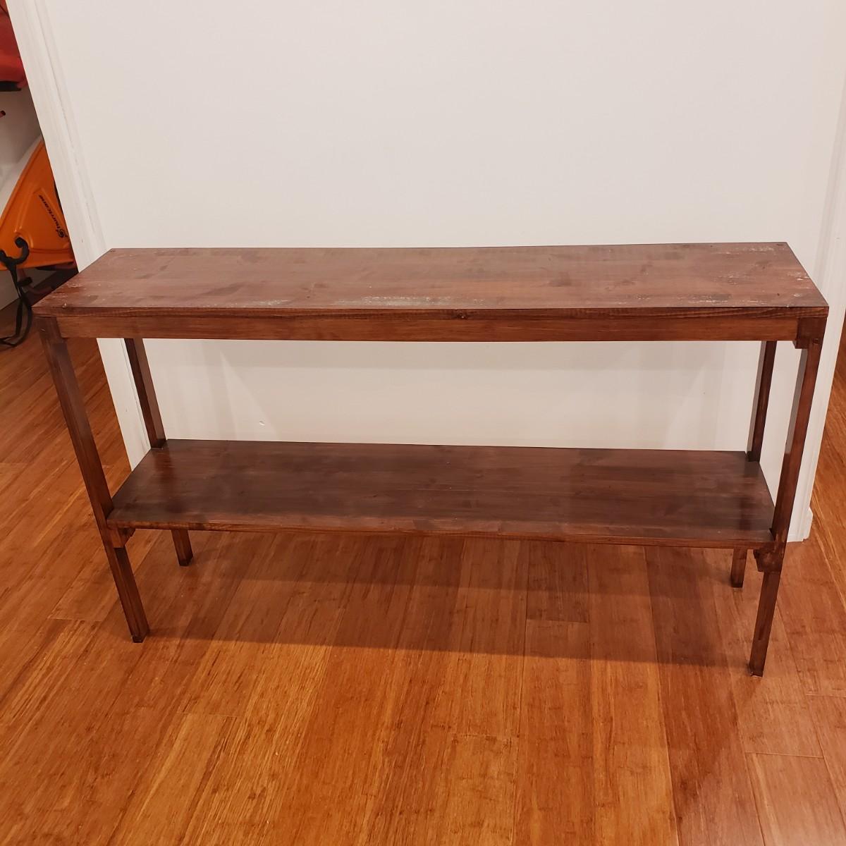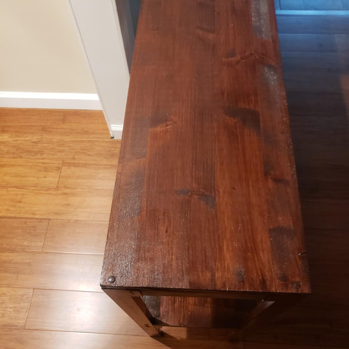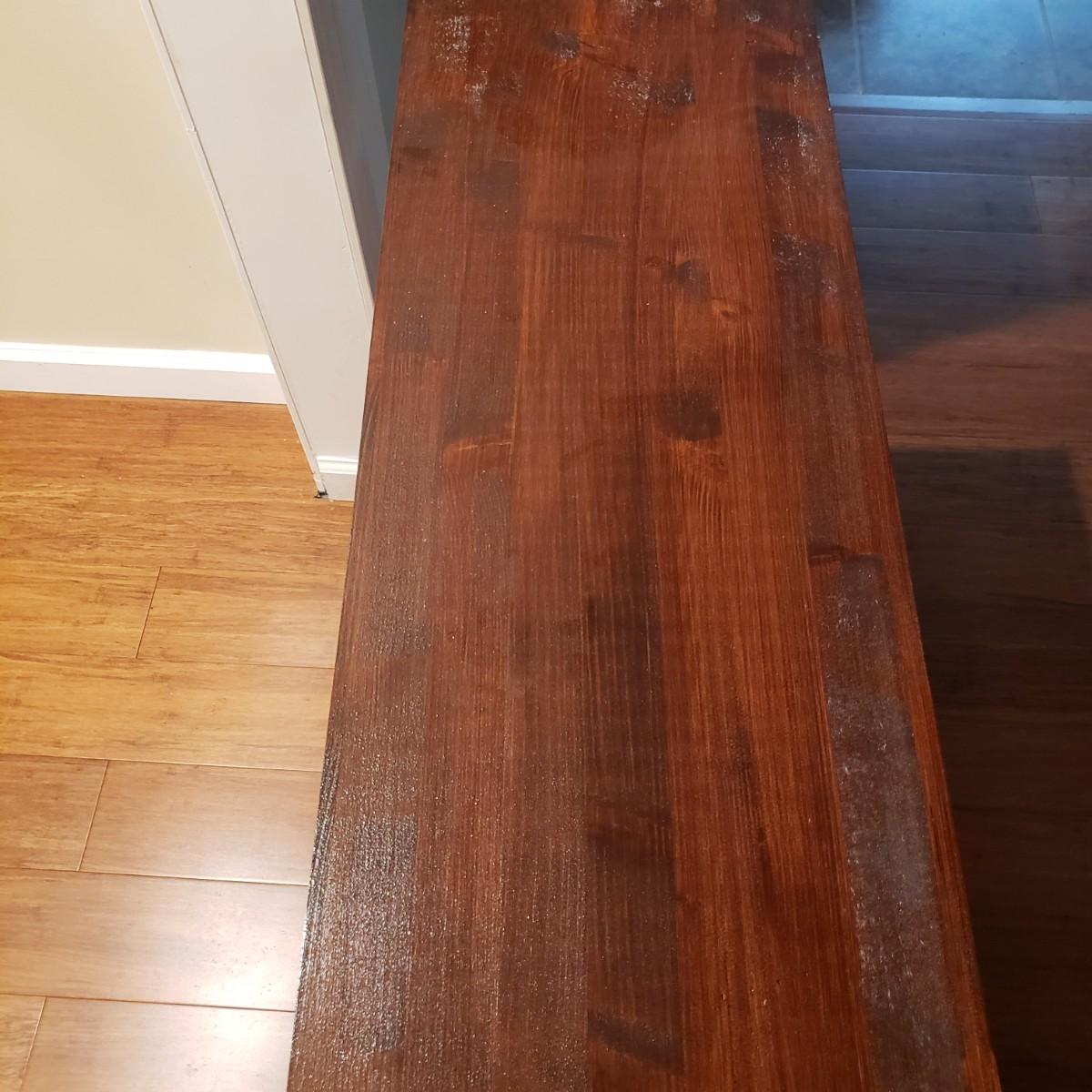 This handmade console table measures 50" x 12" x 30"H. The finish has a rough feel to it. What appears to look like tape residue, is just a rough feel and not sticky. Table is light weight.
