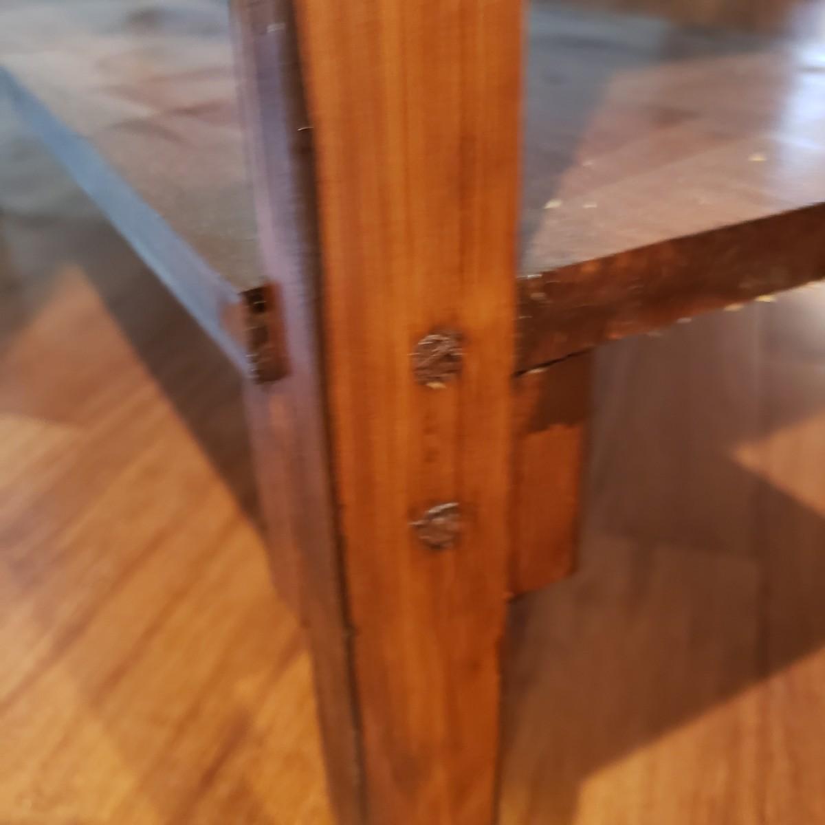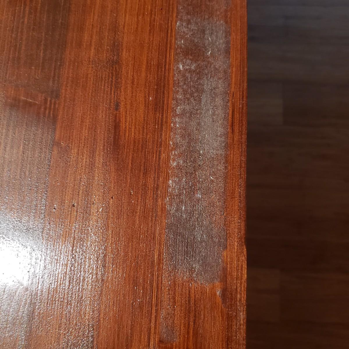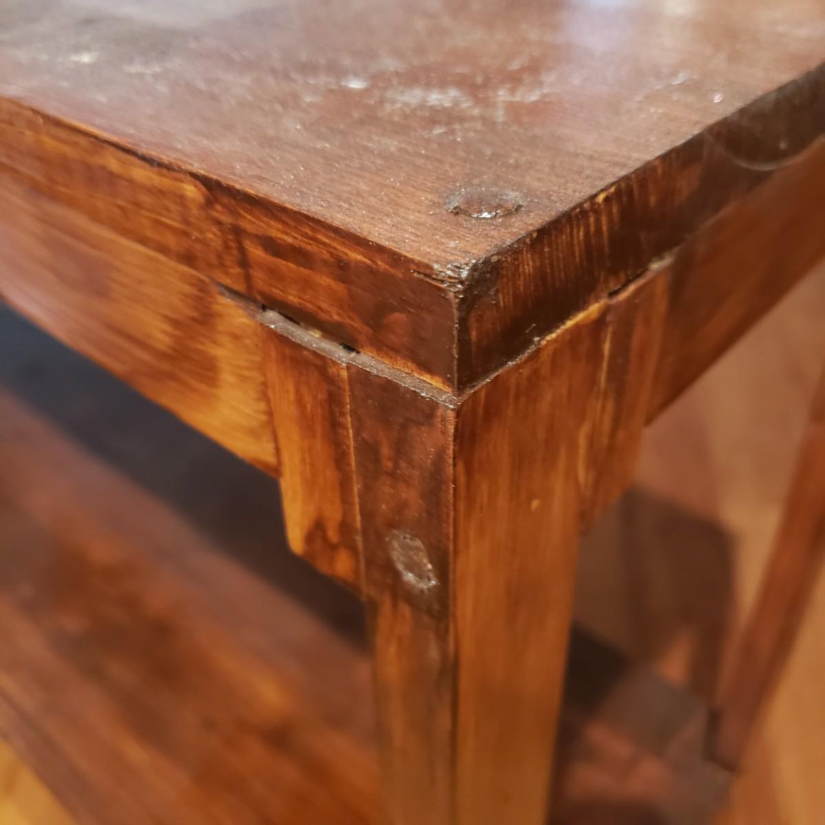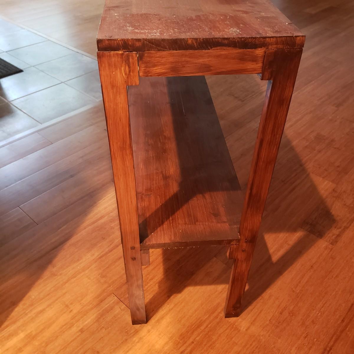 This handmade console table measures 50" x 12" x 30"H. The finish has a rough feel to it. What appears to look like tape residue, is just a rough feel and not sticky. Table is light weight.