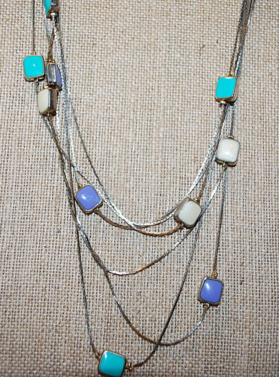 Long Wrap-Around Necklace with Double-Sided Lavender, Aquamarine & White Ceramic Squares on Silver Tone Chain and Lobster Clasp 40" L