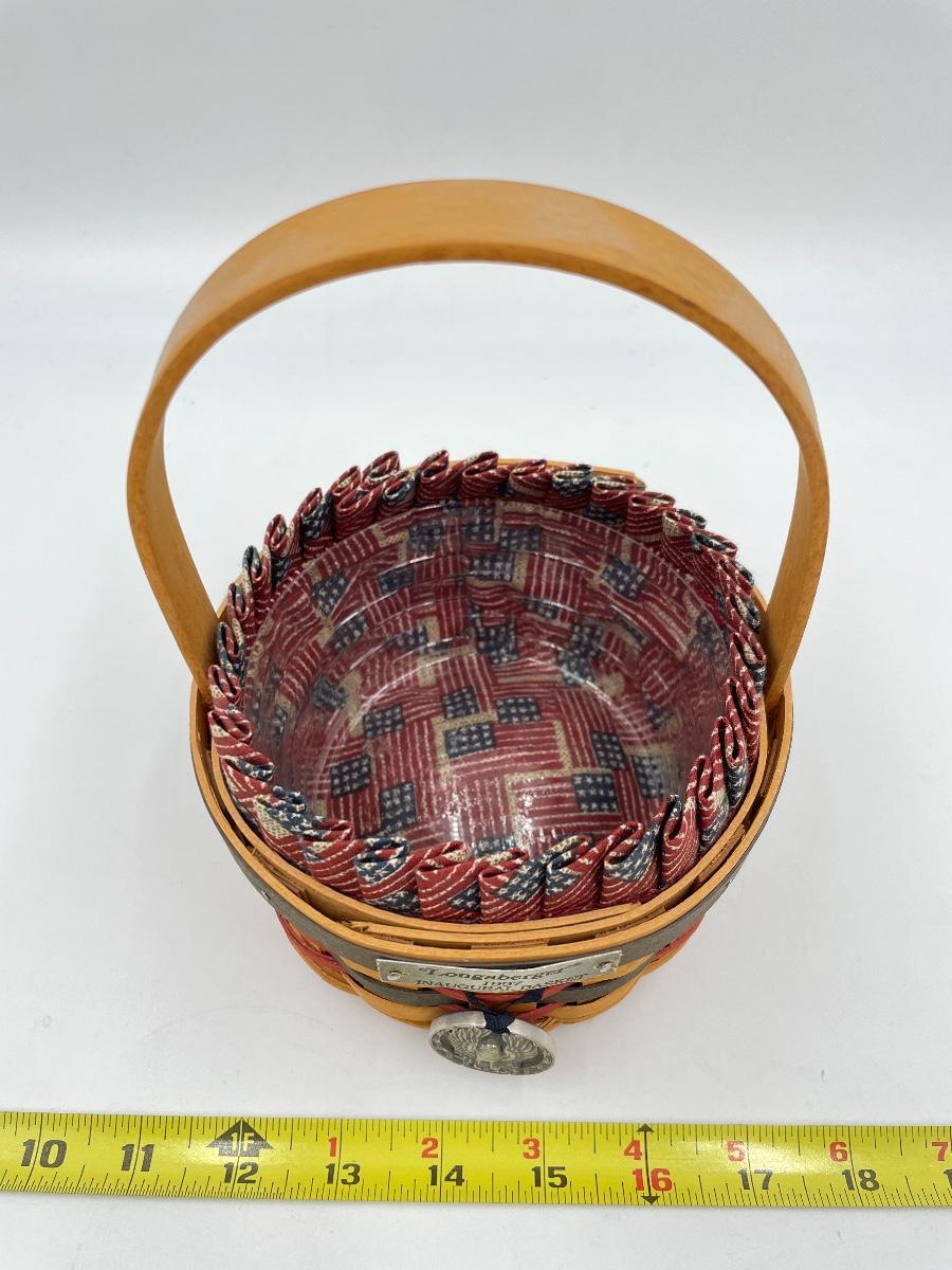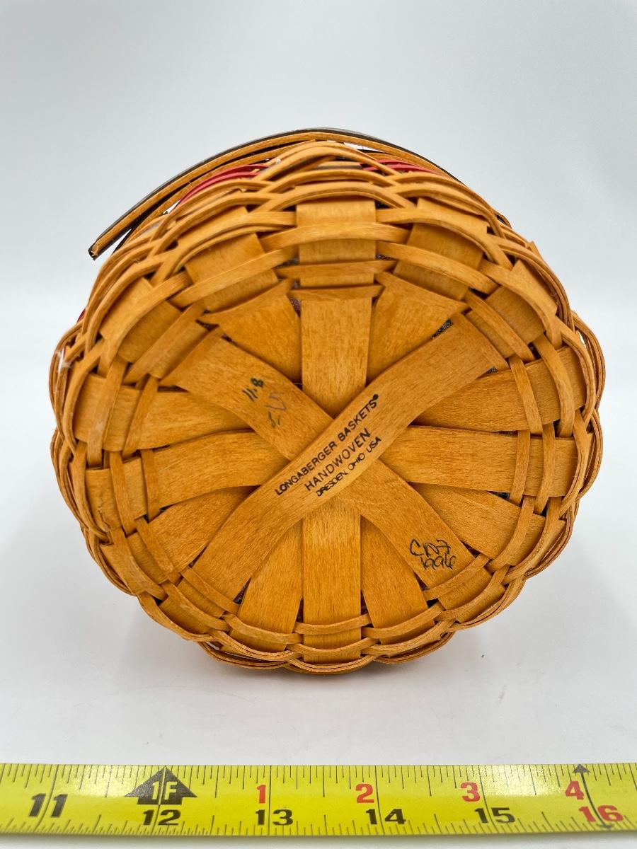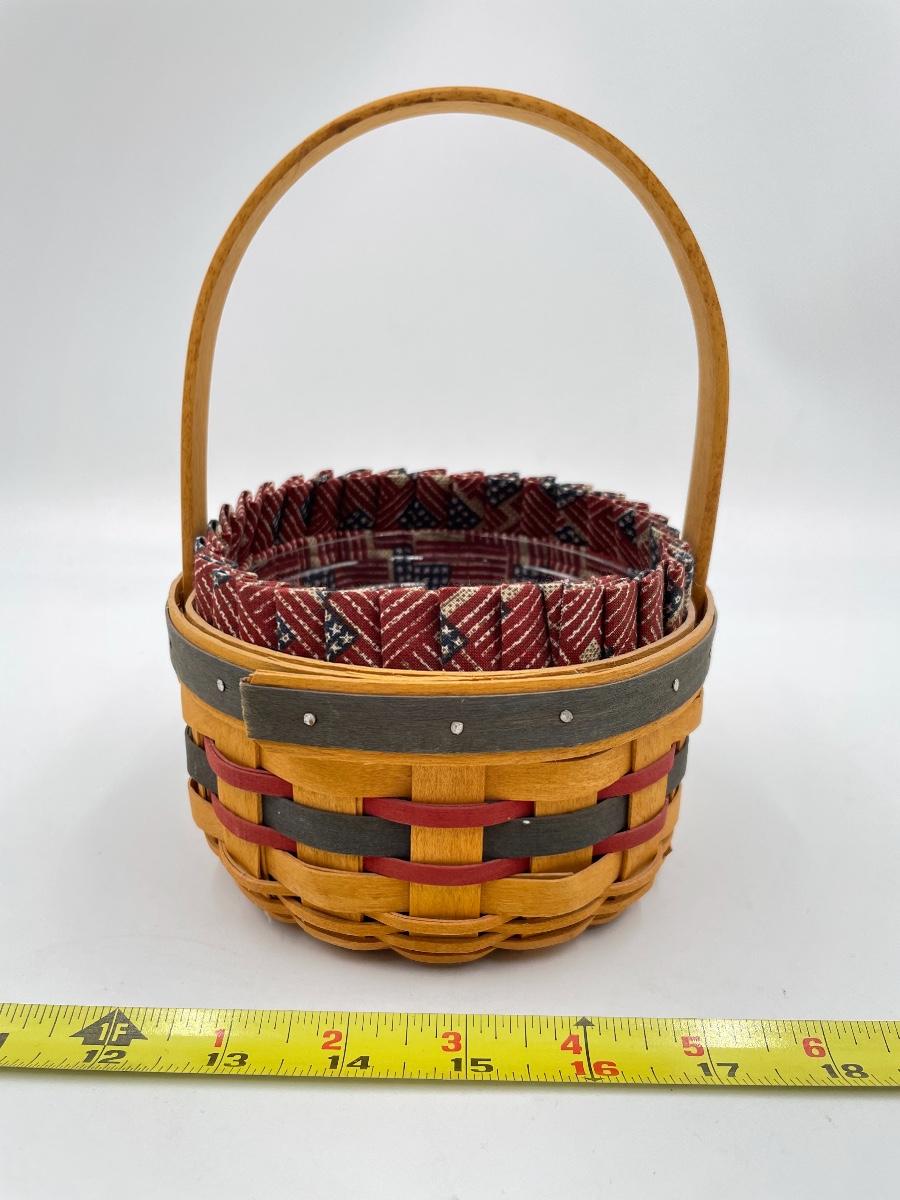 In good condition, includes fabric and plastic liner. Measures approx 5.5” in diameter and 3.5” tall (not including handle).