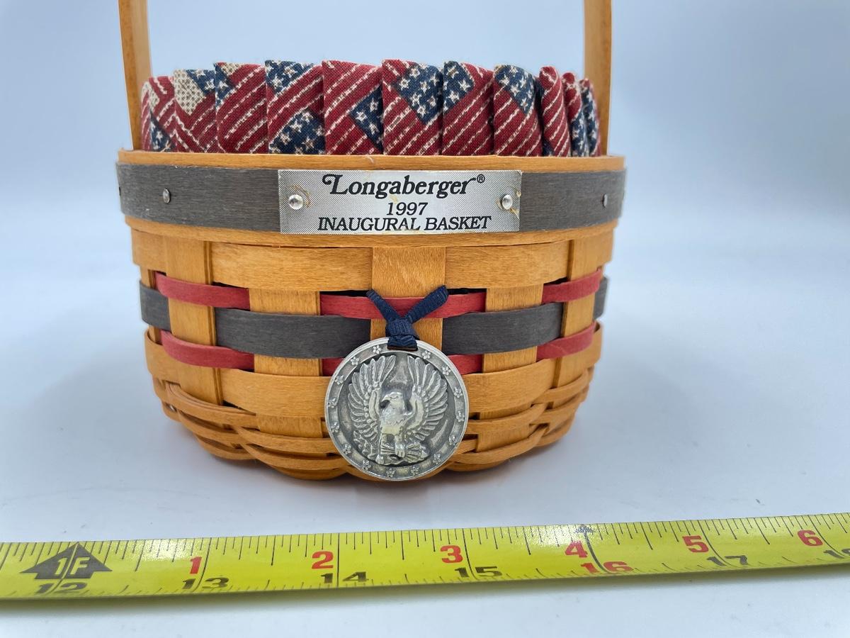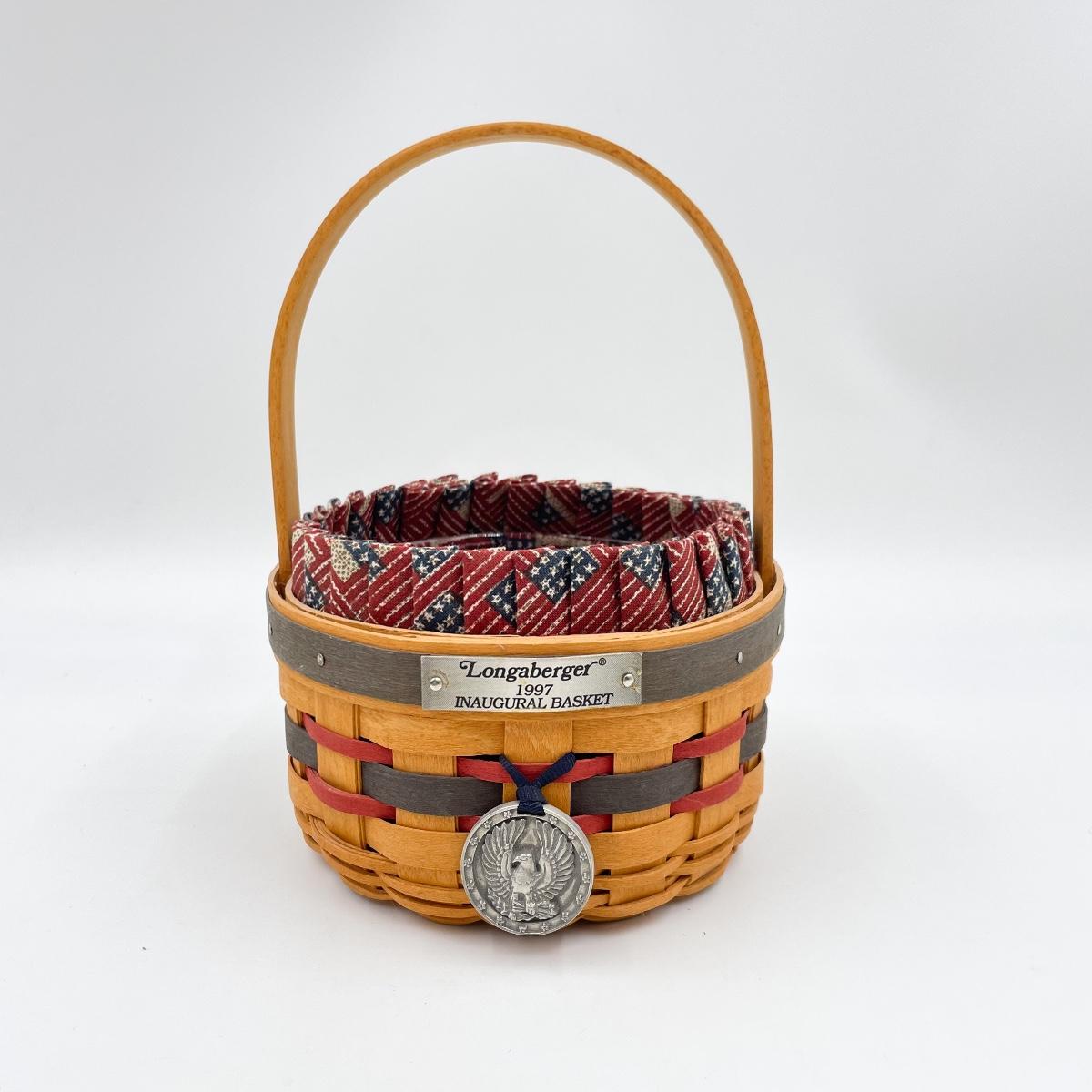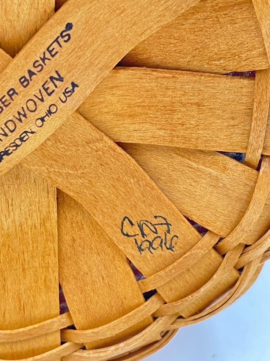 In good condition, includes fabric and plastic liner. Measures approx 5.5” in diameter and 3.5” tall (not including handle).