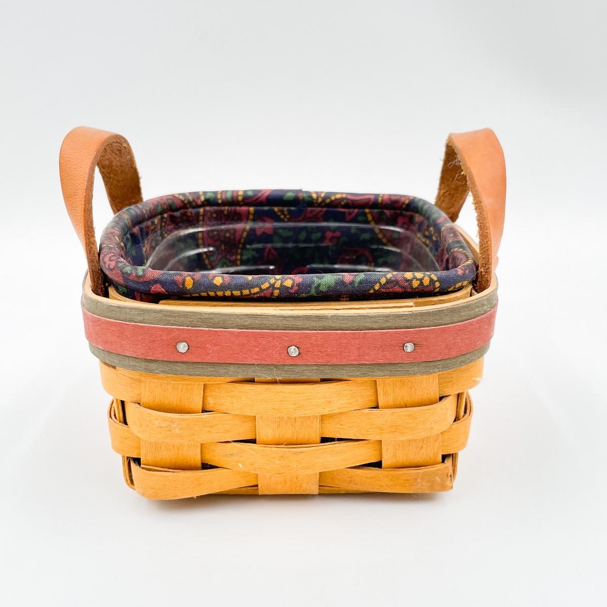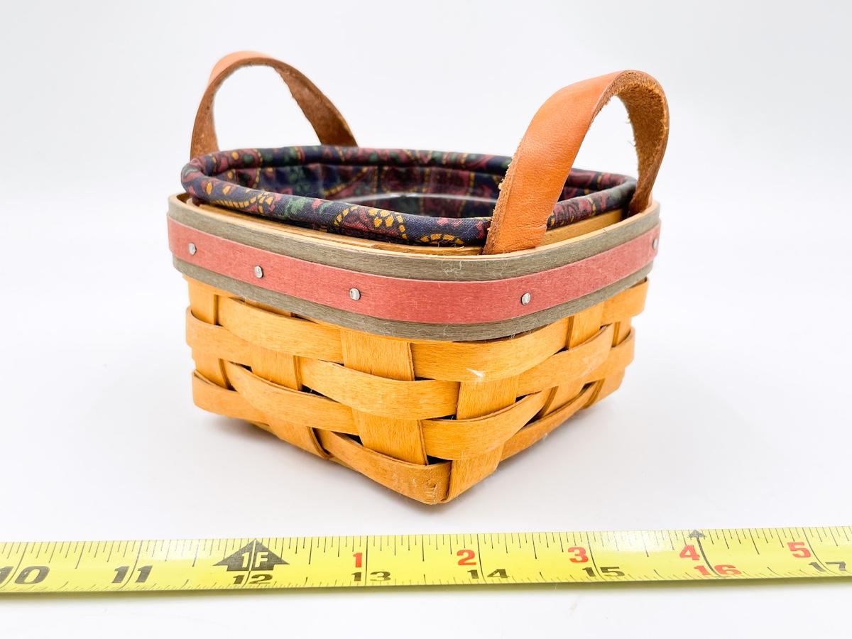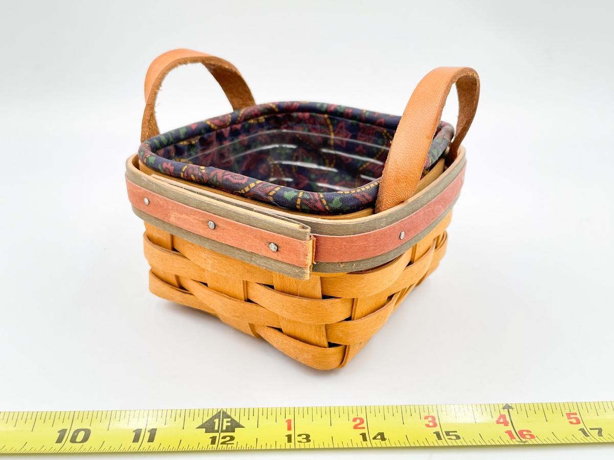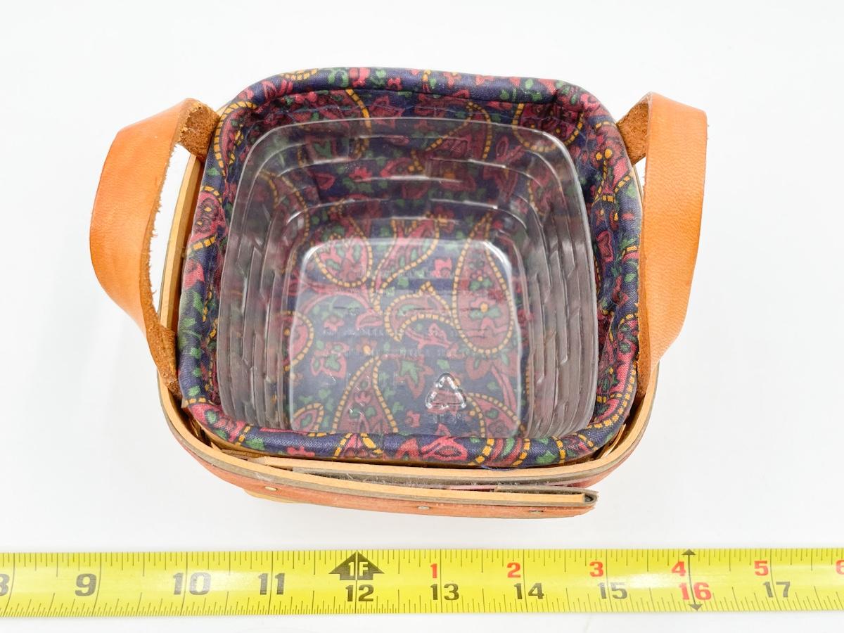 In good condition, includes fabric and plastic liner. Measures approx 5” square x 3” tall (not including handle).