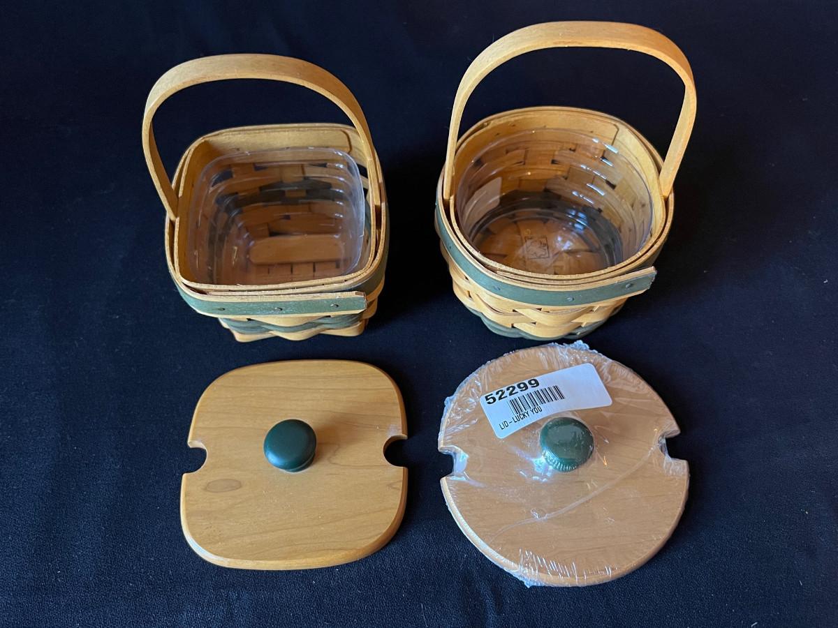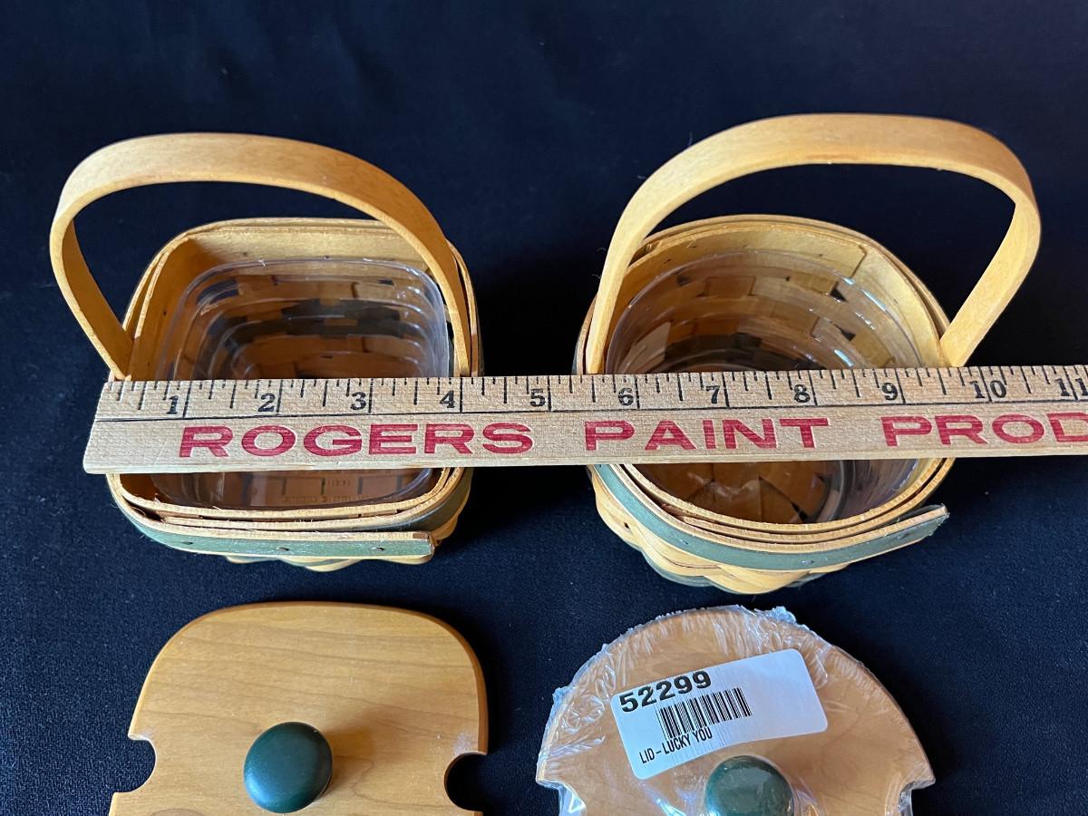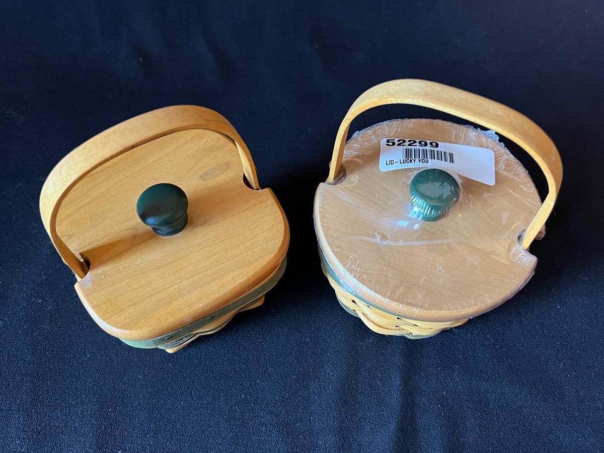 Pair of small Longaberger "Lucky" baskets - both with lids and plastic inserts - one still in original plastic. Each - 4" diameter, 6 1/2" h including handle.