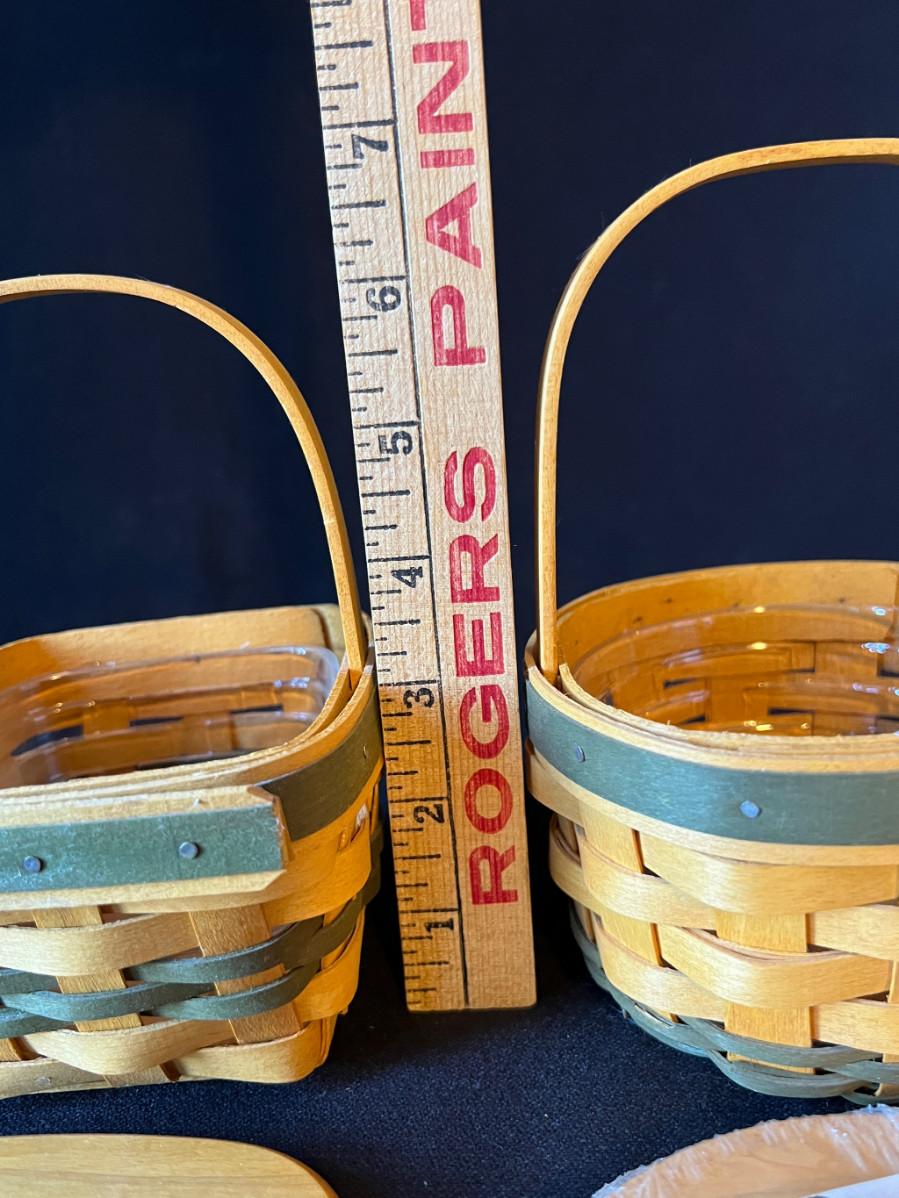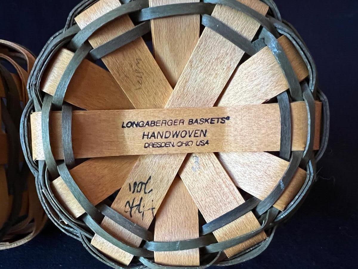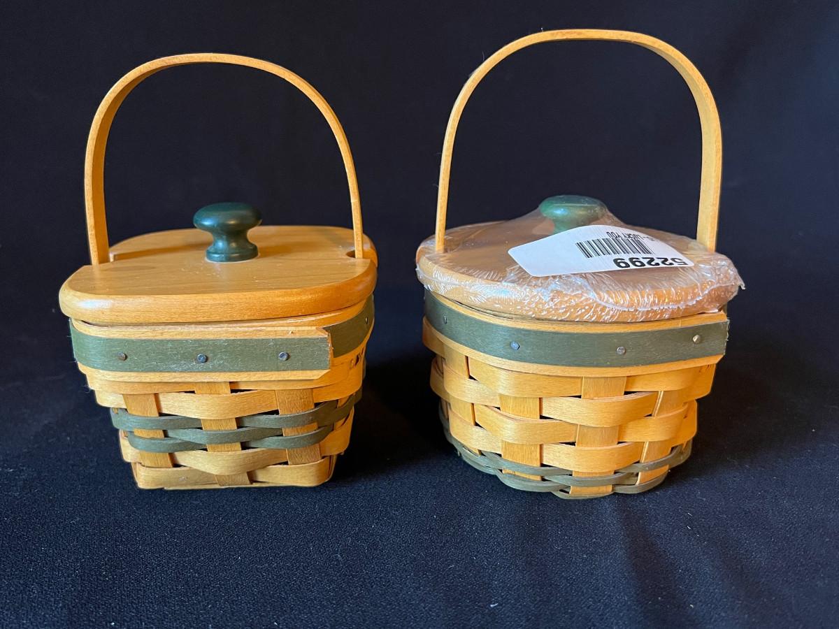 Pair of small Longaberger "Lucky" baskets - both with lids and plastic inserts - one still in original plastic. Each - 4" diameter, 6 1/2" h including handle.