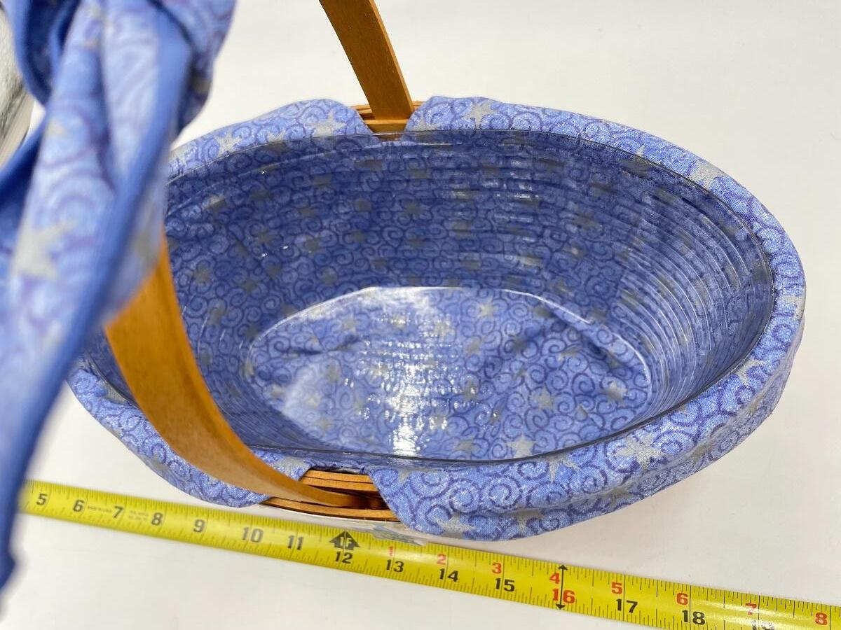 In good condition, includes fabric and plastic liner. Measures approx 10.5” x 6.5” x 11.5” tall (including handle).