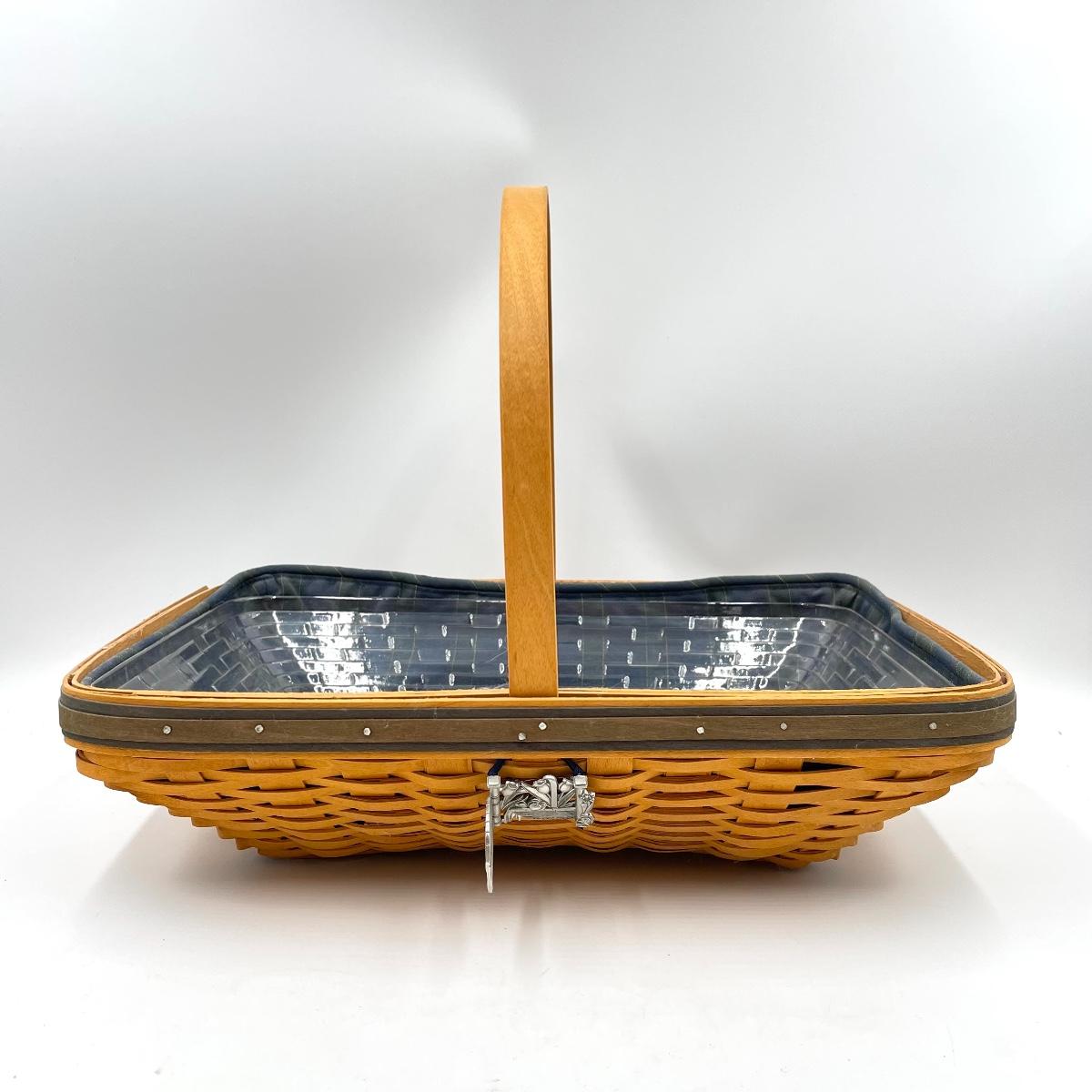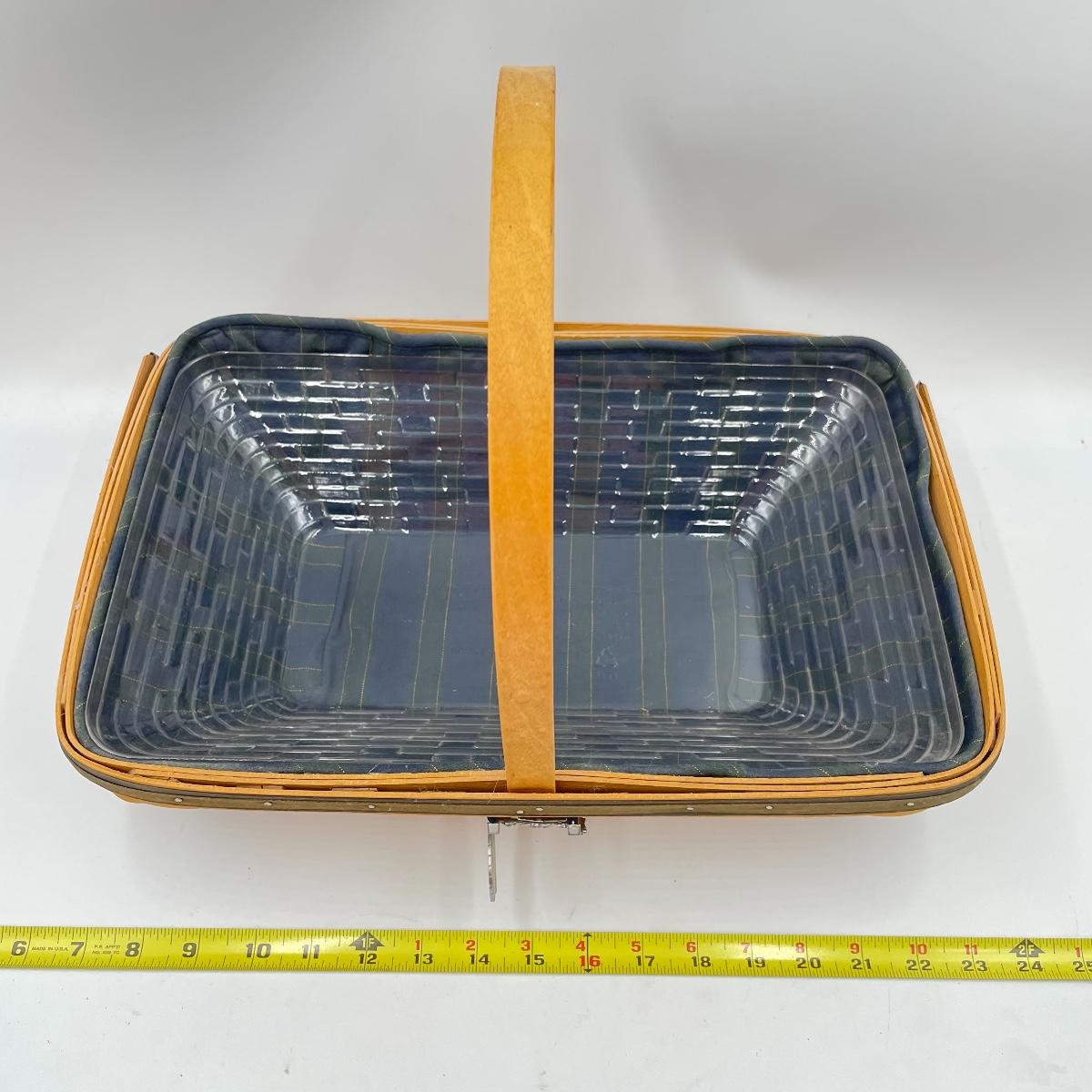 In good condition, includes fabric and plastic liner. Measures approx 10.5” x 16” x 4” tall (not including handle).