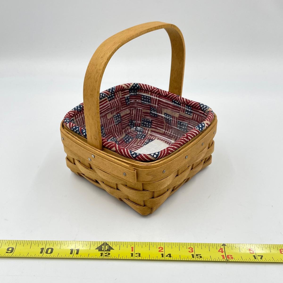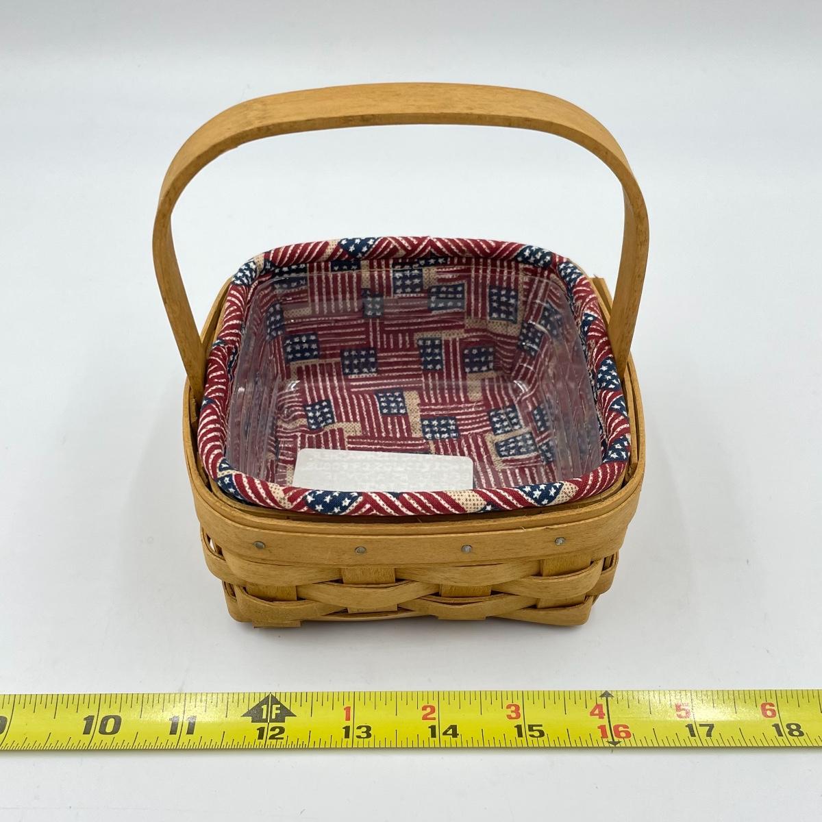 In good condition, includes fabric and plastic liner. Measures approx 6” square x 3” tall.
